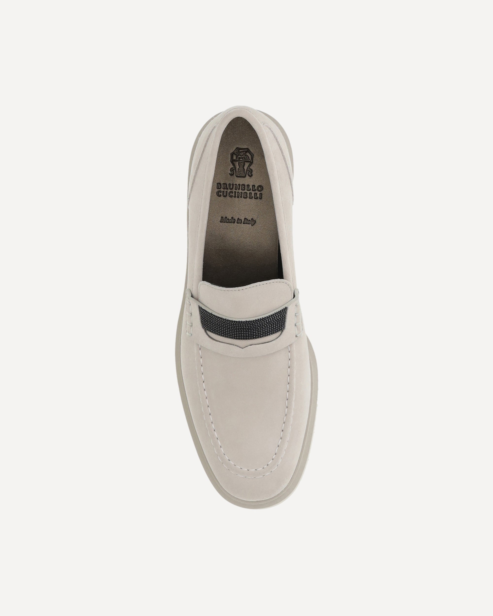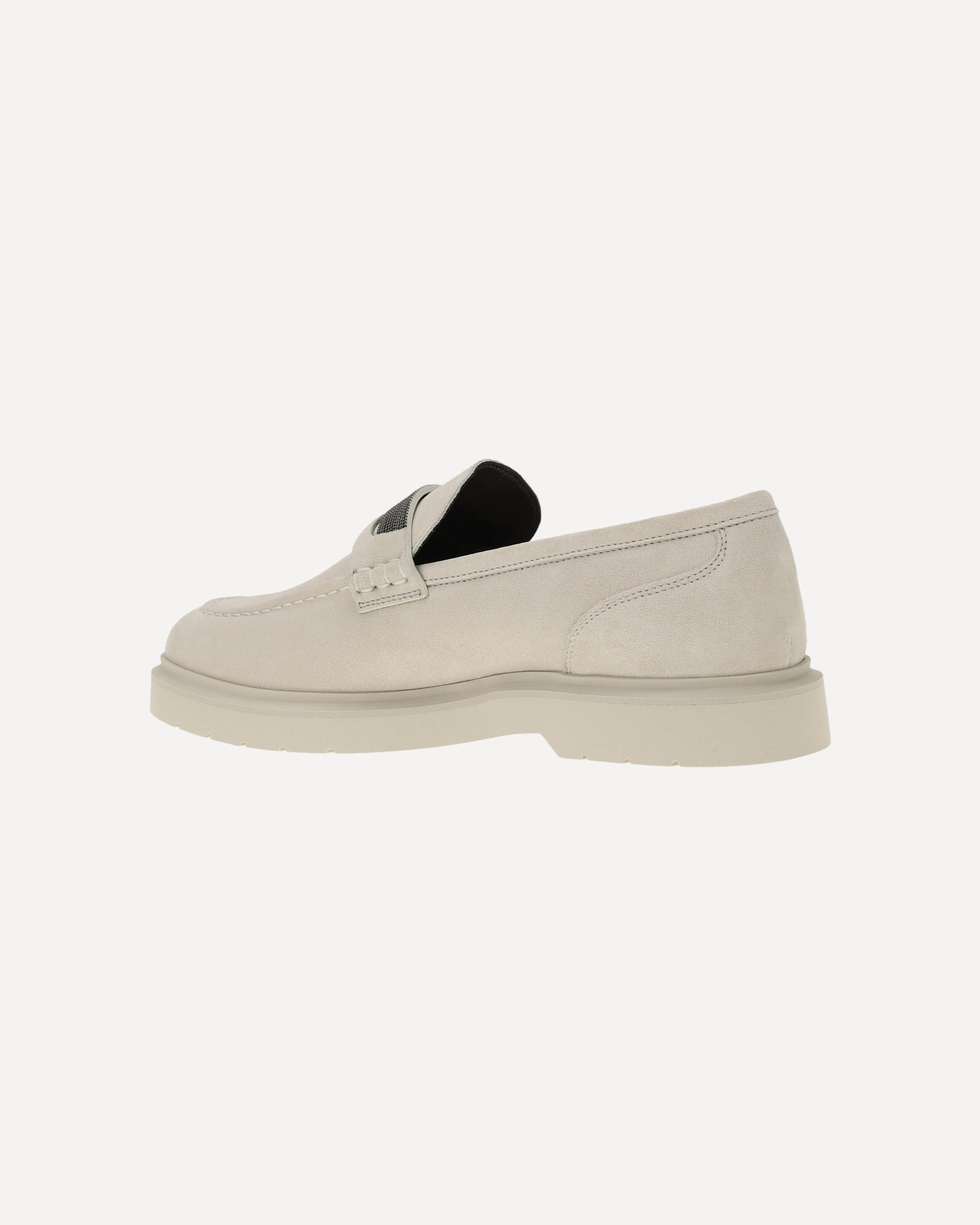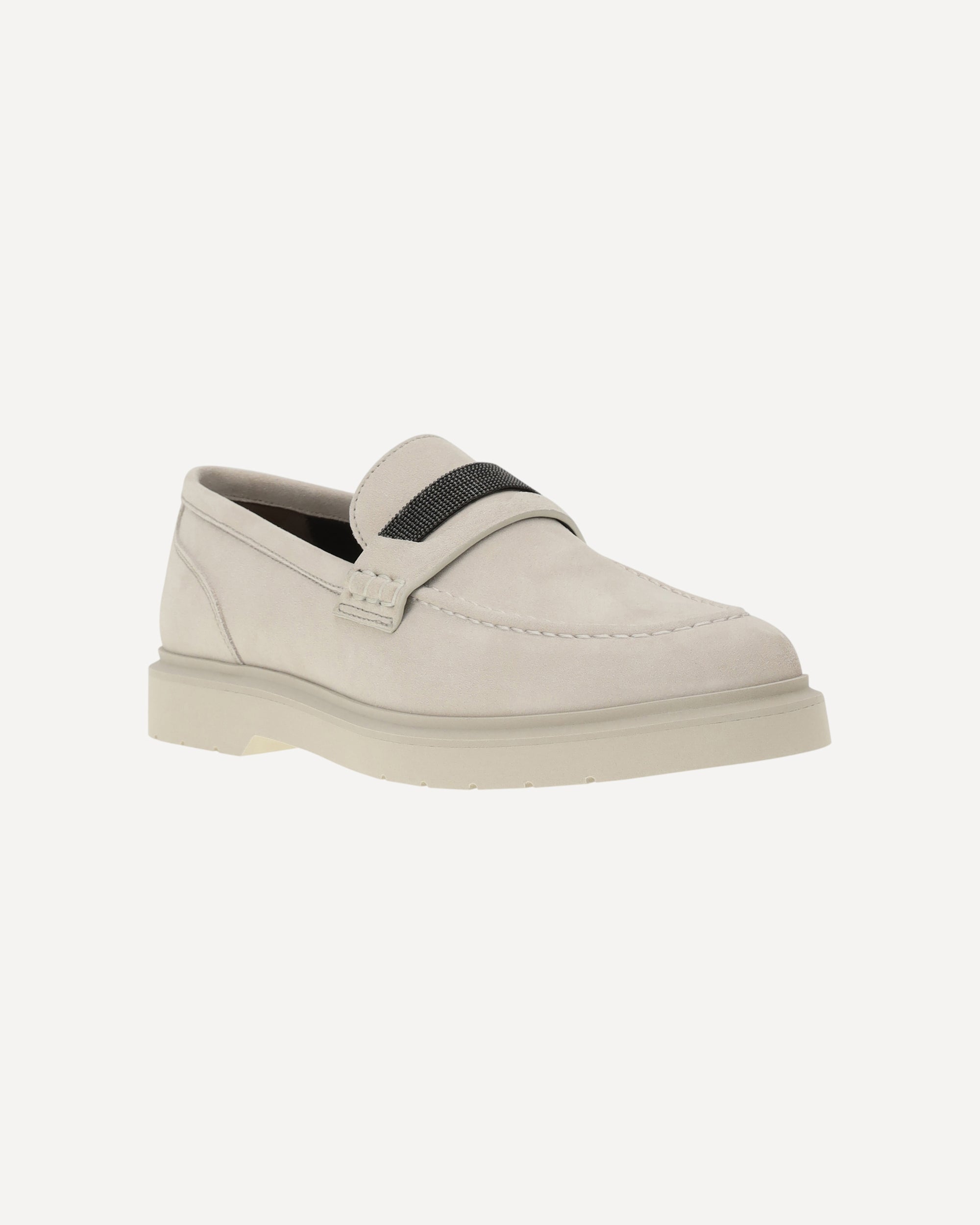 The leather Loafers by Brunello Cucinelli feature an almond toe on the front, giving them an elegant and refined touch. The suede design lends a soft, sophisticated look, while the front tray is decorated with the brand's iconic jewels, a distinctive luxury detail. Matching all-over stitching adds an element of precision craftsmanship, while the press-stamped logo insole completes the look with a sign of authenticity. A pair of loafers that combines comfort, style and high quality.