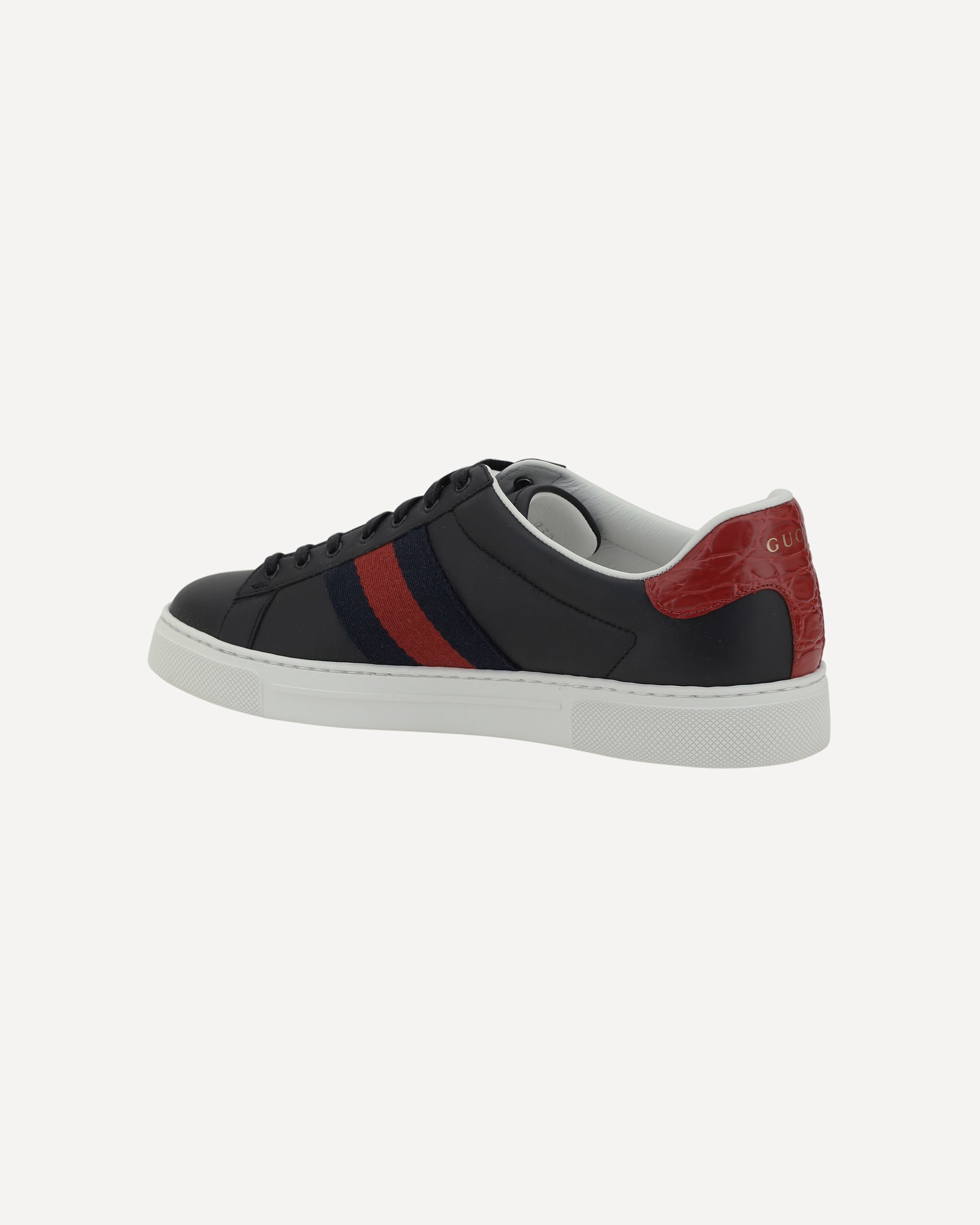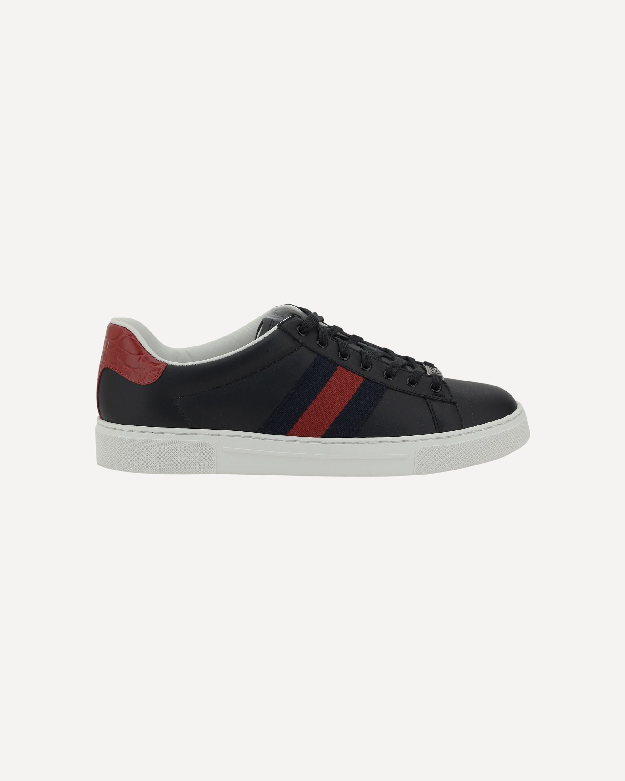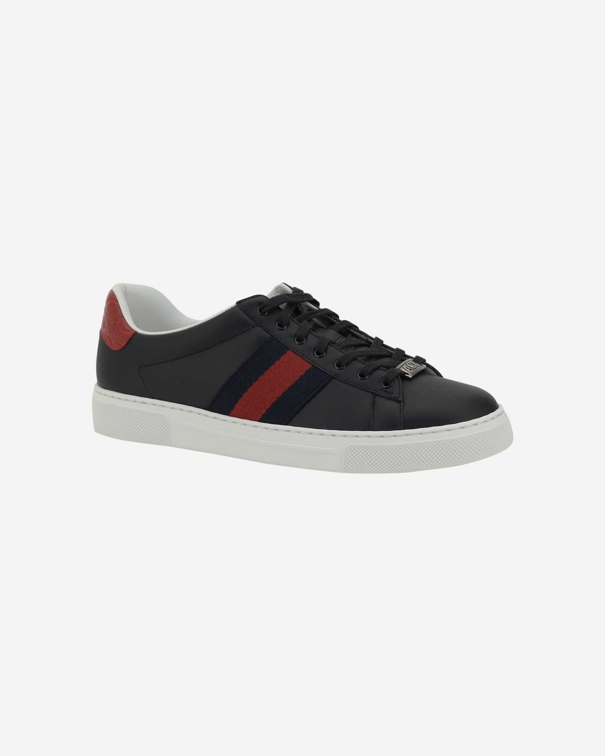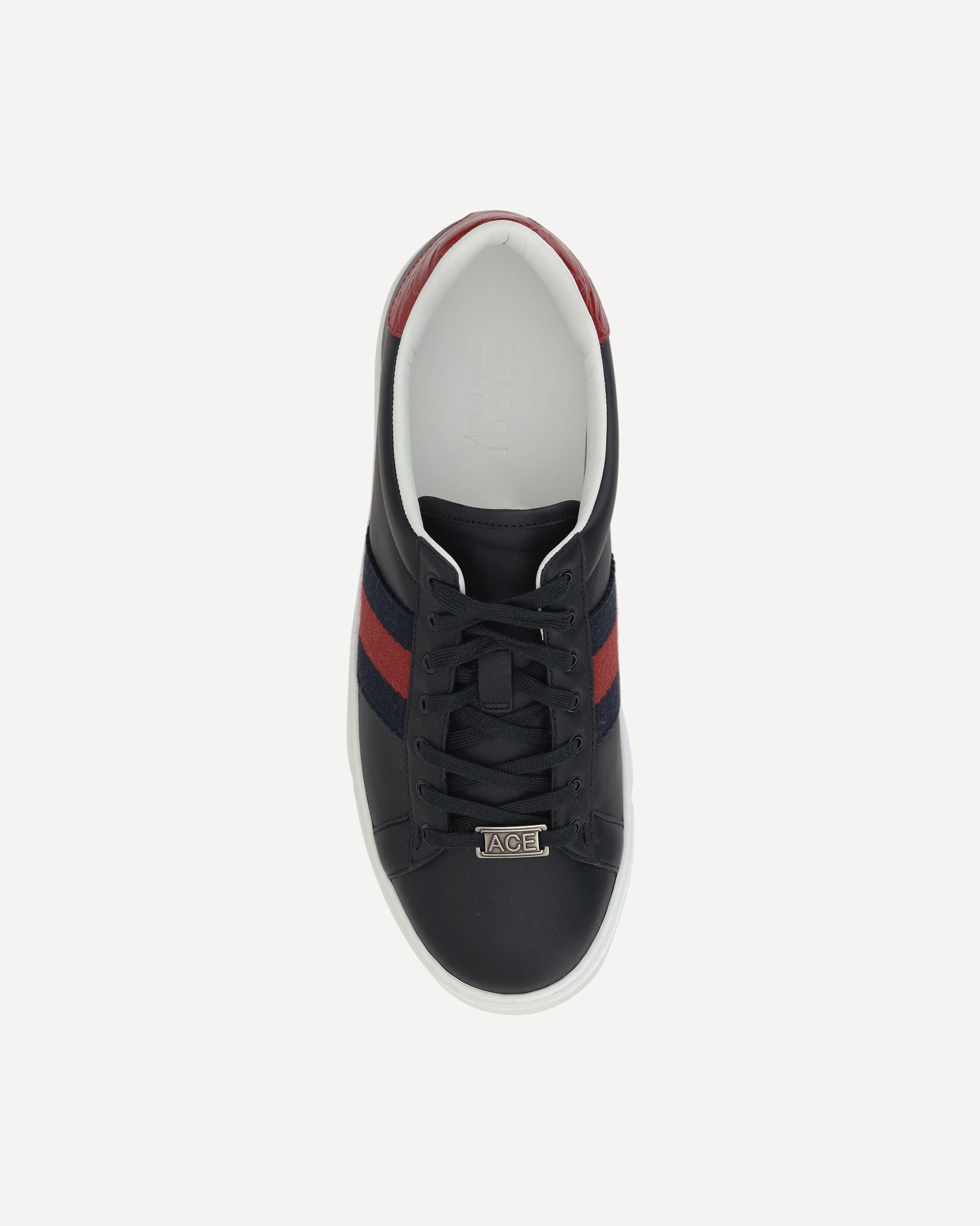 Leather Sneakers by Gucci feature a front closure via laces for an adjustable and secure fit, with a round toe for comfort. The flat sole offers stability and a modern look. A contrasting logo detail on the back adds a distinctive touch, while iconic slanted bands on the side panels recall the brand's aesthetic. The brand's press-stamped monogram on the front tongue underscores authenticity, and the branded insole completes the design with an additional sign of exclusivity.