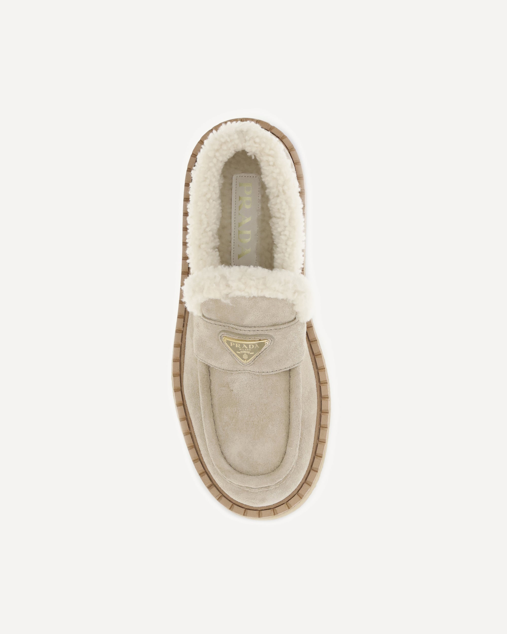 Suede Loafers by Prada combine comfort and style in a bold design. Featuring a platform sole and round toe, they feature a soft shearling-lined interior for a snug fit. The upper tray is embellished with the iconic triangular plaque, the house's signature symbol.