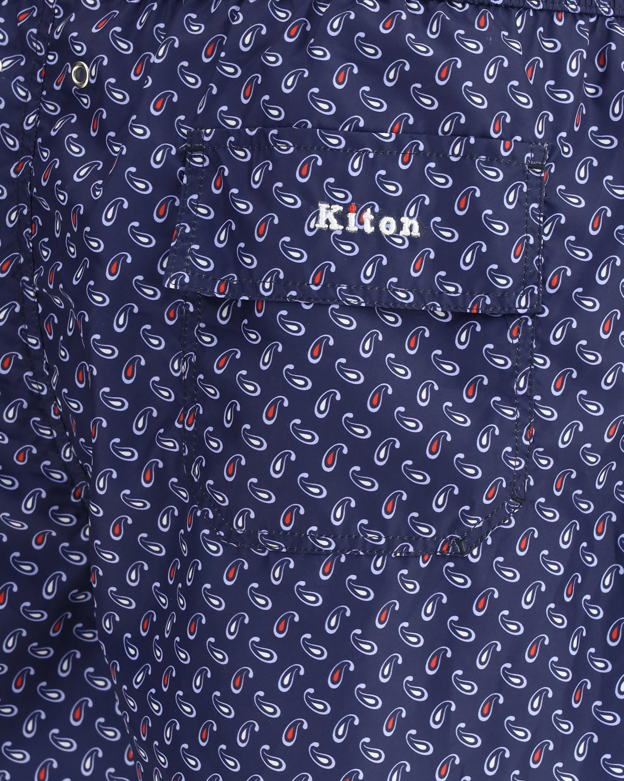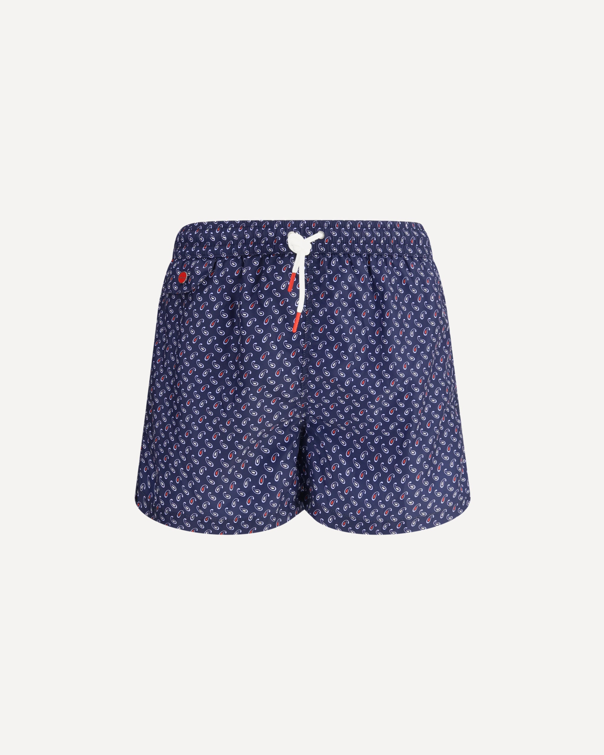 Kiton's Swimshorts is a refined and practical garment designed for those seeking elegance even on casual occasions. The adjustable elastic waistband with drawstring ensures a customized fit, while the side welt pockets are ideal for storing small items. The flap patch welt pocket on the back, decorated with the brand's iconic embroidered monogram, adds a distinctive and luxurious detail. The flap patch pocket on the front completes the practical and stylish design. The contrasting all-over repeated drop effect pattern gives the swimsuit a dynamic and modern look, combining comfort and sophistication.
