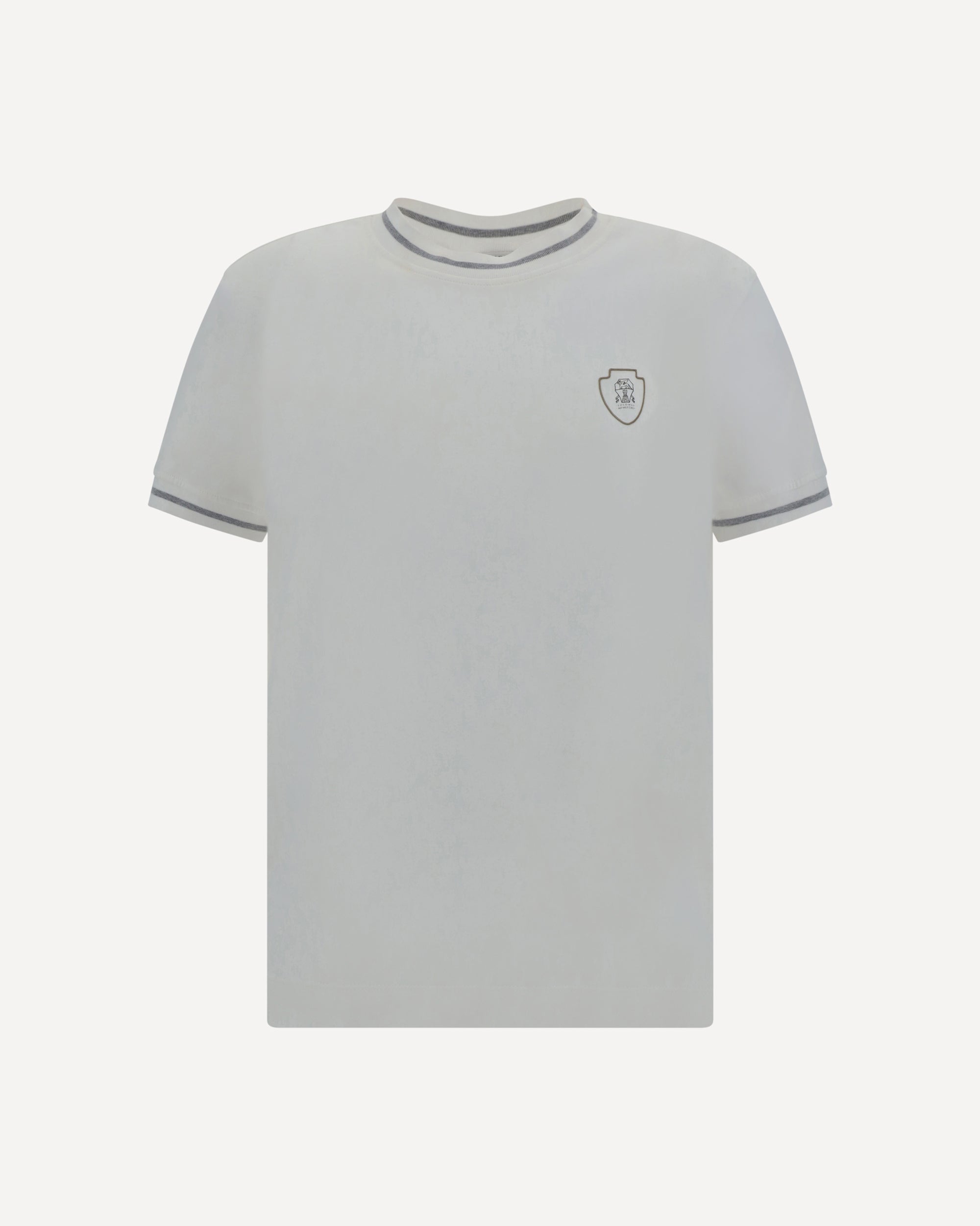 The Brunello Cucinelli cotton T-Shirt is an elegant and versatile piece, featuring a ribbed crew neck that adds a classic touch. The iconic contrasting brand monogram on the front adds a distinctive and luxurious detail. The side slits and monochrome pattern complete the design, giving the T-shirt a clean and refined look. The regular fit ensures comfort and practicality, making this piece ideal for casual yet sophisticated looks.