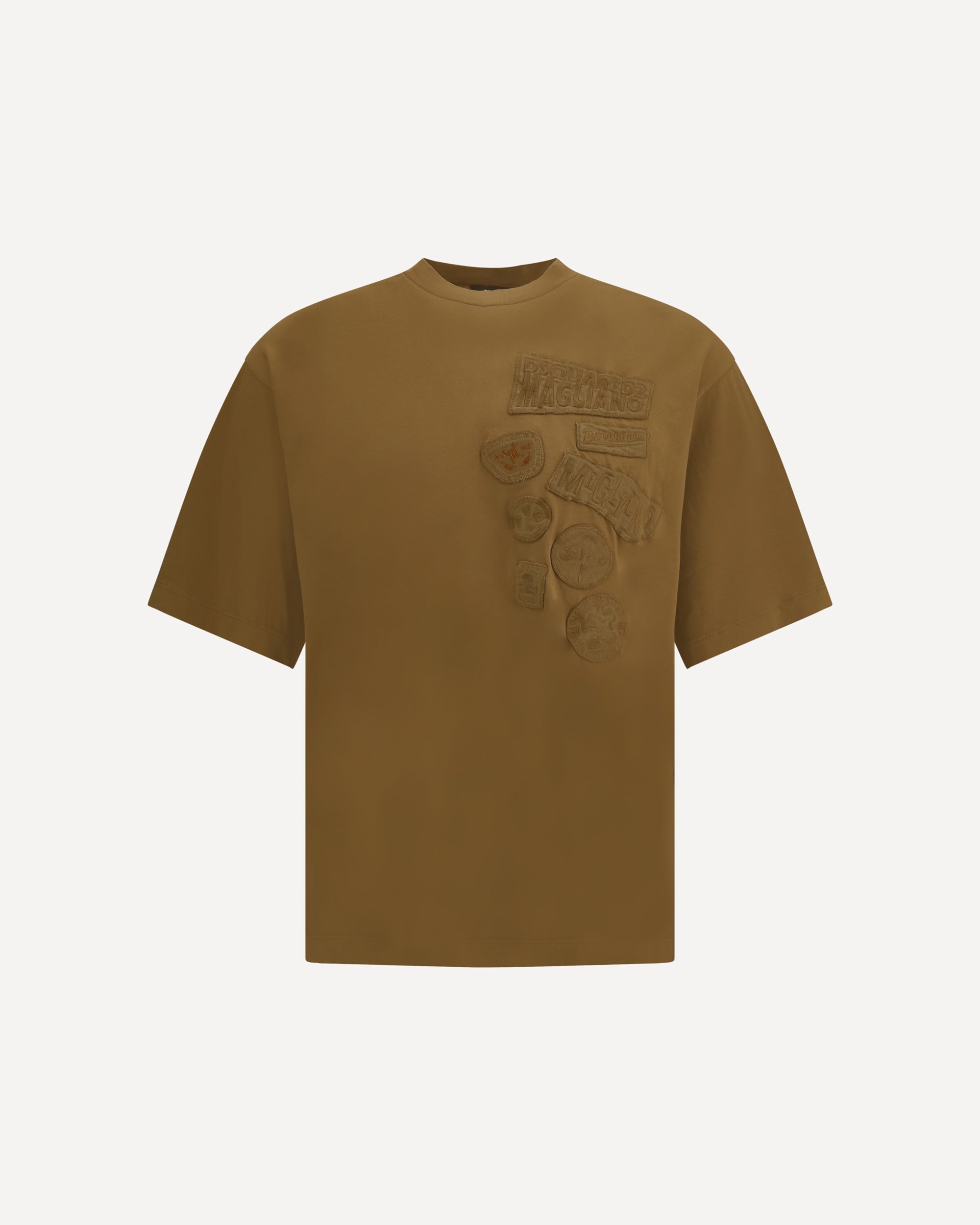 Dsquared2's embroidered patches T-Shirt combines casual style with striking decorative details. Made of soft cotton, it features a ribbed crew neck that defines its classic line. The real star of the garment is the front enriched with embroidered patches, which tell the bold and ironic aesthetic of the brand. A perfect model to add a distinctive touch to the daily wardrobe, to be paired with jeans or cargo pants for a look with a strong character.