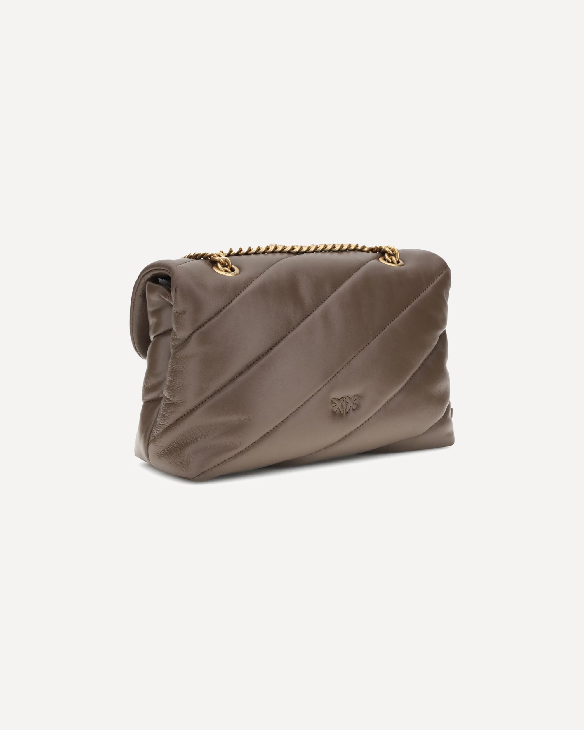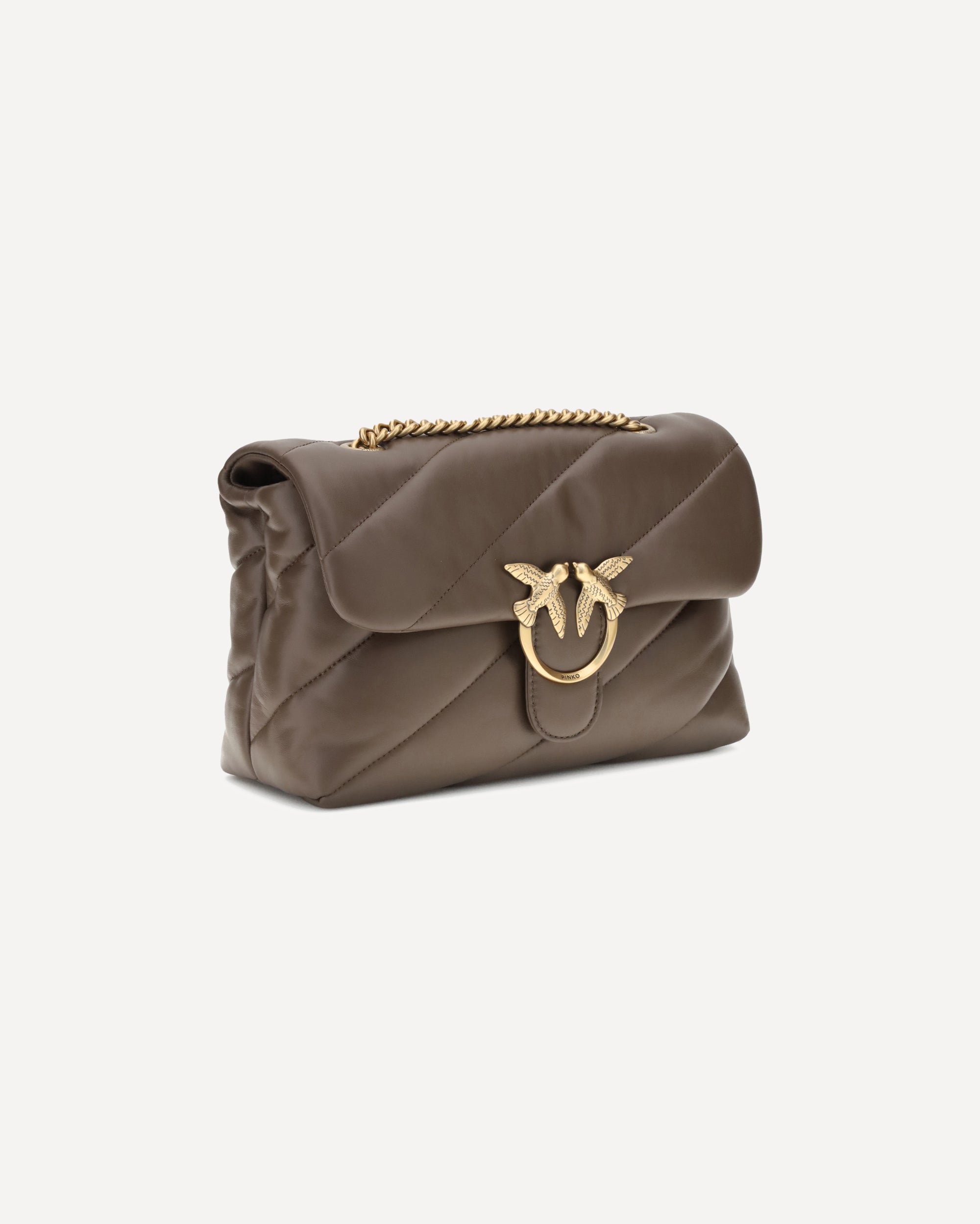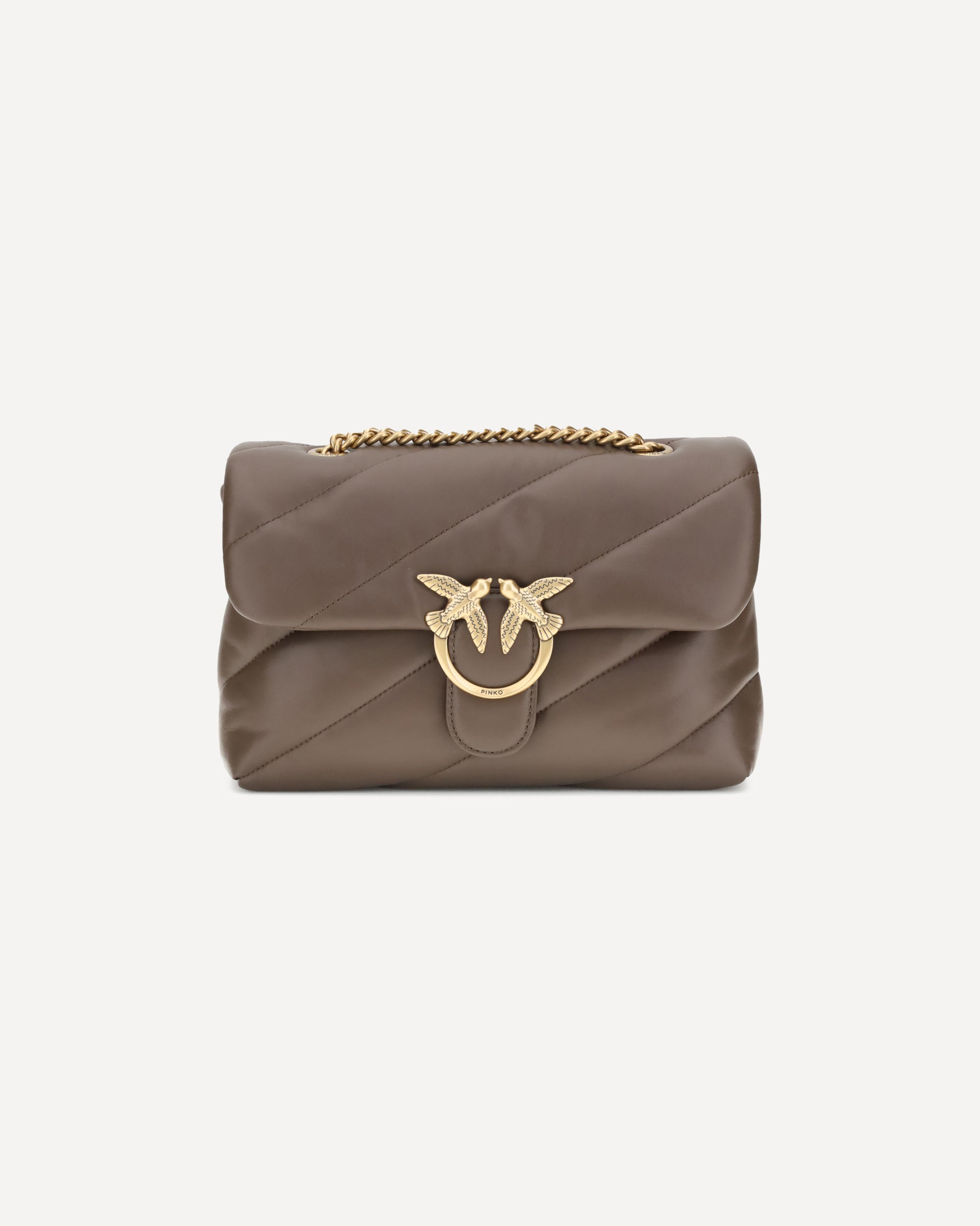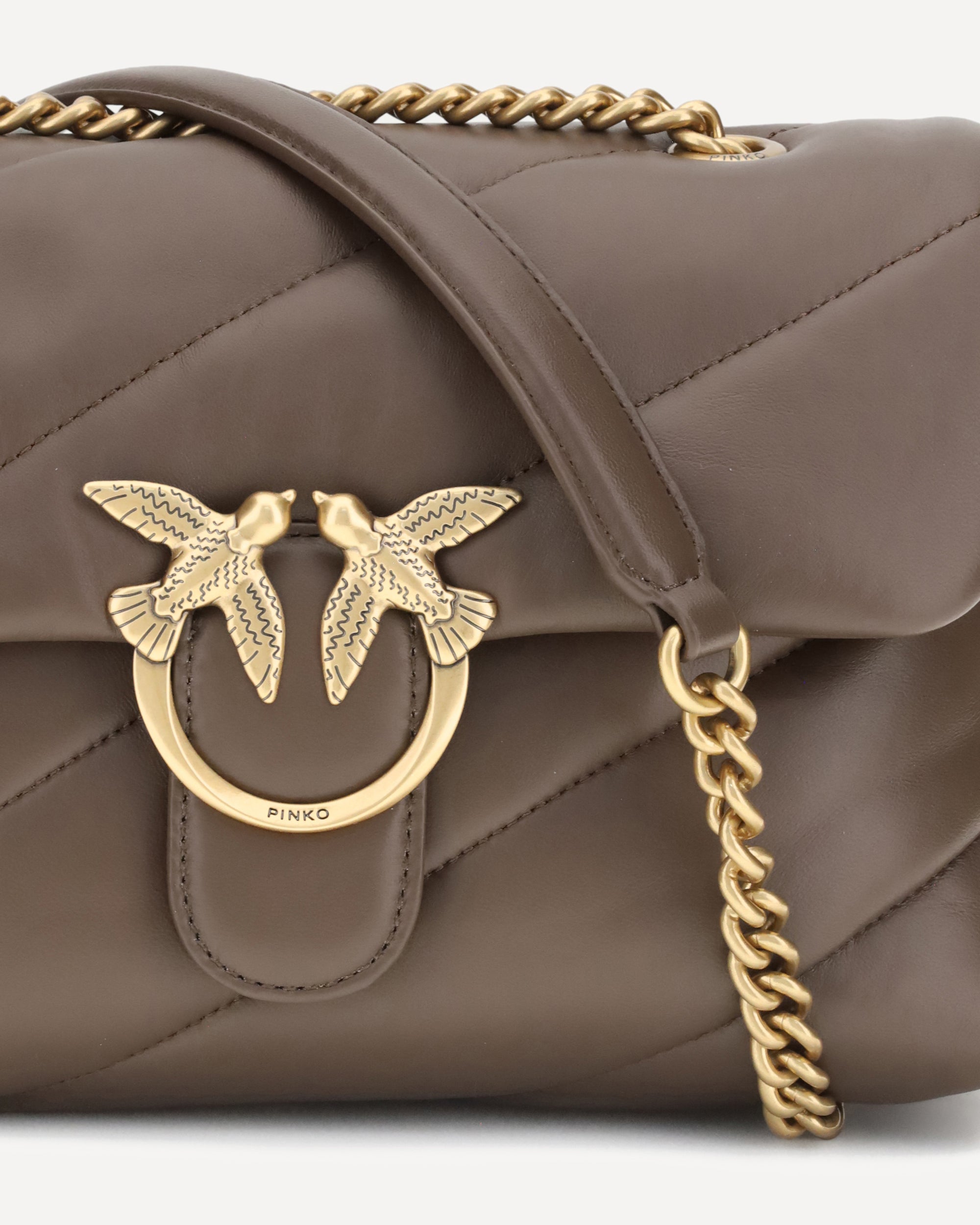 Calfskin Love Classic Shoulder Bag by Pinko, front closure with magnetic button, iconic gold-plated Love Birds logo embossed on the front, quilted and padded design, double internal compartment, sliding chain shoulder strap, iconic brand monogram embroidered tone-on-tone on the back.