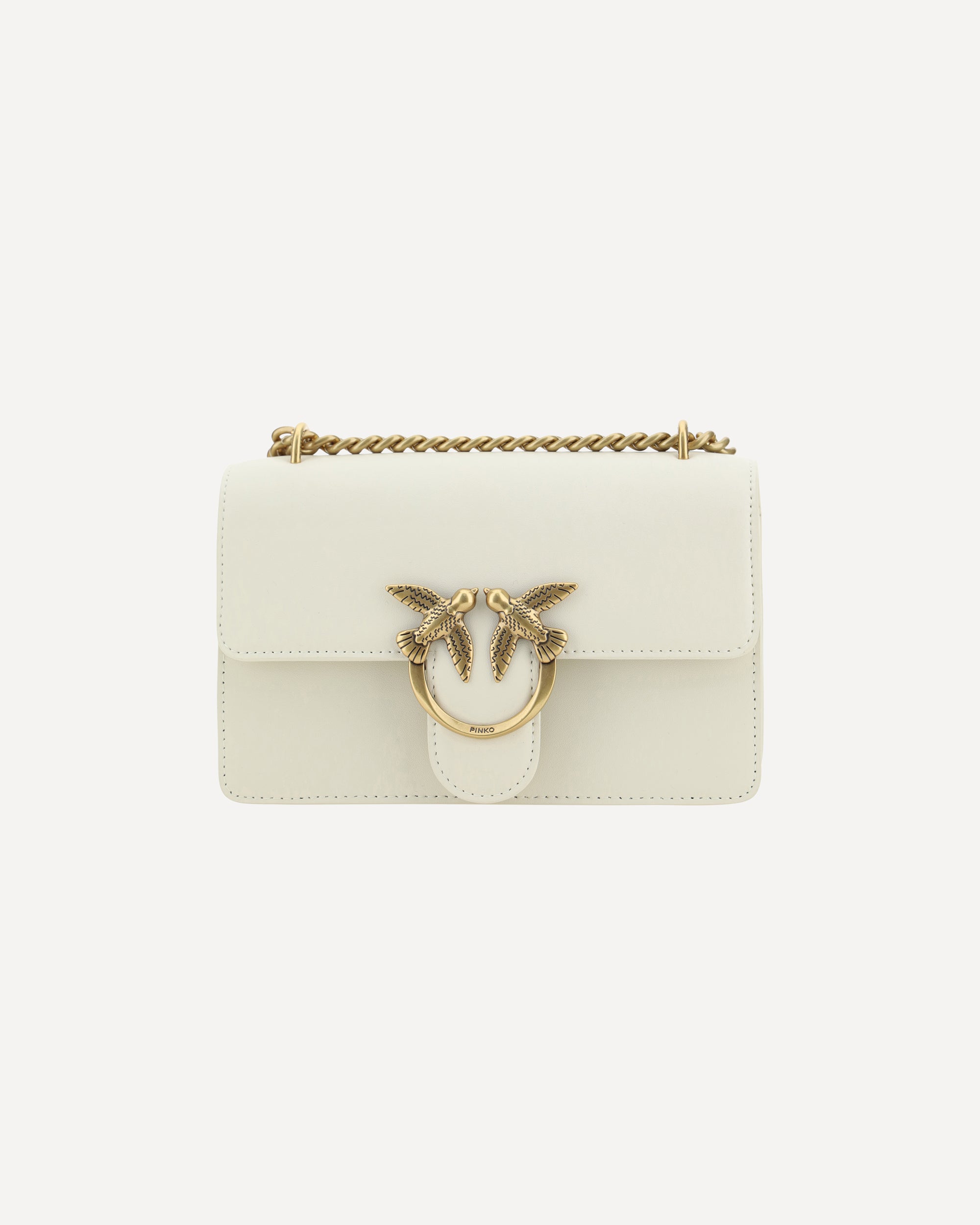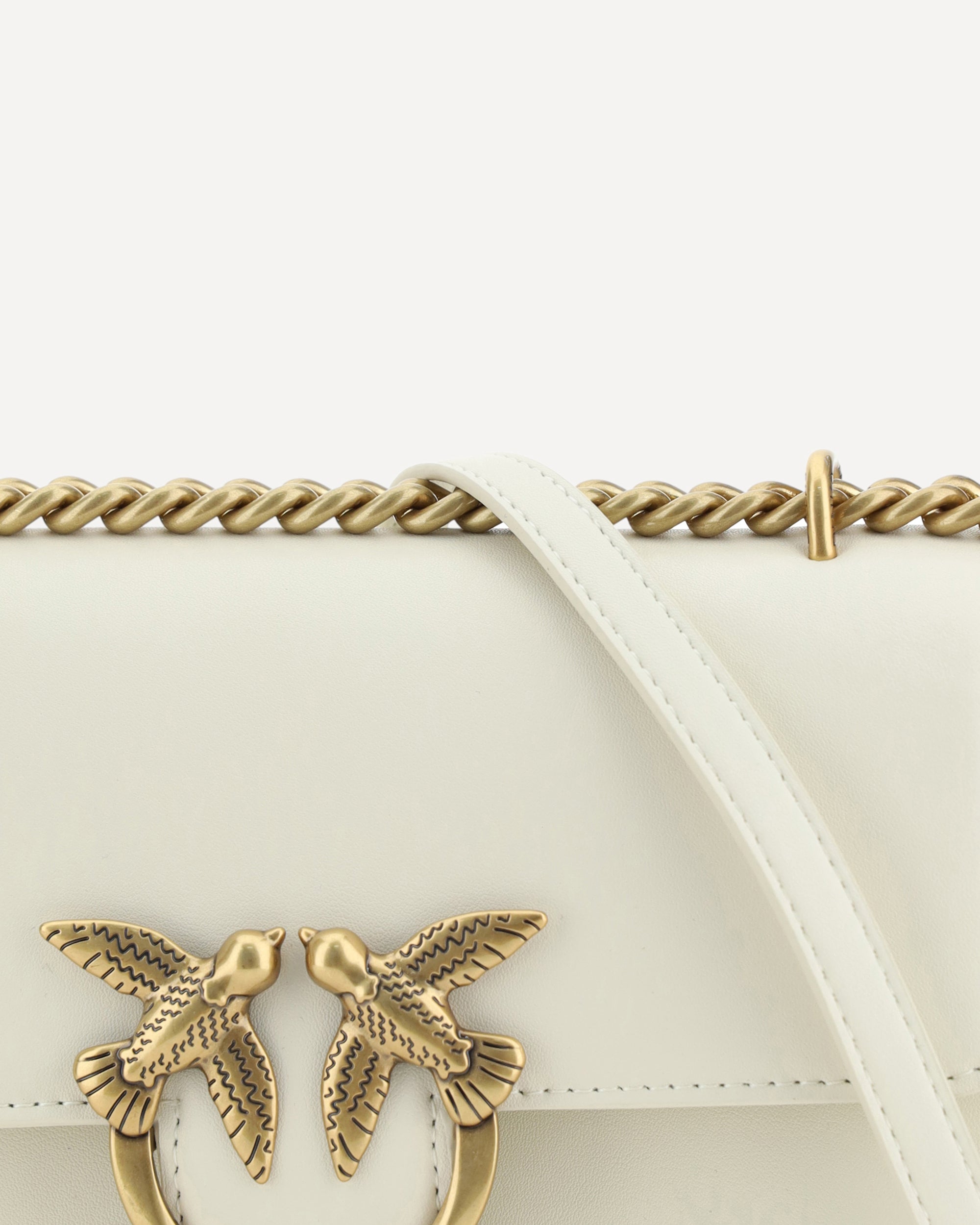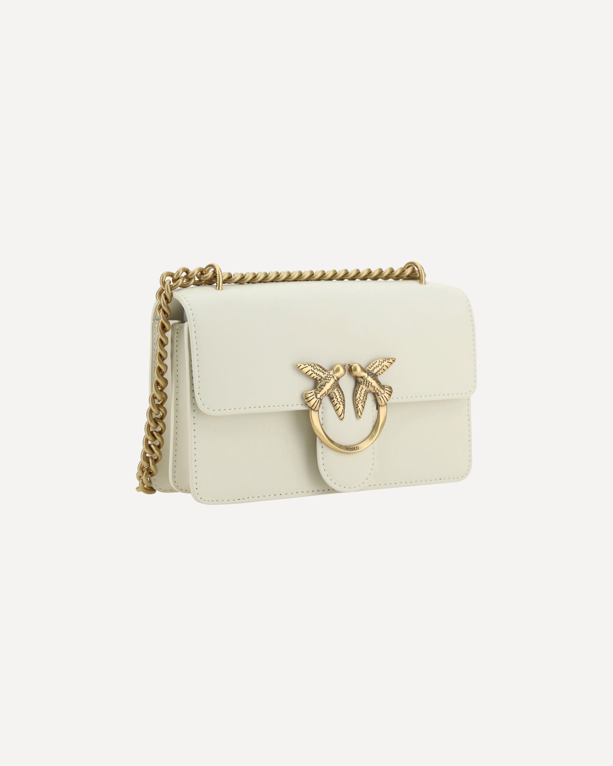 The Calfskin Love One Mini Shoulder Bag by Pinko, featuring front flap closure with magnetic button, iconic silver-plated Love Birds logo embossed on front, dual interior compartment, sliding chain strap, iconic tone-on-tone embroidered brand monogram on back, adjustable and removable flat leather shoulder strap.