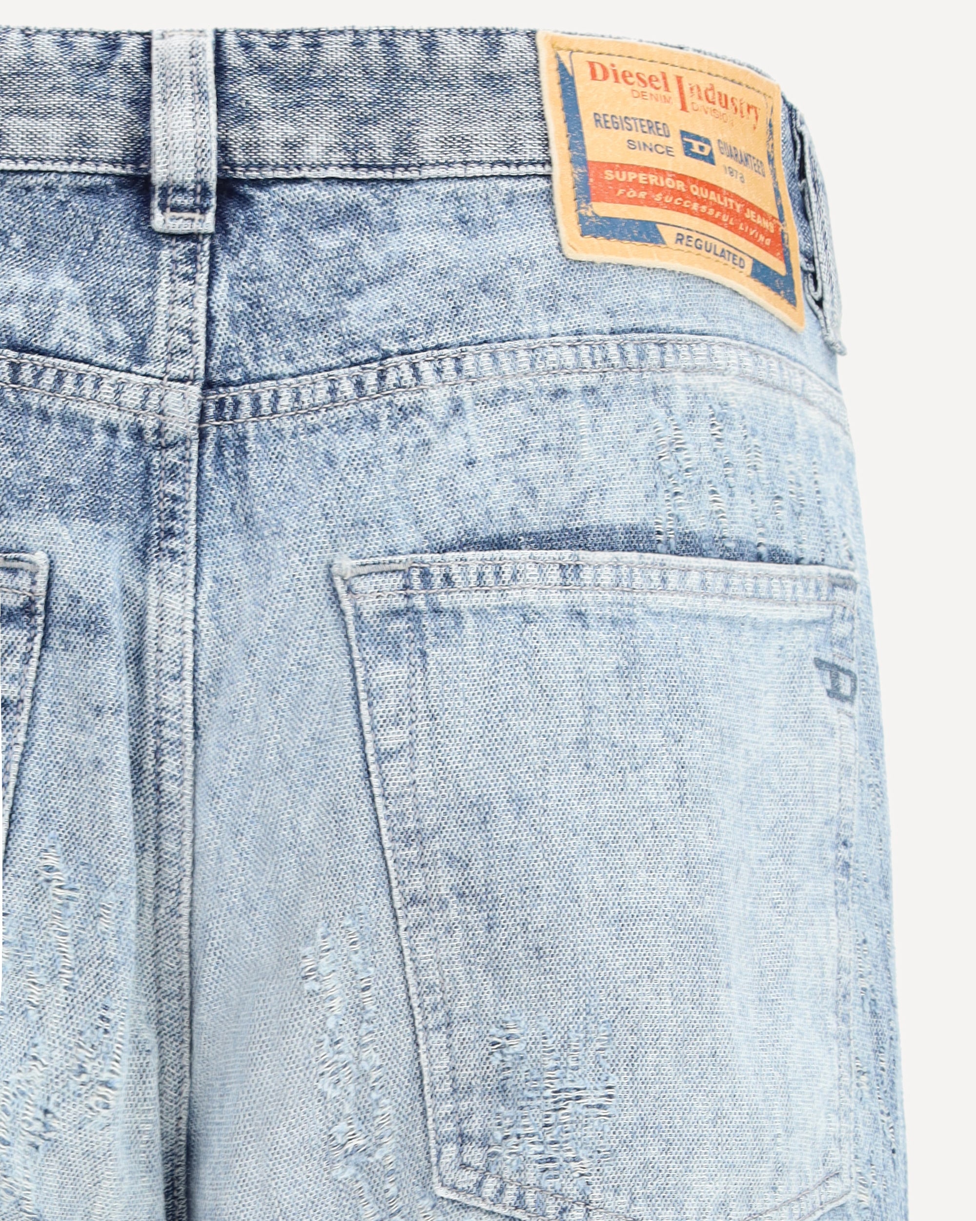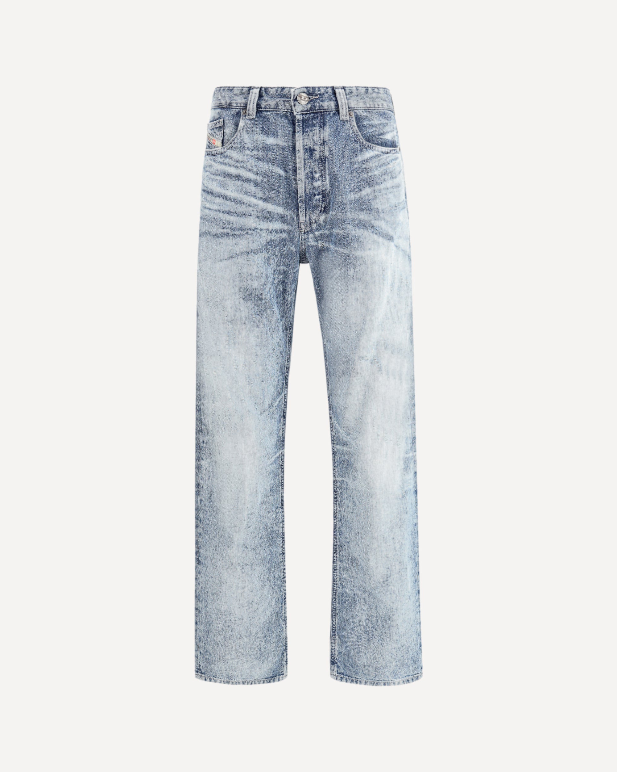 The regular Jeans 2024 D-Macs by Diesel are crafted from light blue fix denim inspired by traditional Japanese honeycomb fabrics. The jacquard weave’s texture and colour are enhanced through stone washing, nebulised bleach effects, and laser technology. Floating threads and natural abrasions appear organically during the process, resulting in a uniquely distressed Runway finish that embodies Diesel’s bold and innovative craftsmanship.