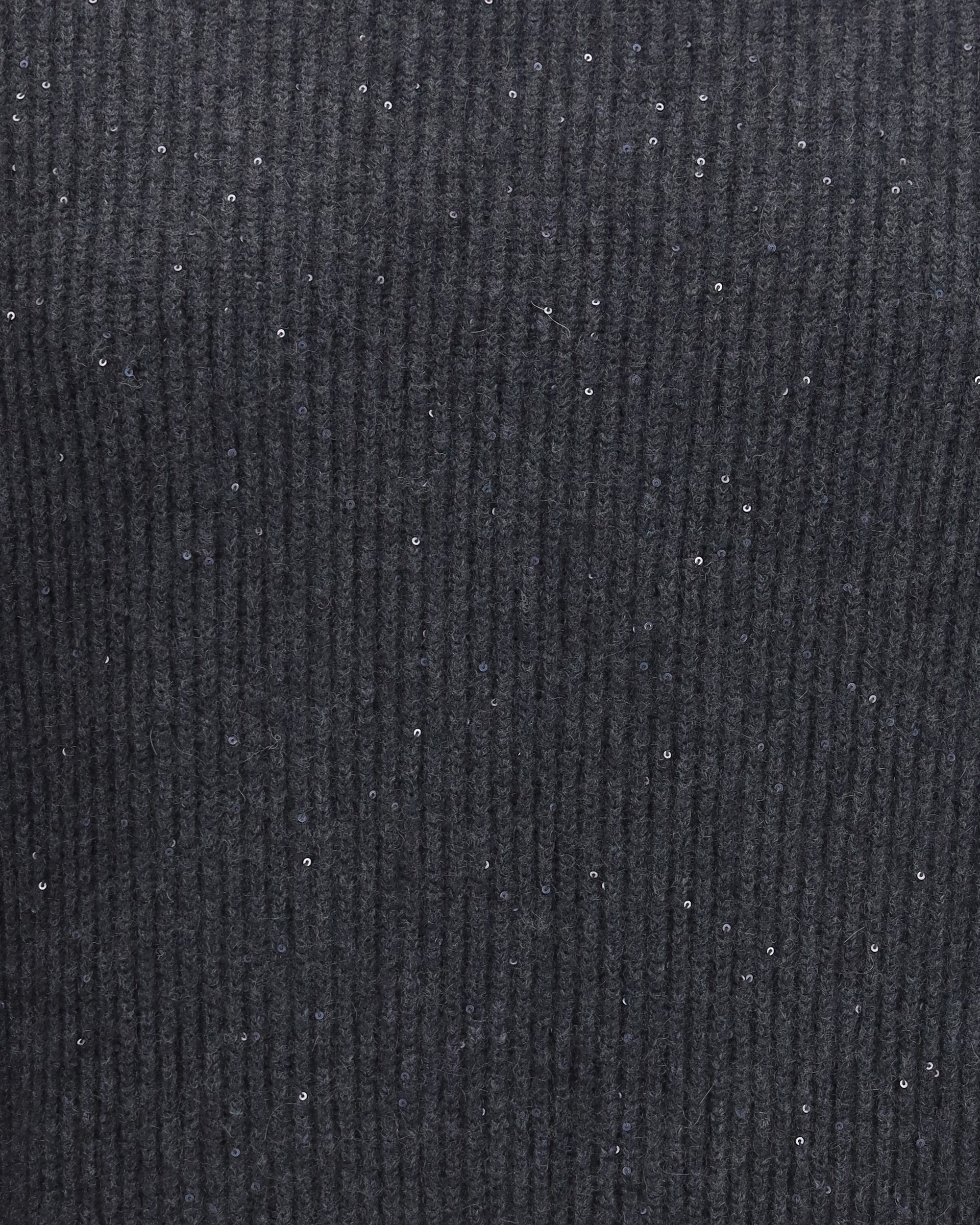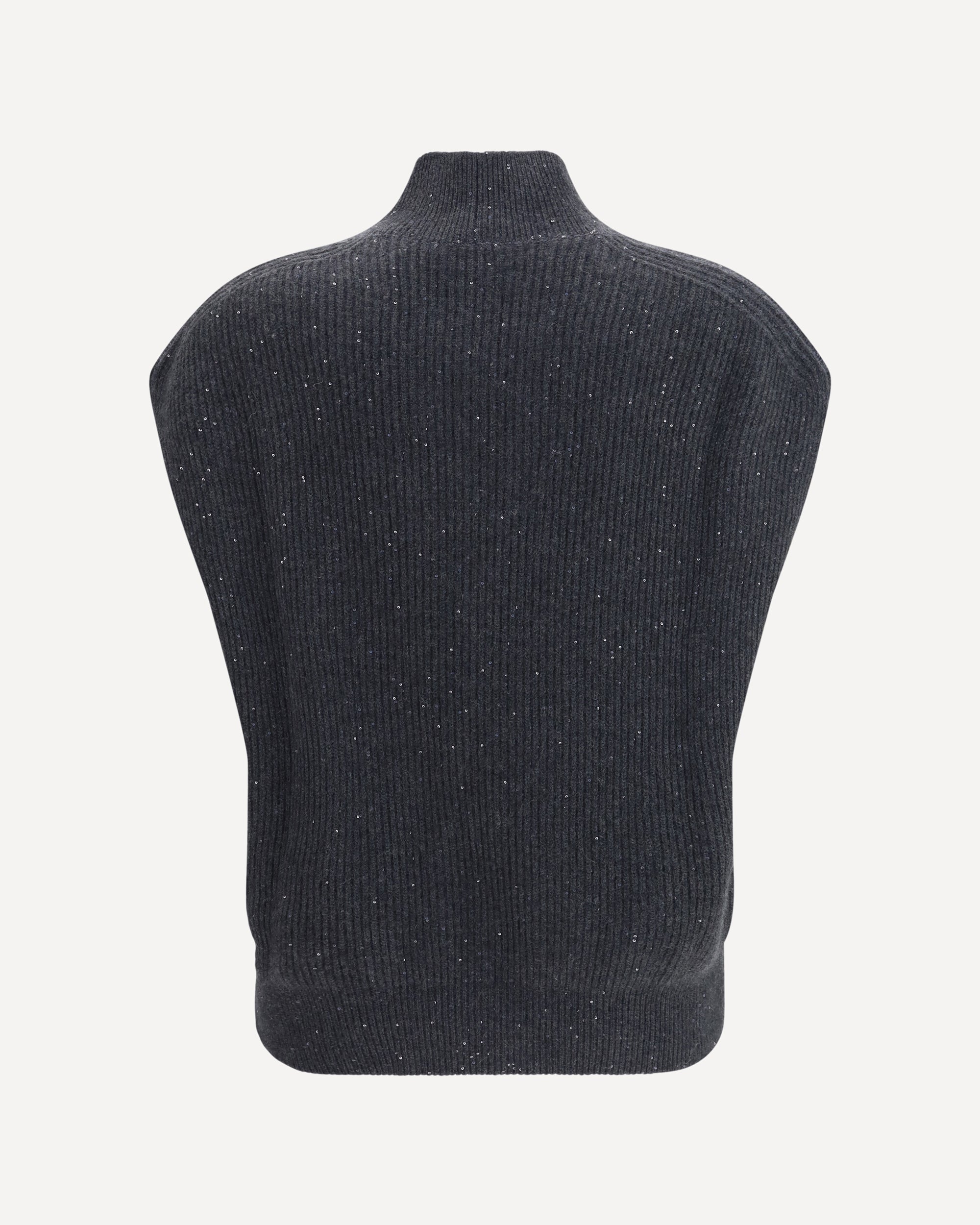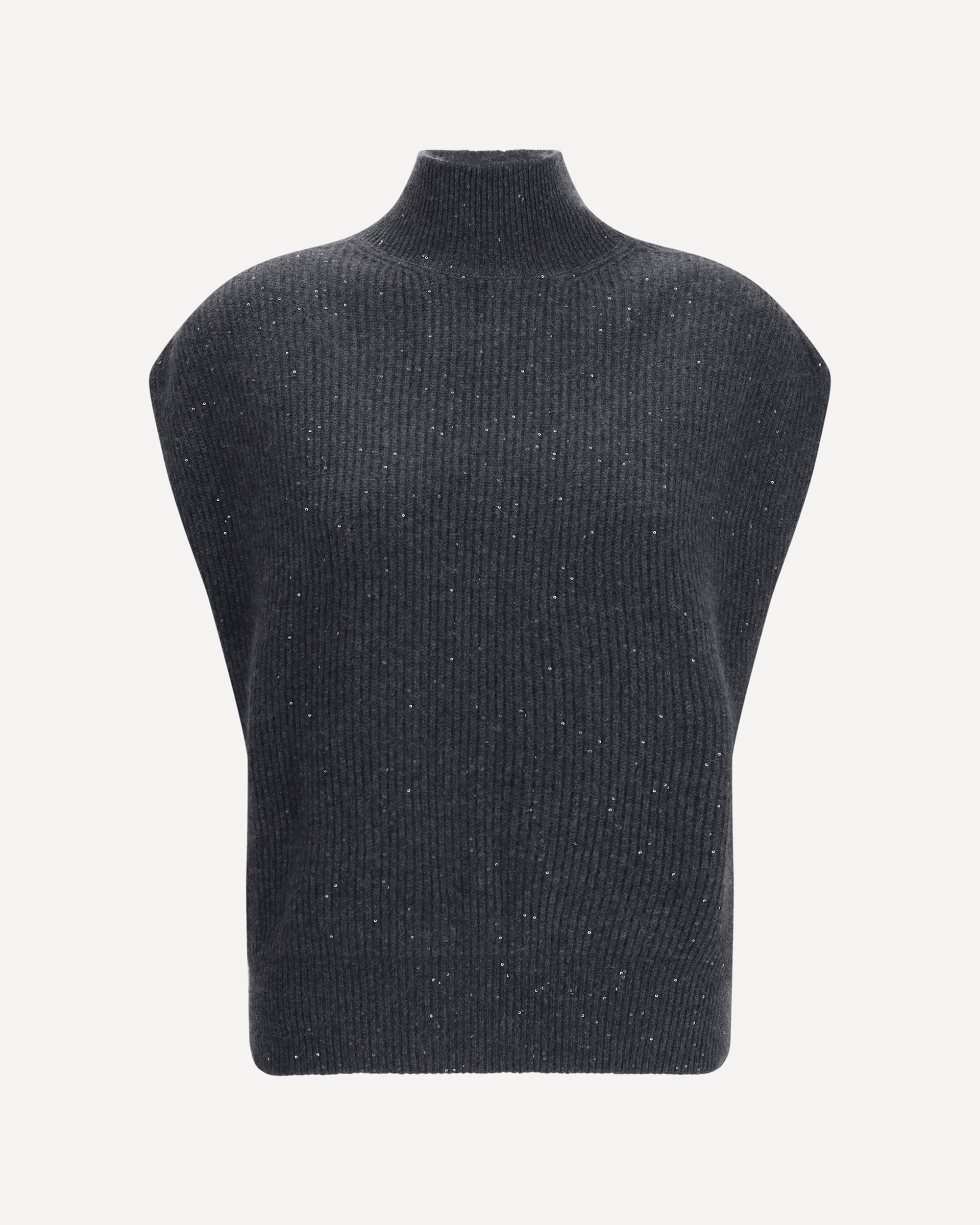 The Sleeveless Wool Sweater with sequins woven into the fabric combines simplicity with refinement. The high collar and ribbed knit add structure and character, while the shimmering details create a contrast that enhances femininity. A versatile piece that elevates any look with understated elegance.