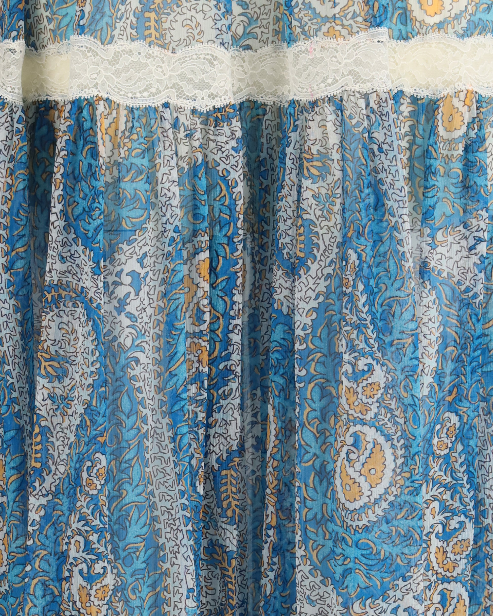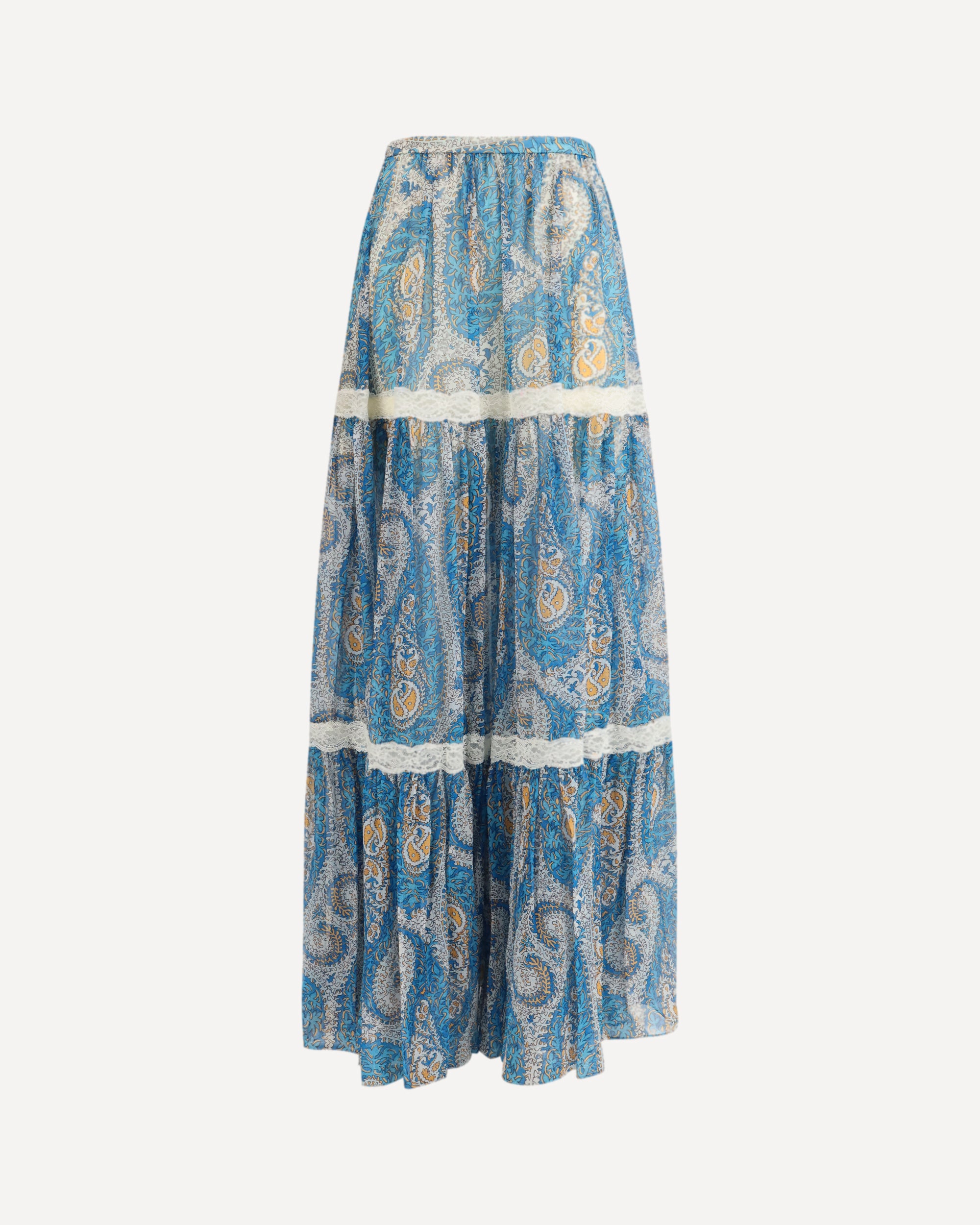 The silk crepon maxi Skirt by Etro embodies effortless elegance through its lightweight pure silk construction, adorned with an all-over Paisley motif inspired by foliage elements. The high-waisted silhouette enhances the figure, while soft flounces interspersed with delicate lace inserts add fluidity and visual depth. Finished with a rear zip closure, this skirt offers a regular fit and a graceful, romantic movement, perfect for elevated daytime looks or refined evening ensembles.