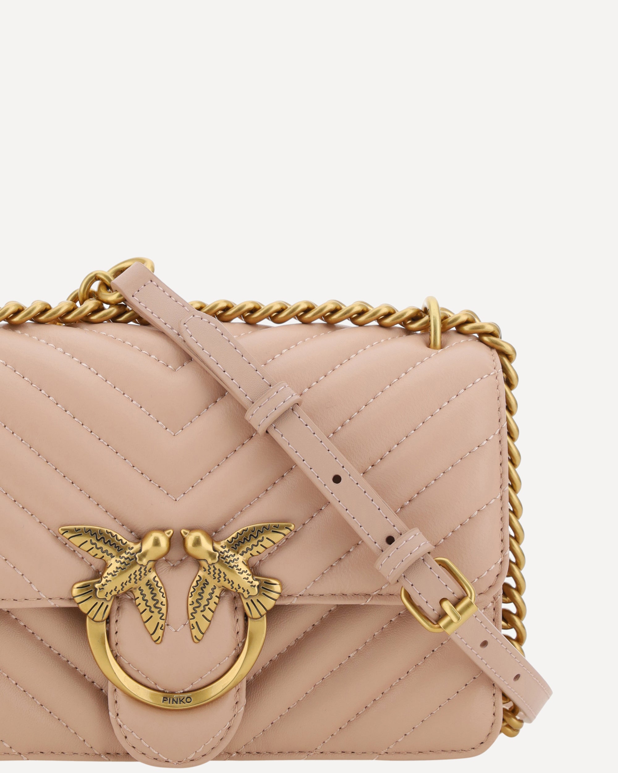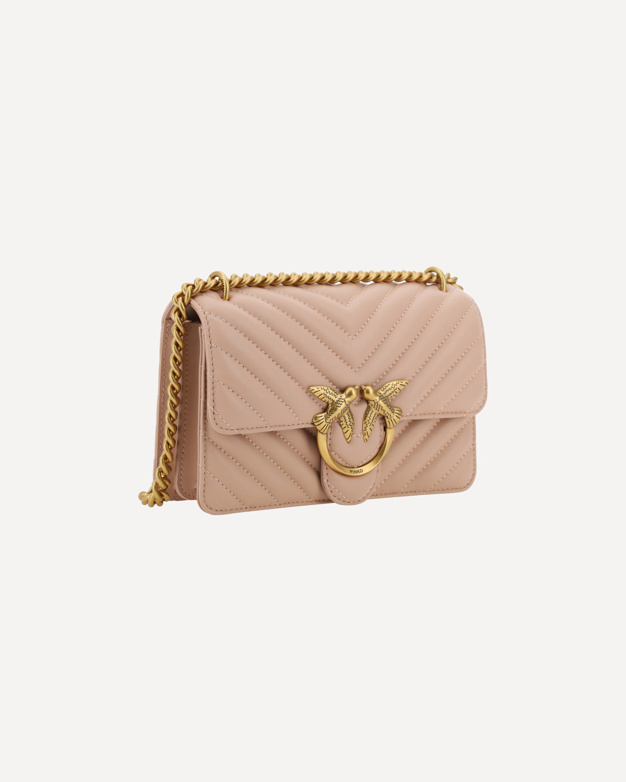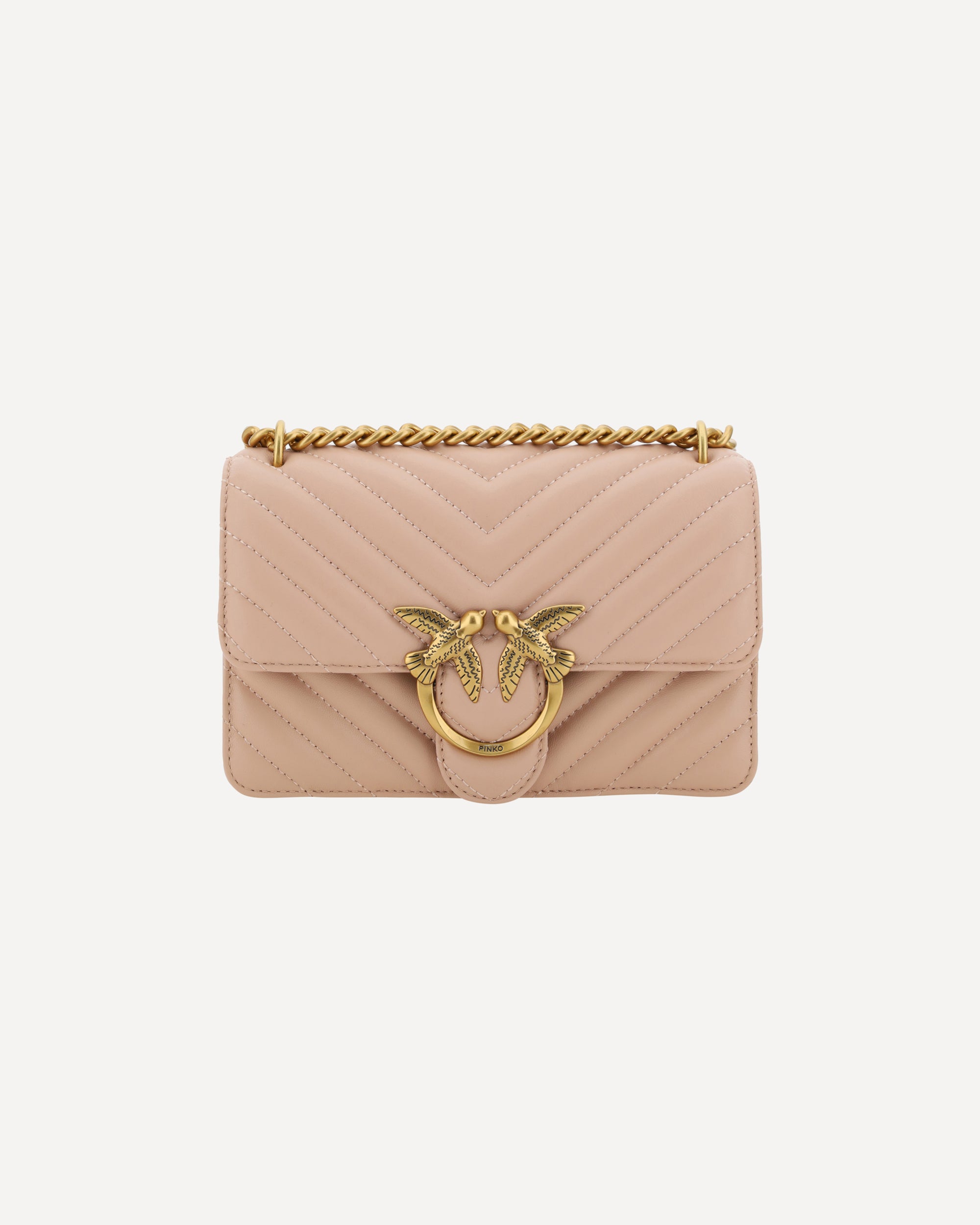 The Mini Love leather Shoulder Bag by Pinko is a perfect mix of elegance and functionality. The front closure with magnetic flap ensures safety and practicality, while the iconic gold-plated Love Birds logo embossed on the front adds a touch of distinctive luxury. The quilted and padded design is not only refined, but also gives a feeling of softness and comfort. The double internal compartment offers enough space to keep everything in order, while the sliding chain shoulder strap allows you to adjust it to your preferred height, making it perfect for any occasion. The internal slip pocket and the tone-on-tone embroidered brand monogram on the back add exclusive details that make this bag a must-have.