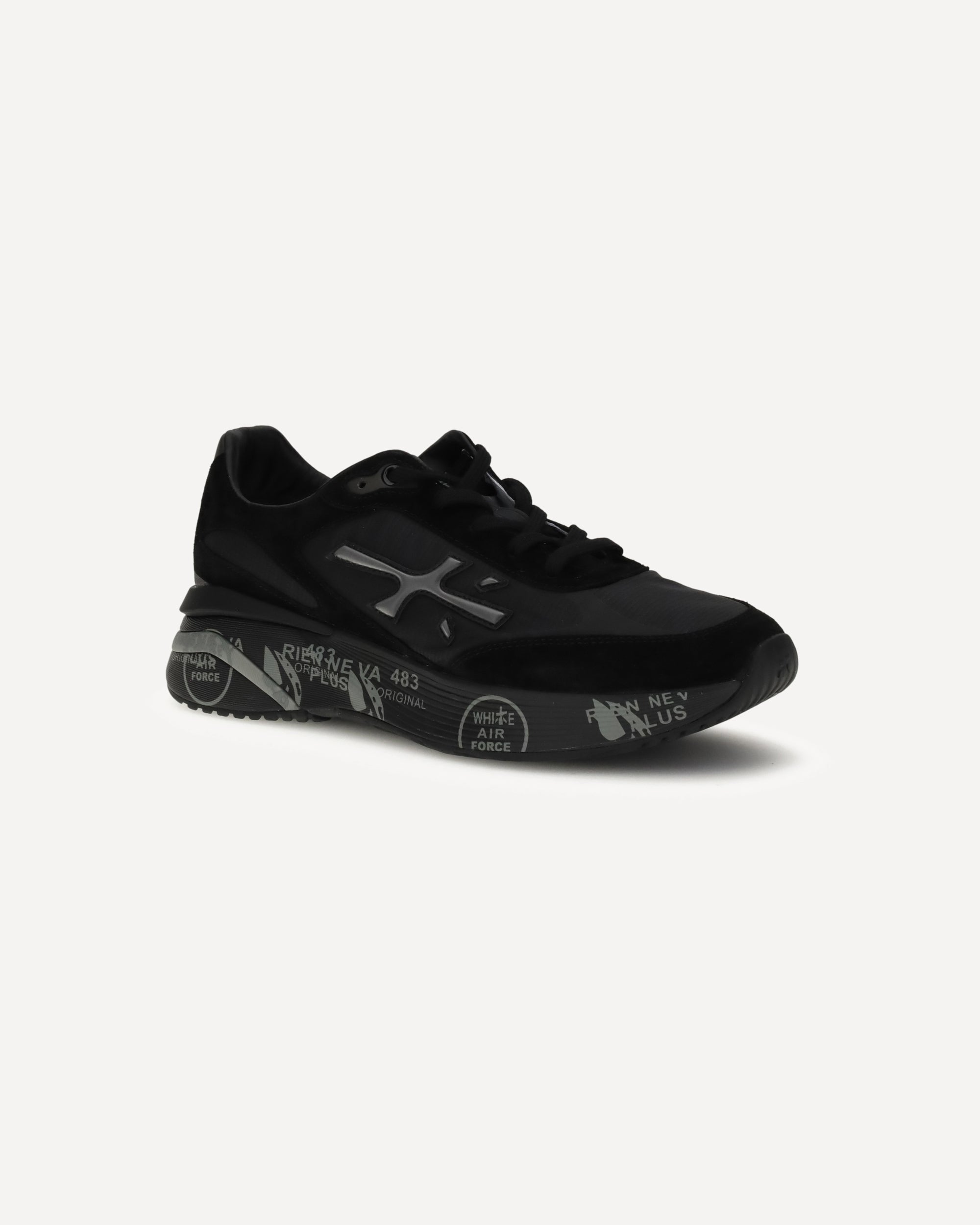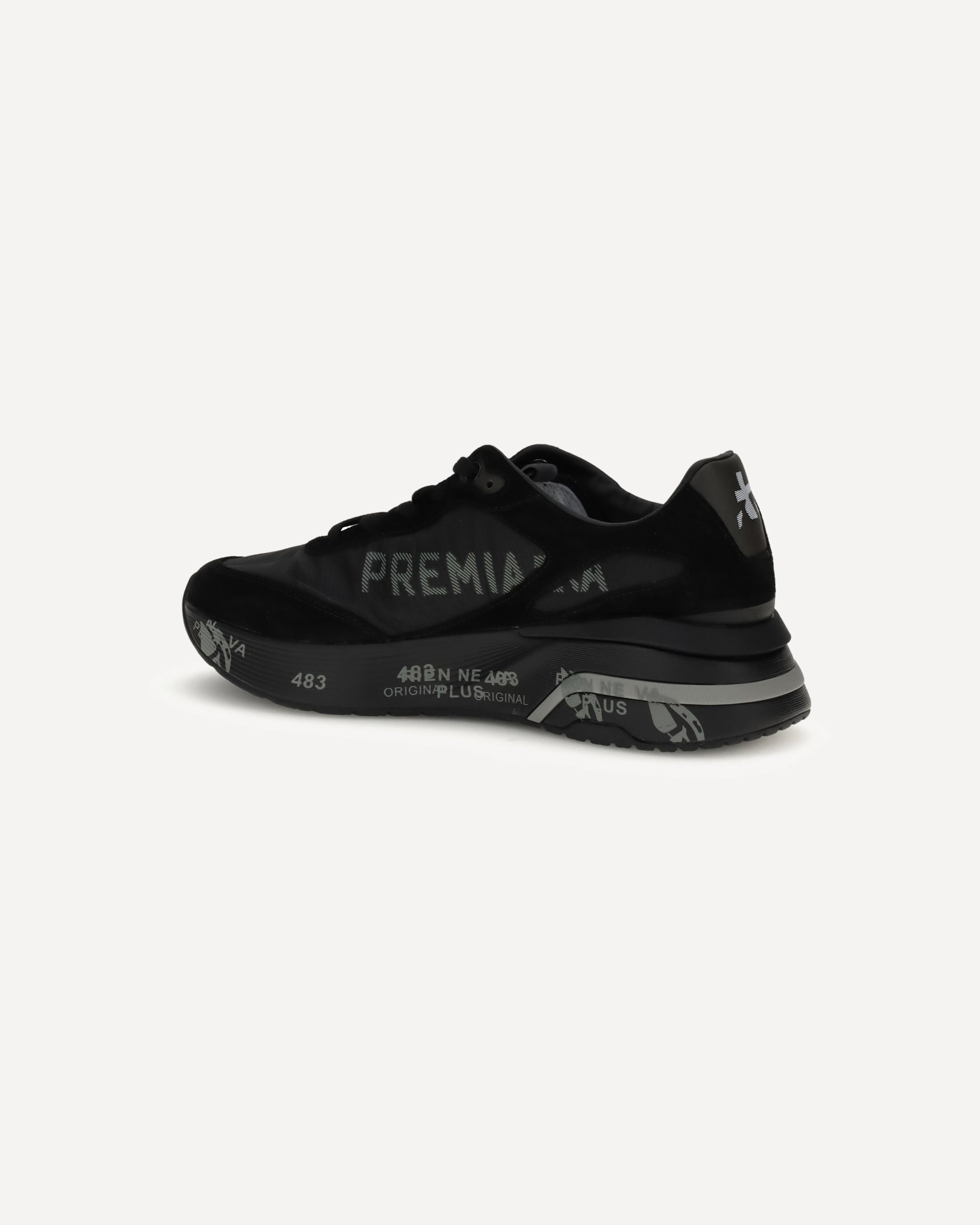 Calfskin Moerun 6445 Sneakers by Premiata featuring paneled design, suede inserts, embroidered logo label on front tab, iconic brand logo embossed on side panels, lace-up front closure.