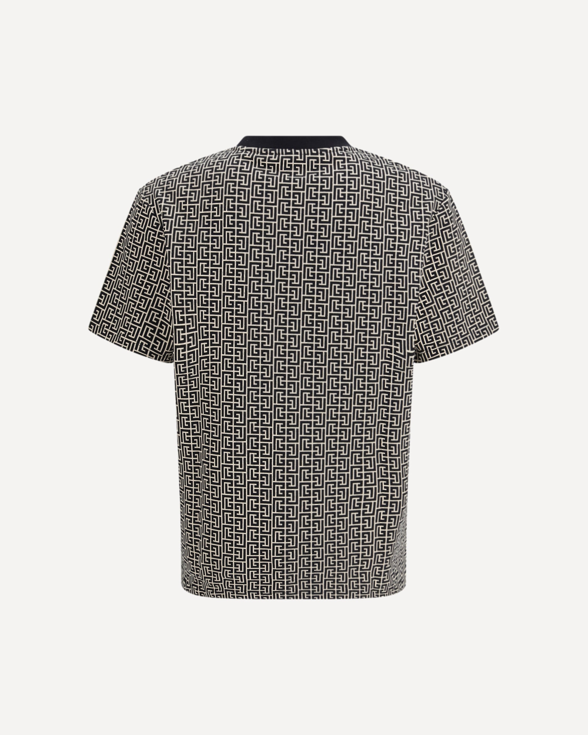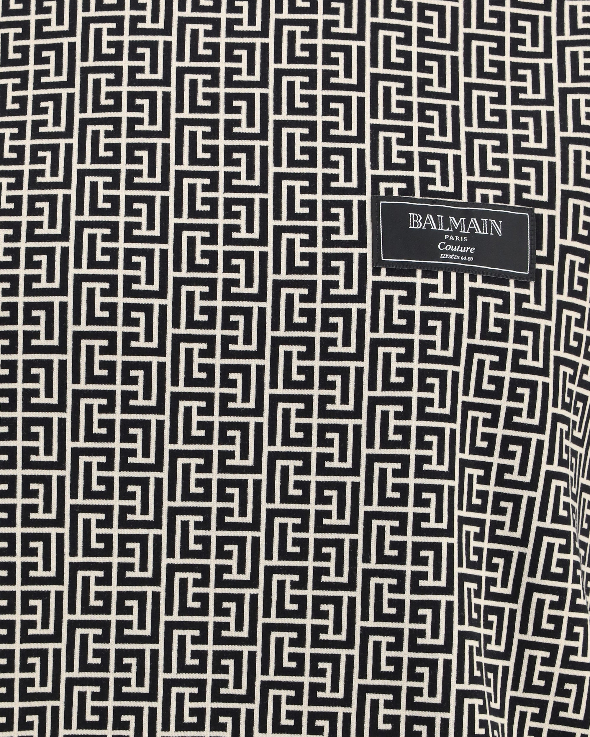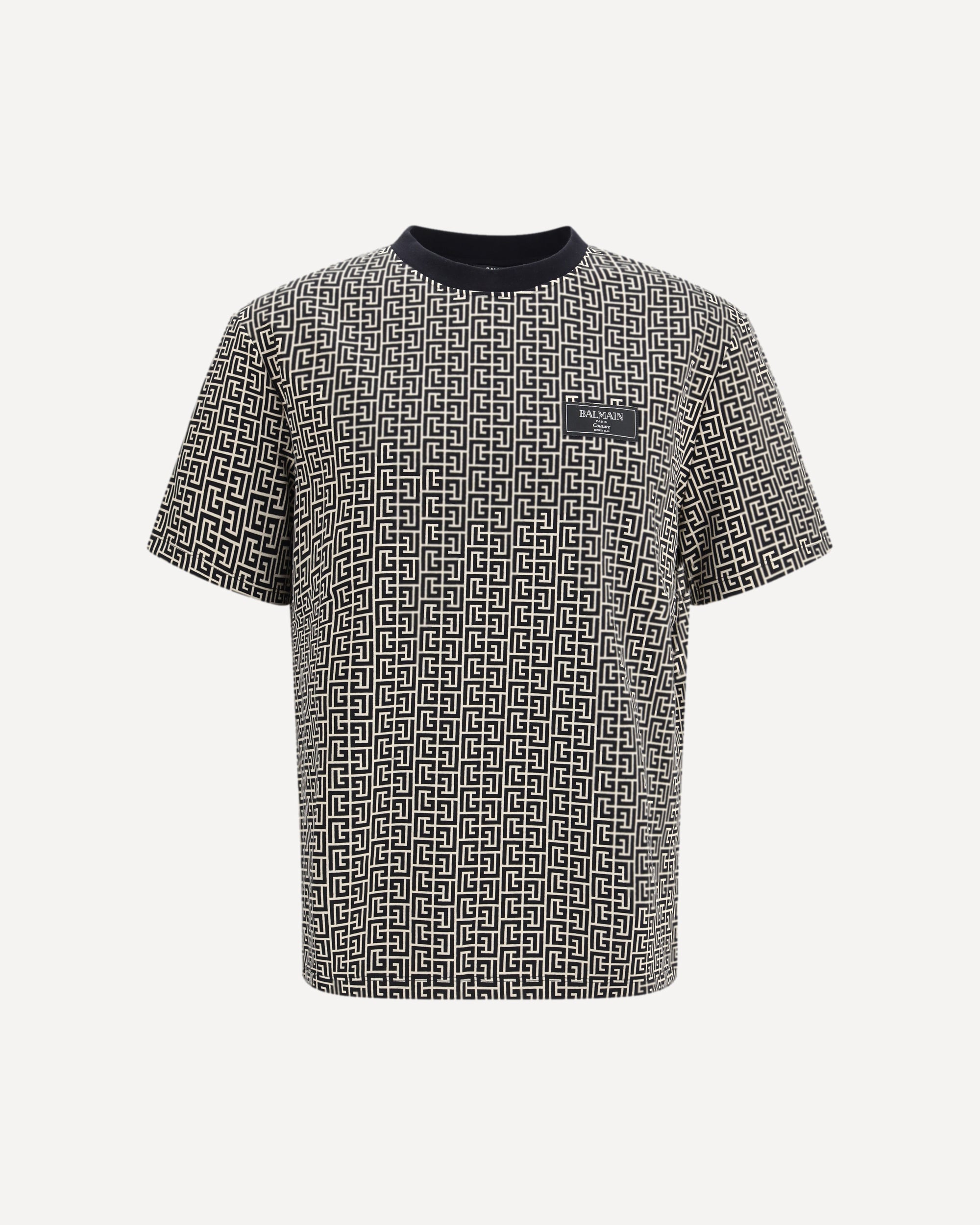 The jacquard T-shirt with PB labyrinth monogram by Balmain is crafted using a jacquard technique that creates the iconic all-over pattern. It features a round neckline with contrasting ribbed trim, short sleeves, and a Balmain Couture fabric label on the chest. Designed with a regular fit, it delivers a refined yet everyday-ready look.