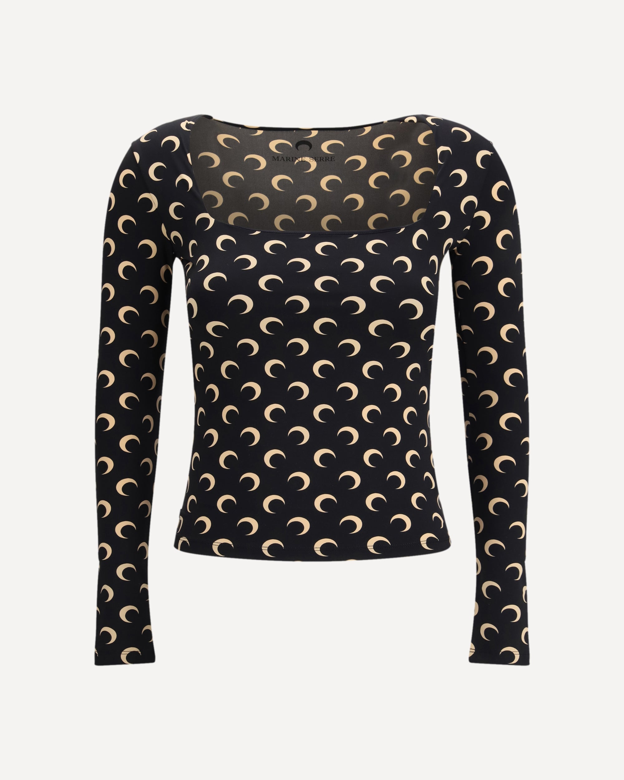 The Recycled Moon Top by Marine Serre embodies the brand’s avant-garde spirit, blending sustainability with contemporary design. Crafted from recycled fabric with a “second skin” effect, it fits closely to the body, enhancing the silhouette. The reinforced crew neckline and raw-edge finishes at the cuffs and hem highlight its modern attitude, while the all-over crescent moon print — a signature of the house — adds a bold, graphic touch. A sophisticated and versatile piece, perfect for futuristic and refined looks.