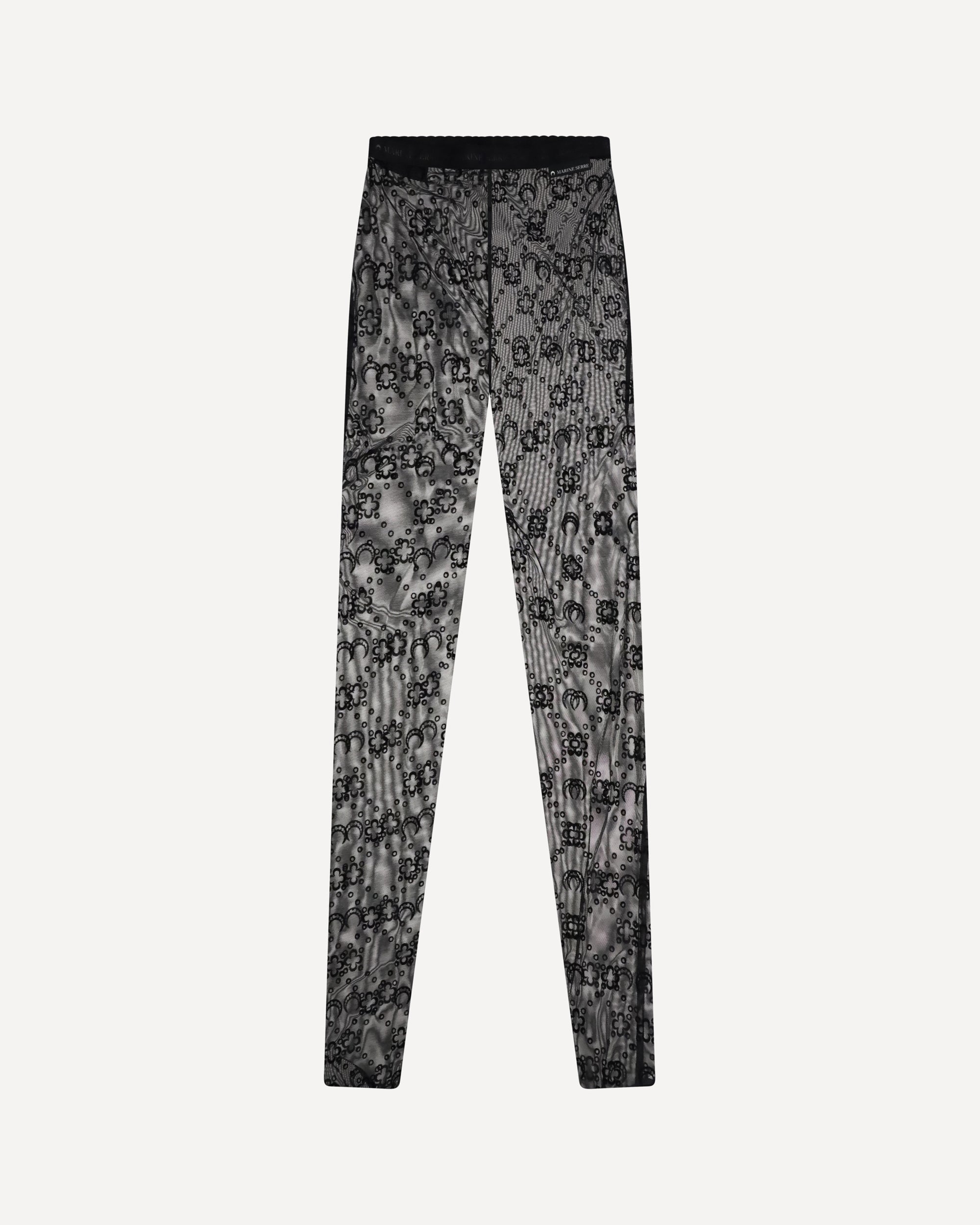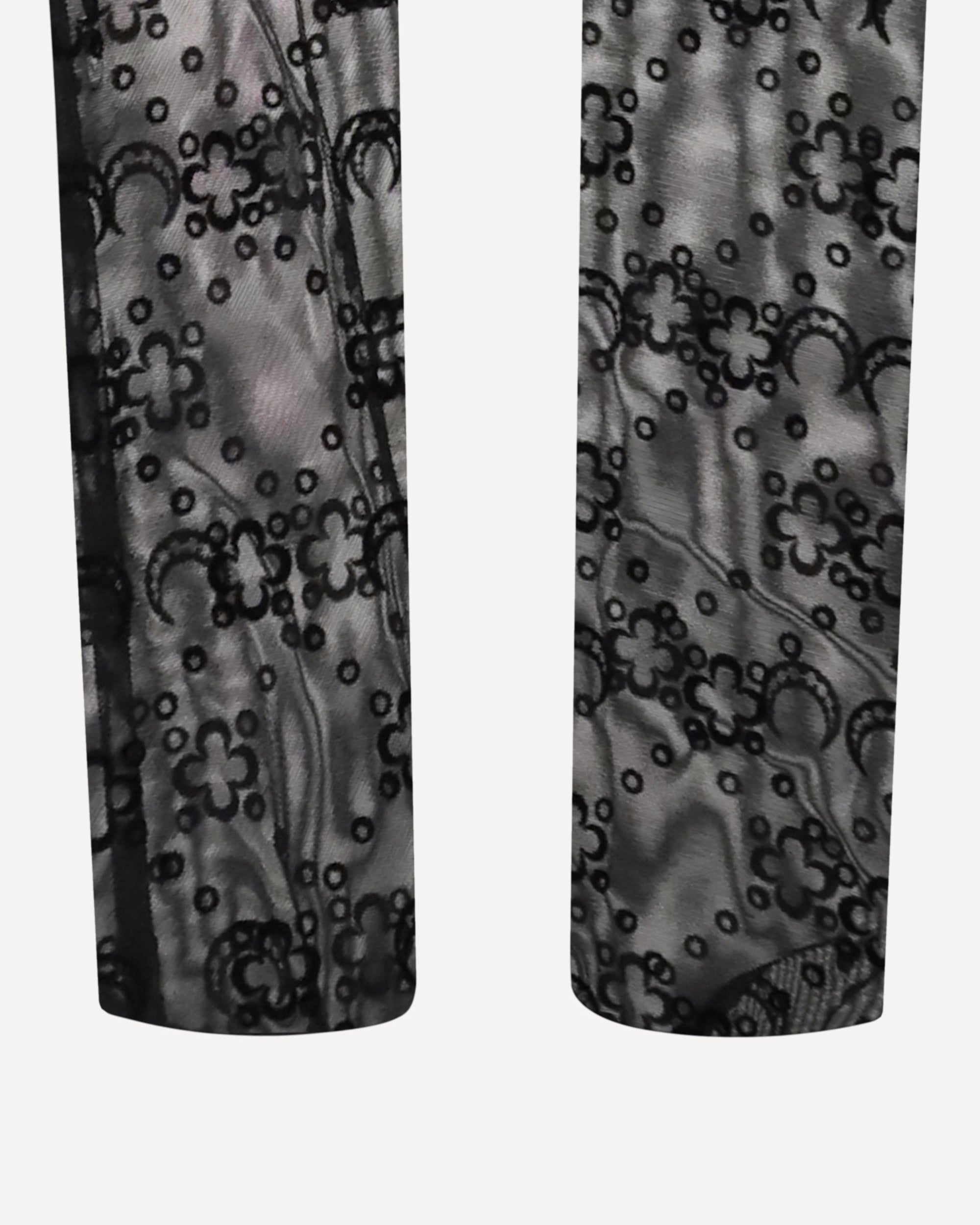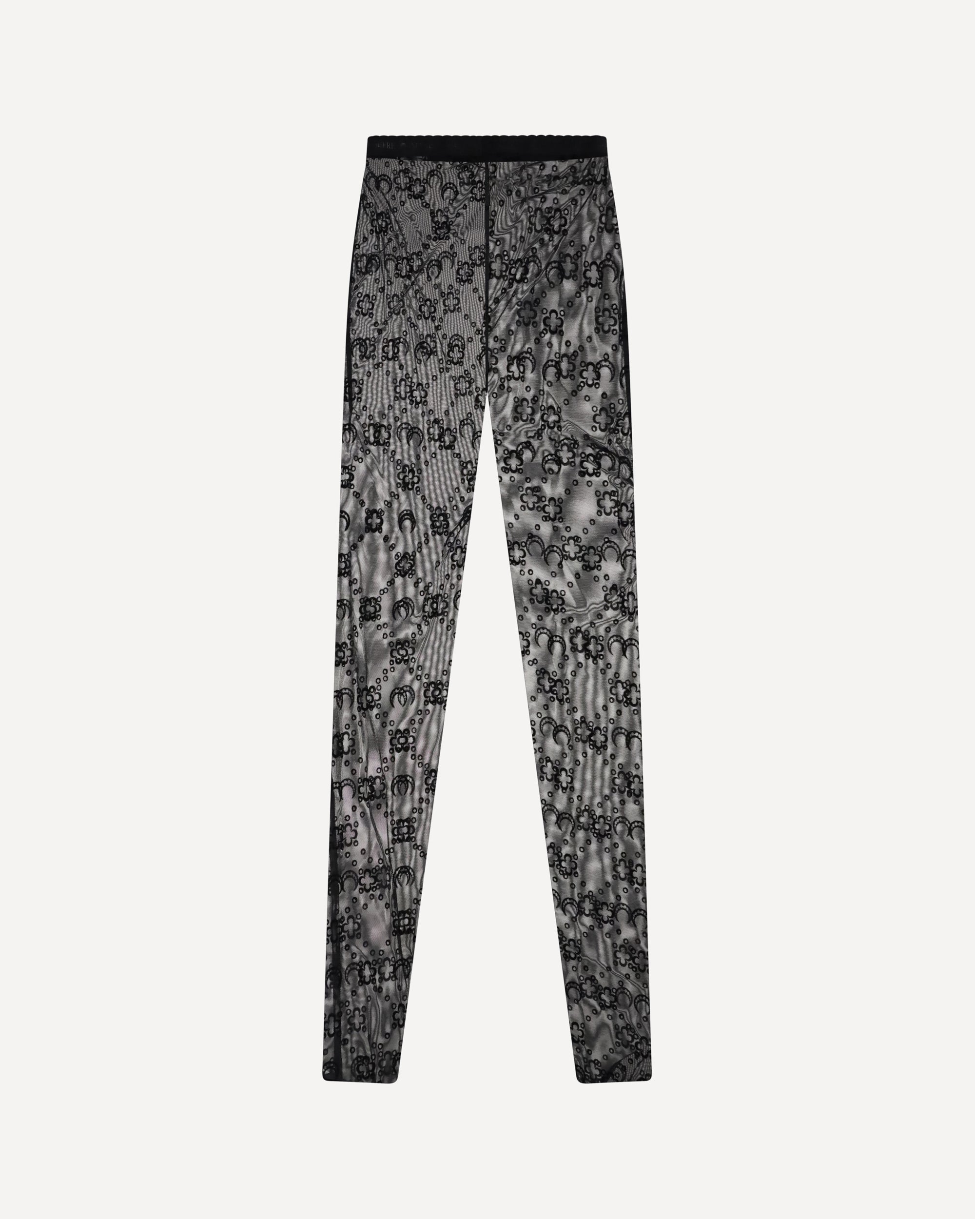 The Recycled Mesh Flocked Tights embody Marine Serre’s innovative and sustainable vision. The high-waisted, second-skin silhouette embraces the body with lightness and precision, enhancing femininity through a contemporary design. The all-over flocked Moonogram motif creates a refined balance between texture and transparency, while the branded elastic waistband ensures both comfort and structure. An iconic piece that merges aesthetics and responsibility, reflecting the modern essence of the house.