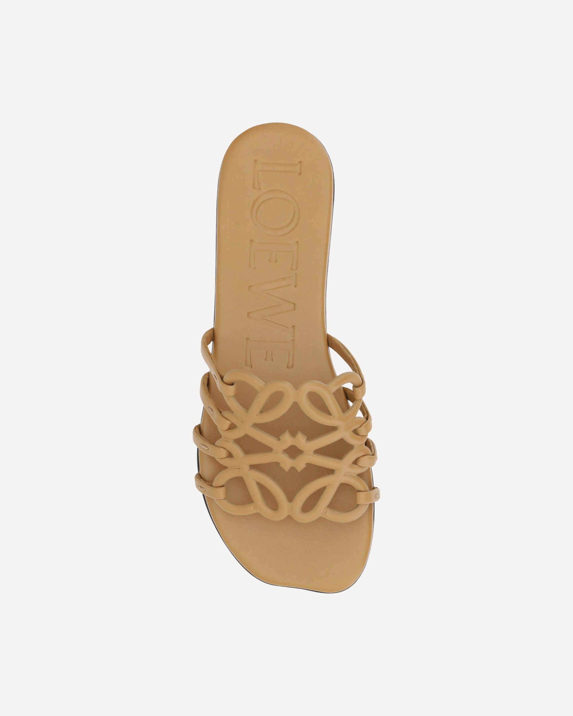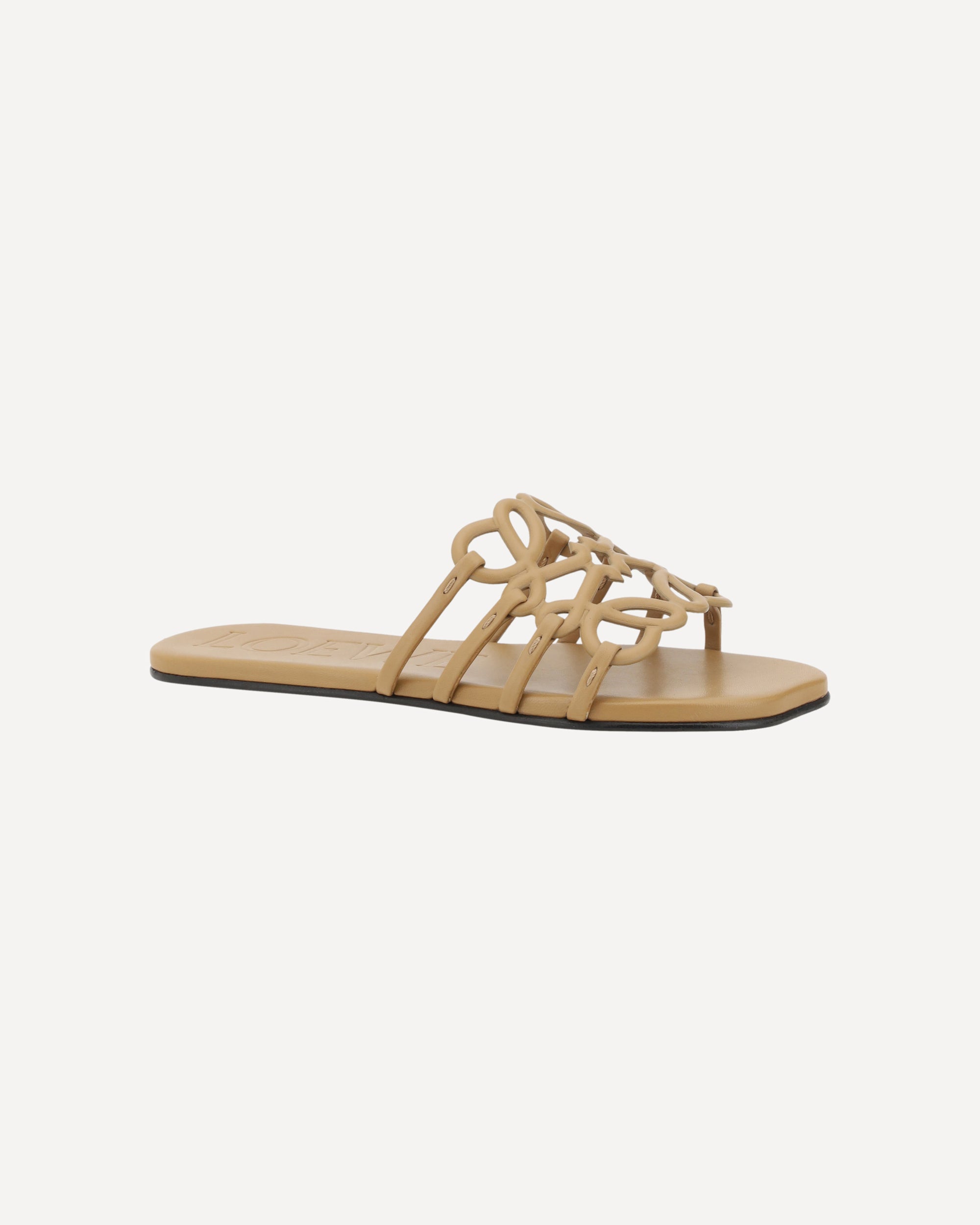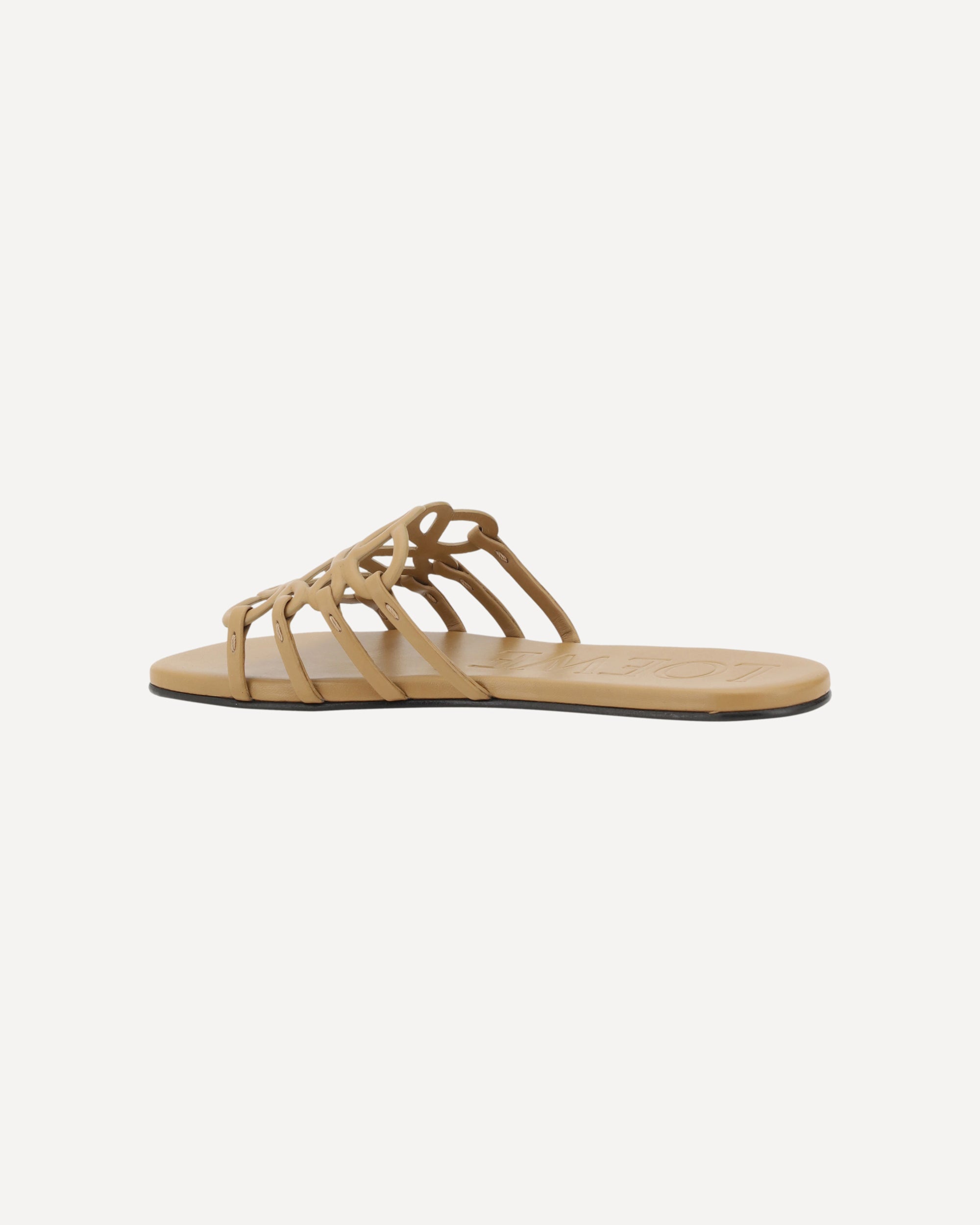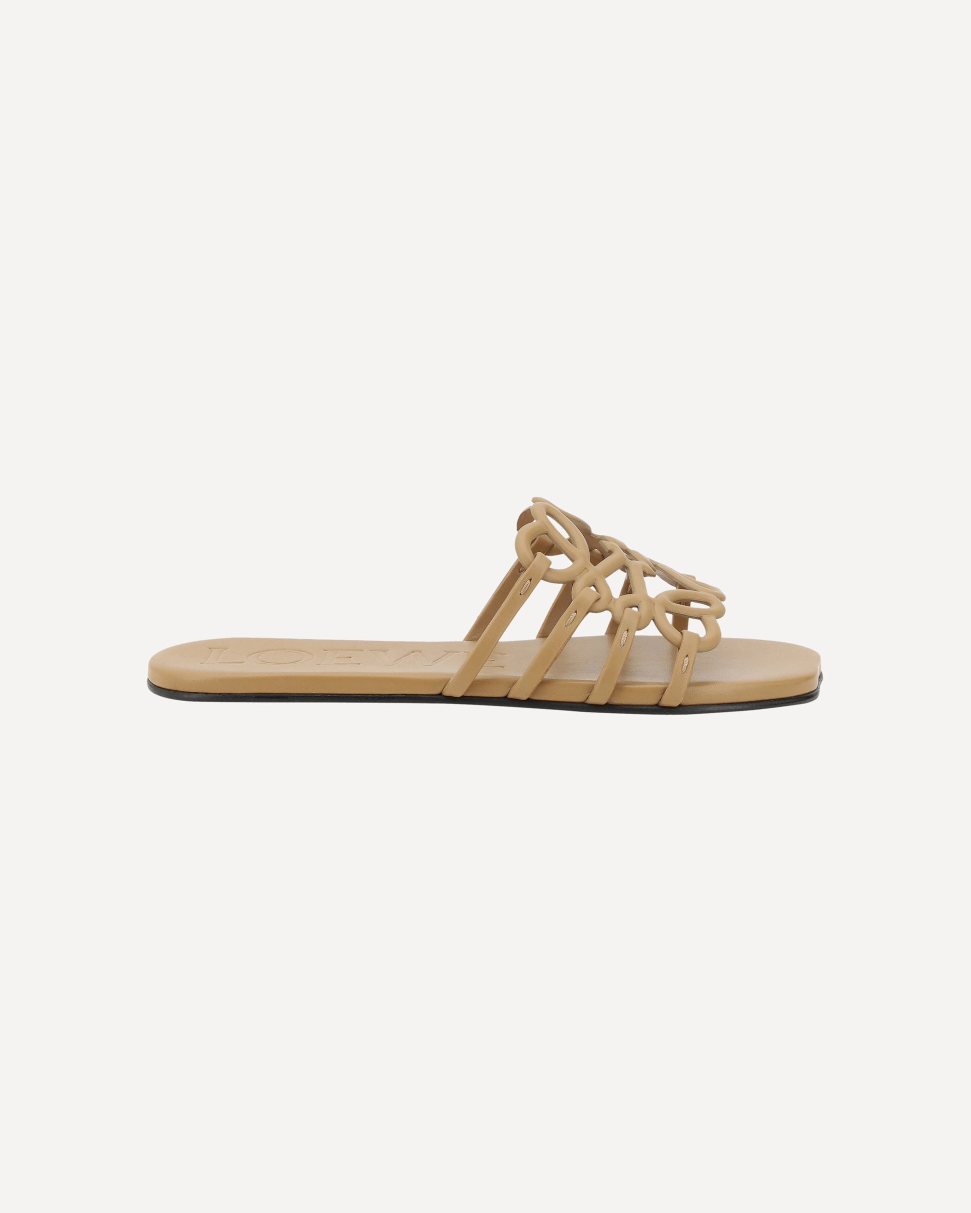 Loewe's leather Petal Anagram Sandals feature an asymmetrical toe that lends a distinctive touch to the design. The flat sole ensures comfort while walking, while the branded insole adds a luxurious detail. The front strap reproduces the brand's iconic Anagram with cut-out details, making these sandals a true style statement. A perfect balance between elegance and modernity.