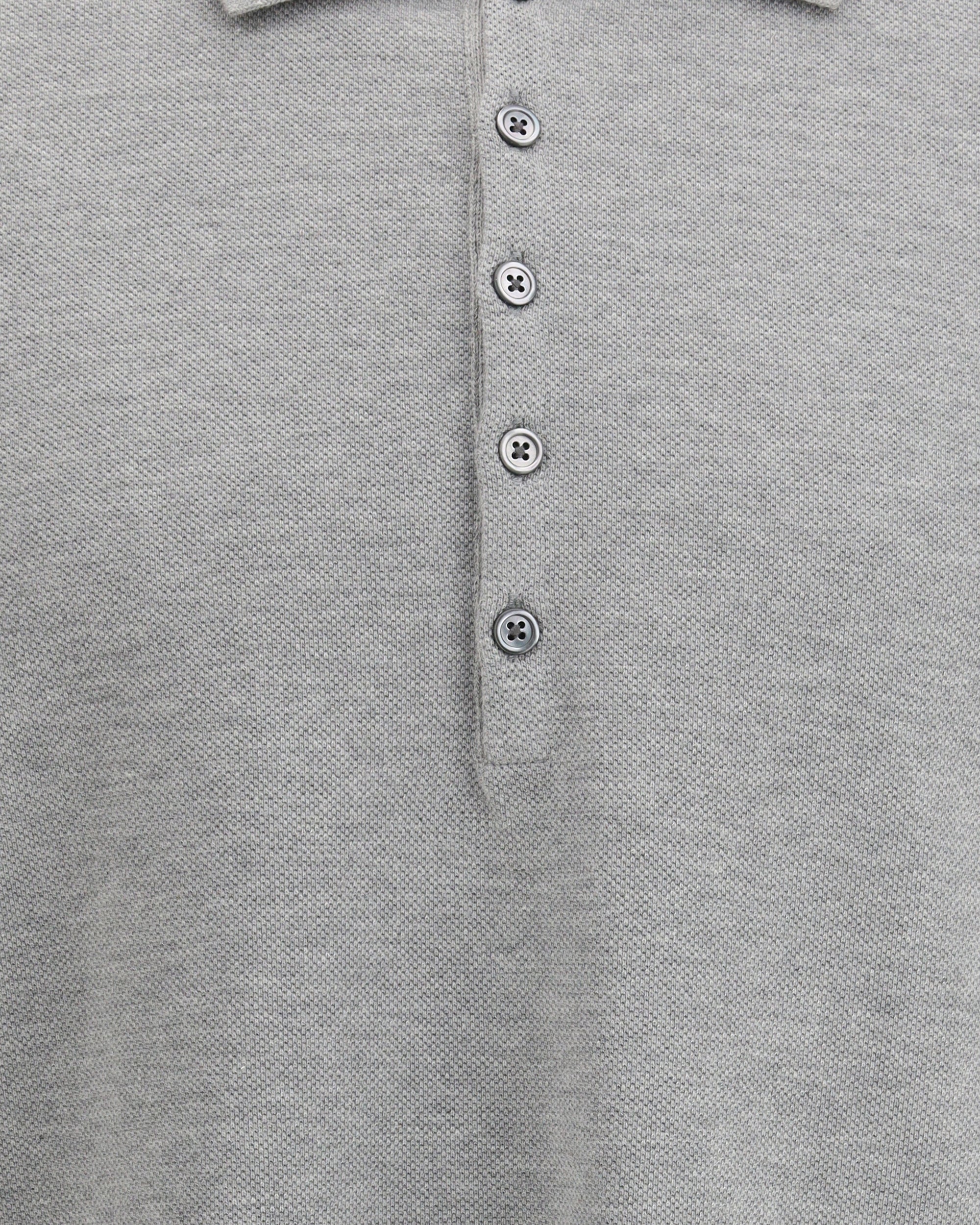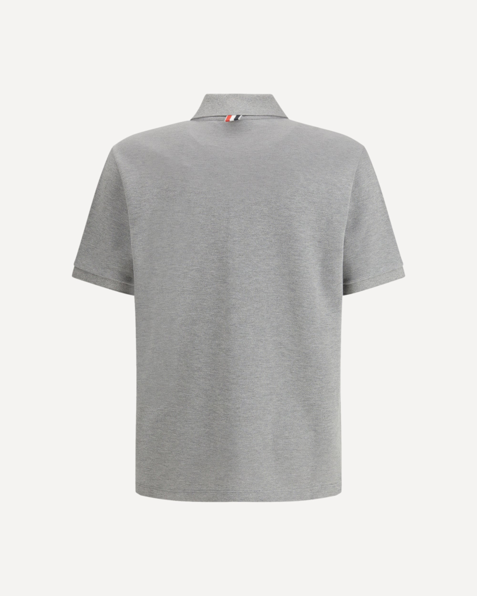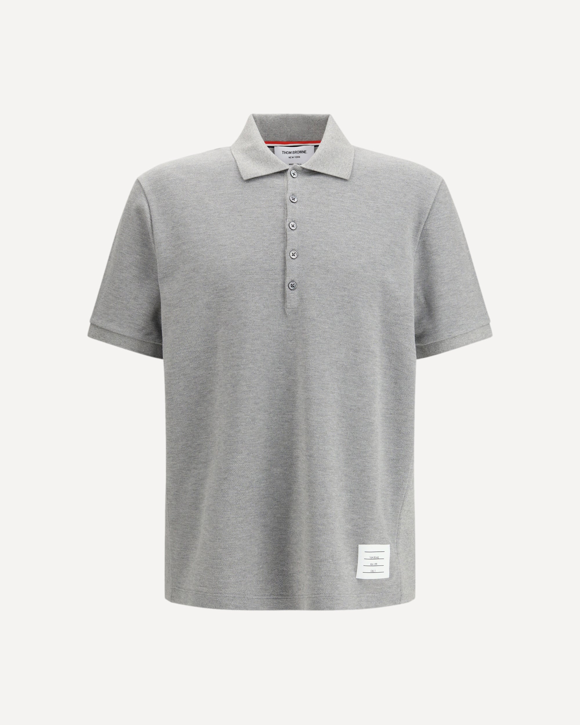 The Cotton Polo Sweater by Thom Browne features a classic collar and buttons on the front for a stylish and practical closure. The brand's iconic monogram patch applied to the front adds a distinctive touch. The iconic contrasting horizontal bands on the side panels recall the brand's signature style, creating a unique visual detail. A sophisticated and trendy garment, perfect for a casual-chic look.
