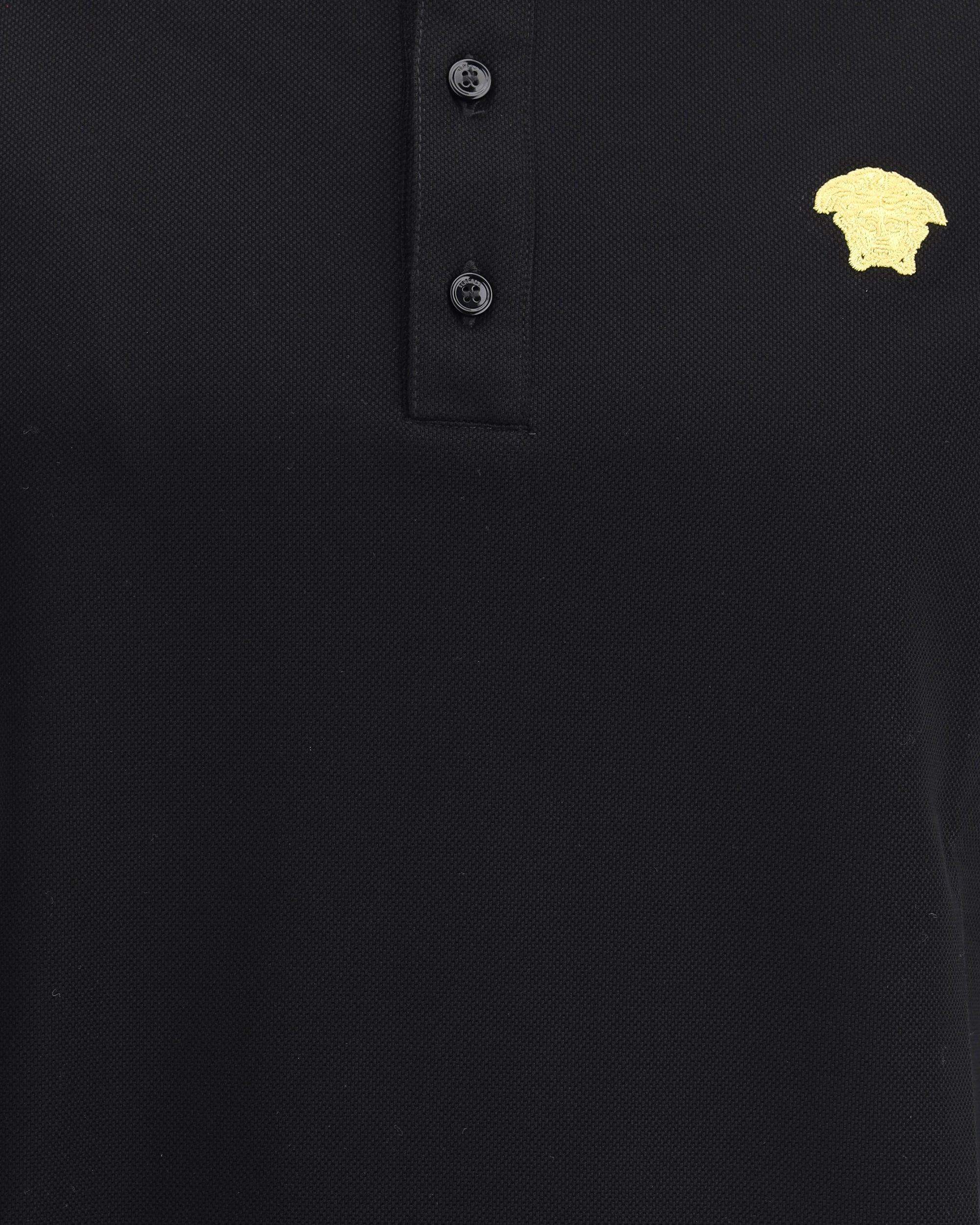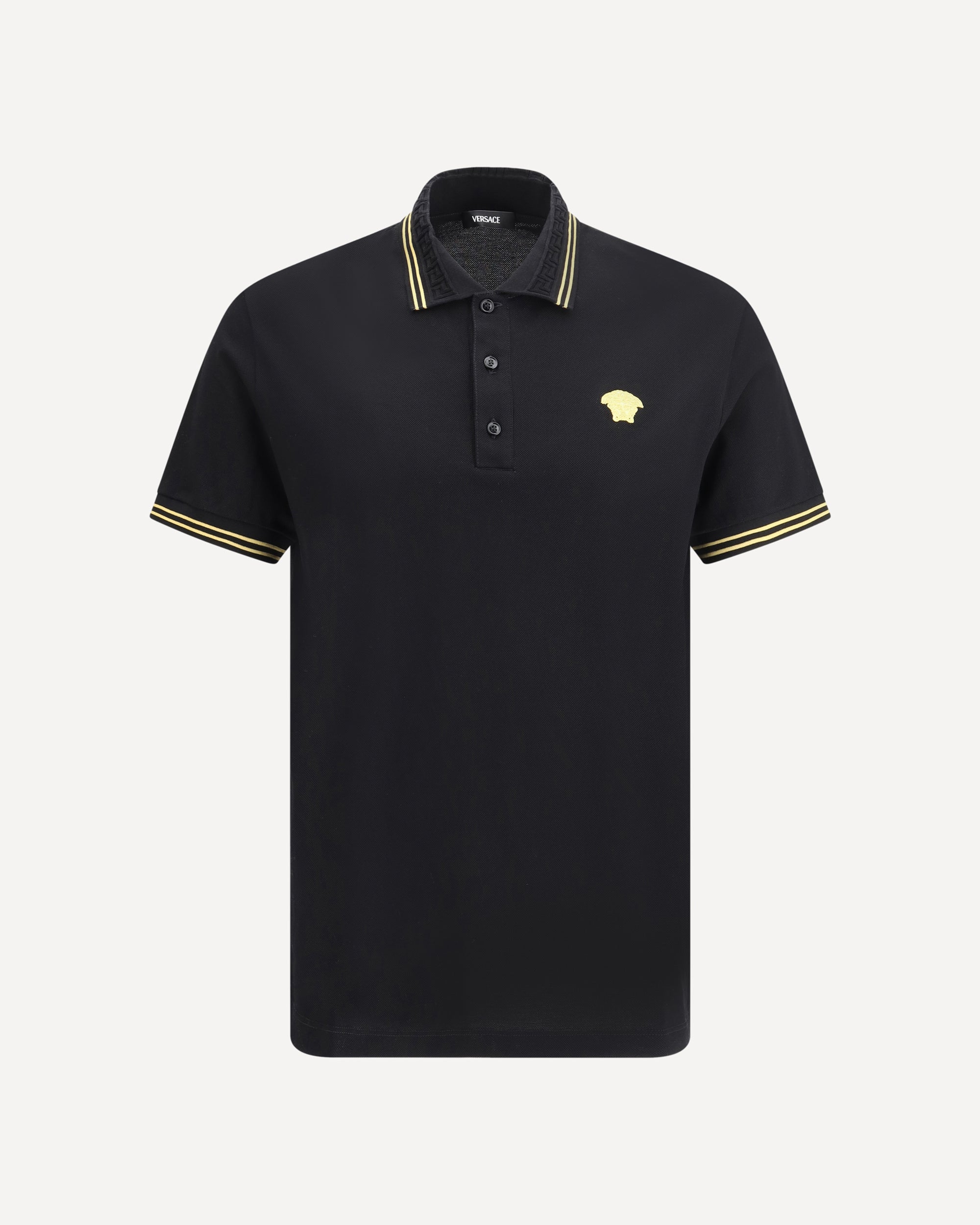The cotton Polo Shirt by Versace embodies a clean, refined style enhanced by iconic brand details. The classic ribbed collar and tonal front buttons create a sleek and versatile design, while the Versace logo patch applied on the front adds a distinctive touch. The regular fit ensures comfort and effortless elegance, making it a perfect everyday staple.