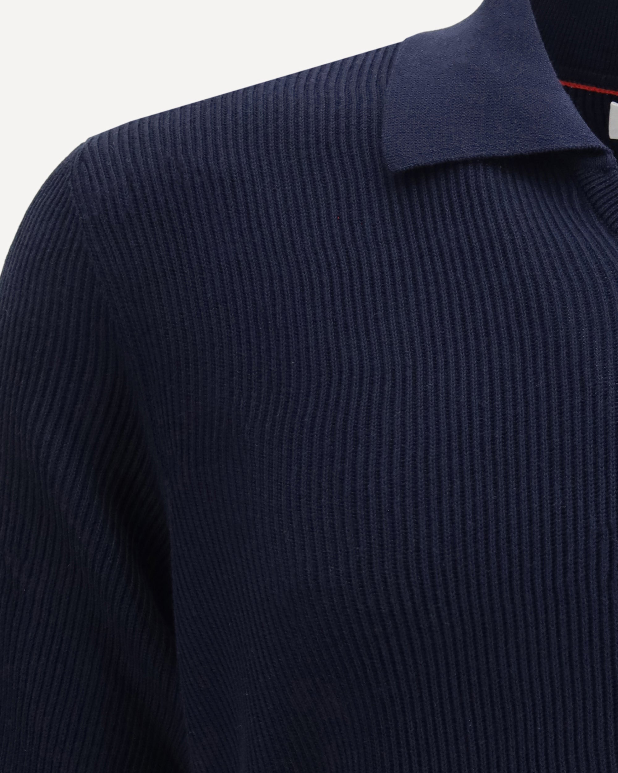 The cotton ribbed Polo Sweater by Brunello Cucinelli features a classic collar and V-neck, adding a touch of understated elegance. The all-over ribbed design lends texture to the fabric, giving the garment a comfortable feel and structured look.