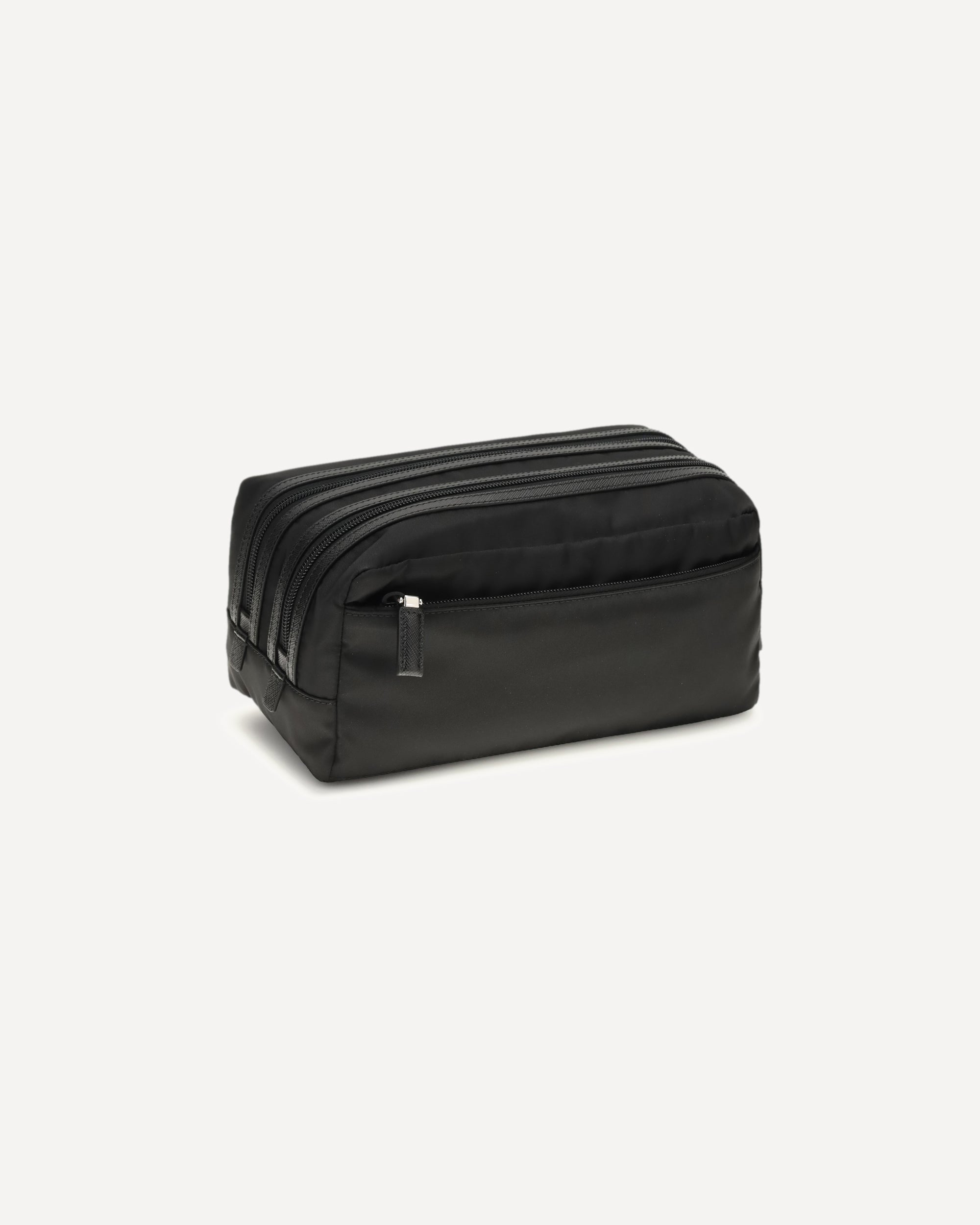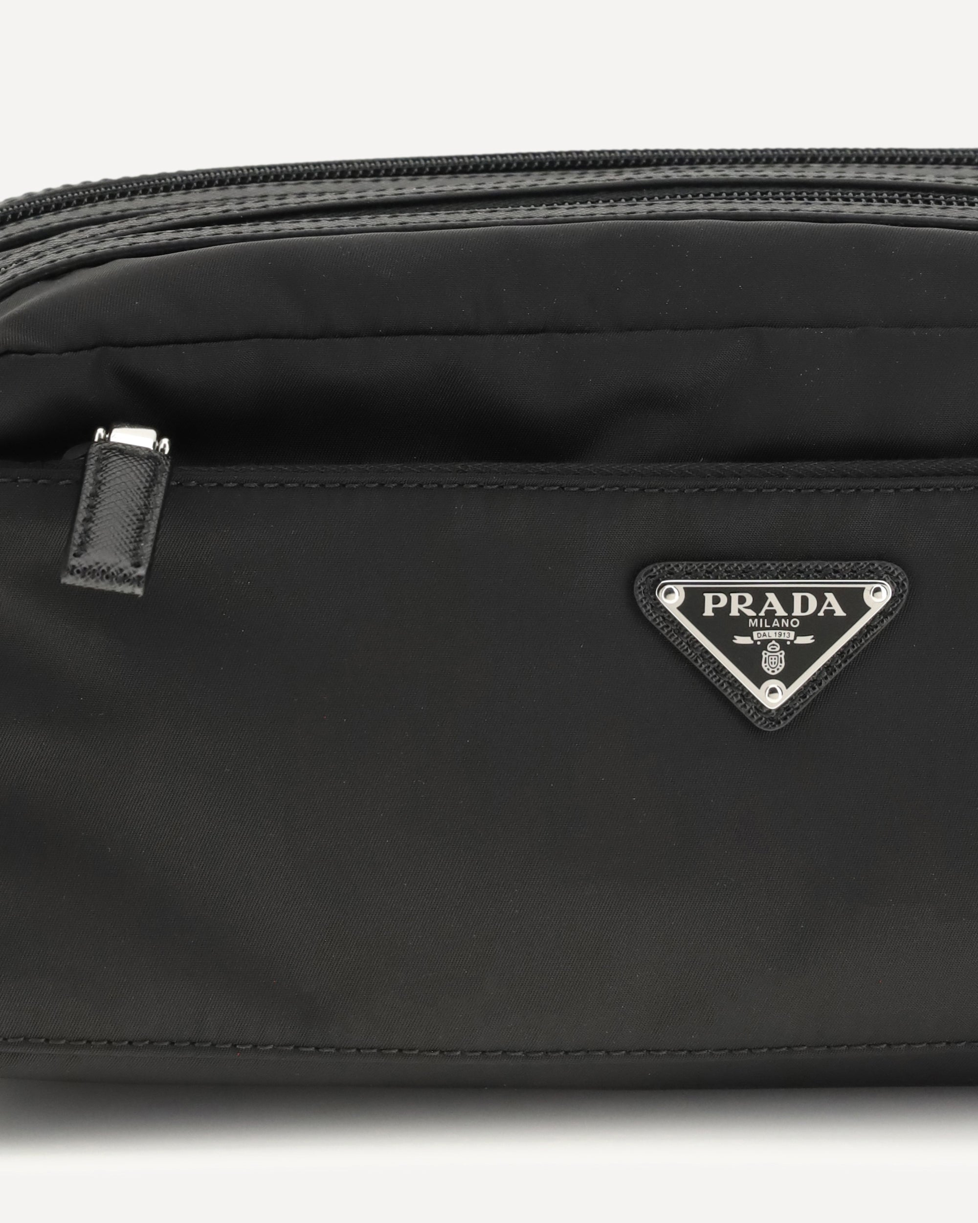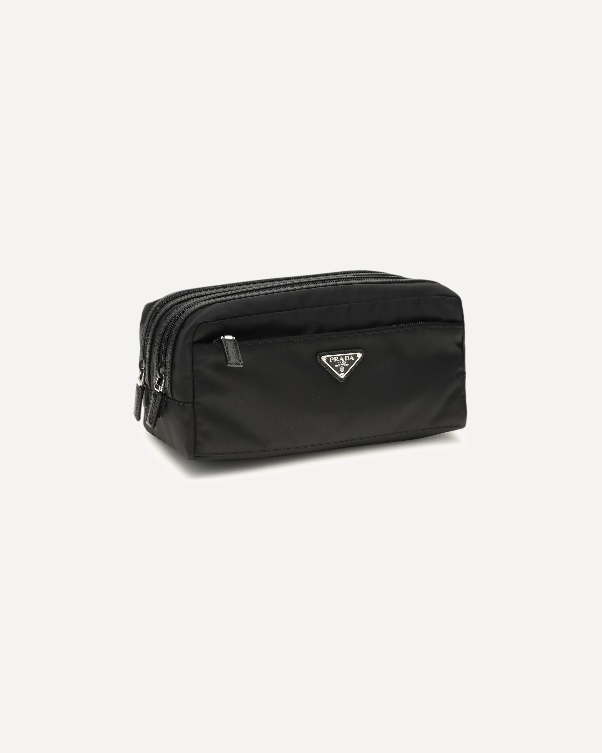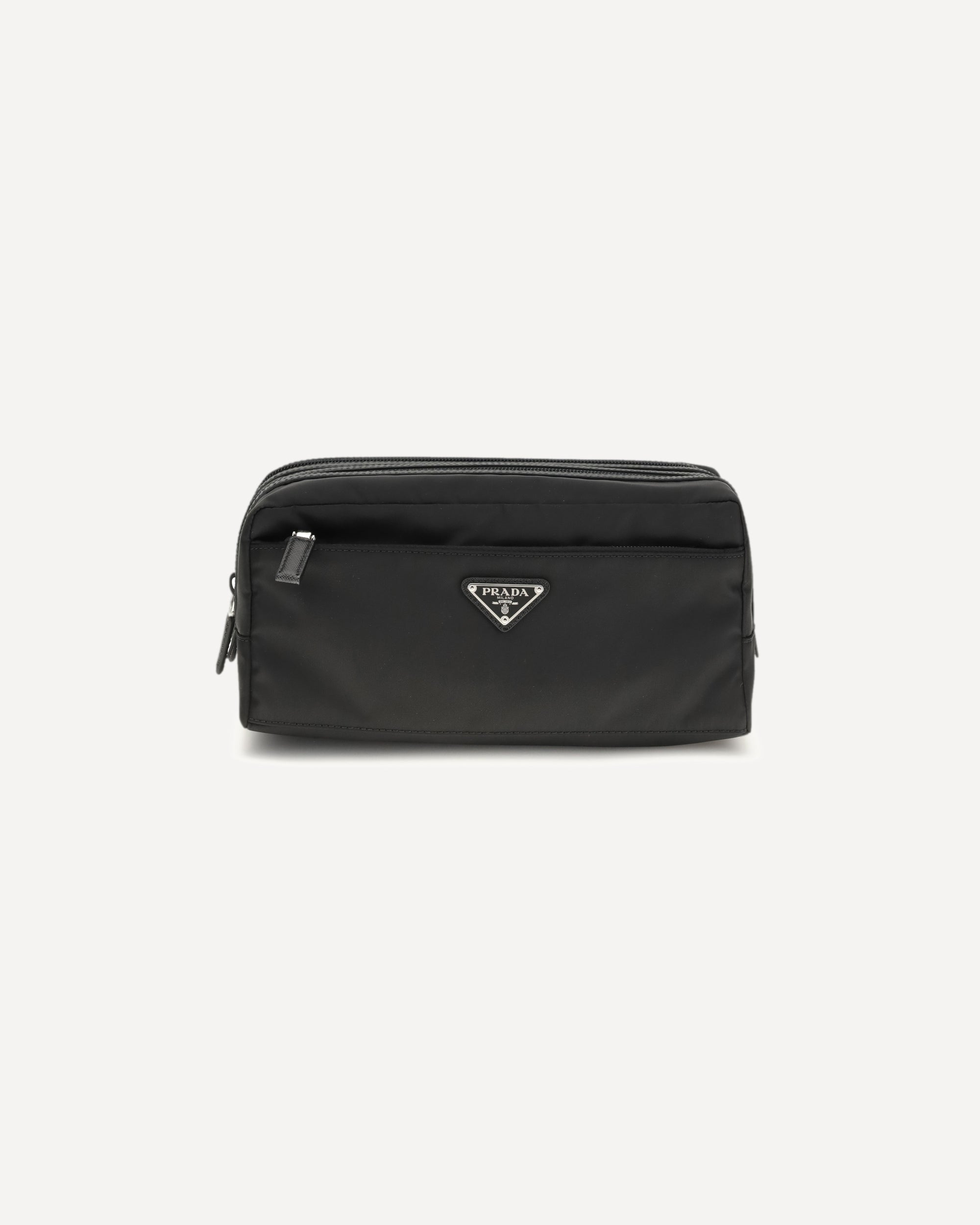The Re-Nylon Beauty Case by Prada combines elegance and functionality thanks to Saffiano leather inserts and the iconic logoed metal triangle on the front. It features a zippered closure, a front pocket and a back pocket both zippered, and a lined interior complete with an additional zippered pocket to better organize every essential.