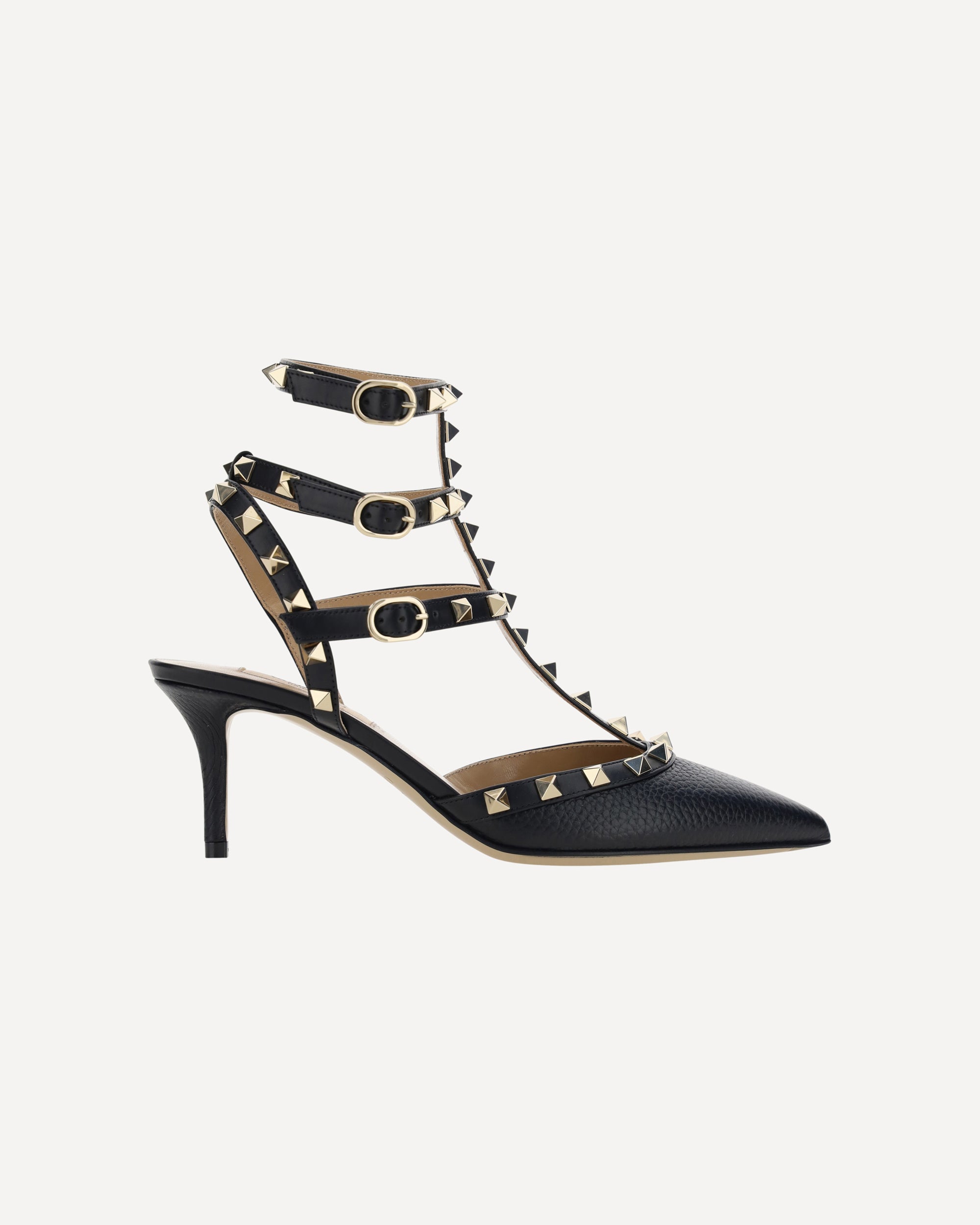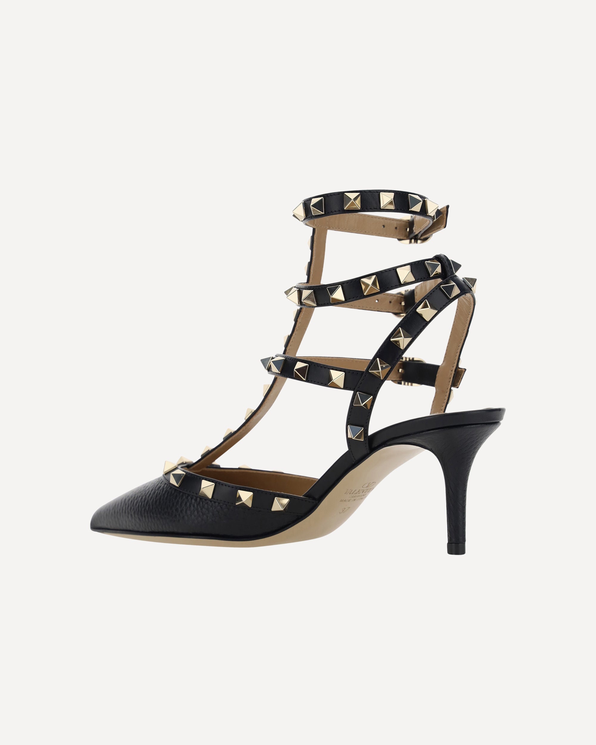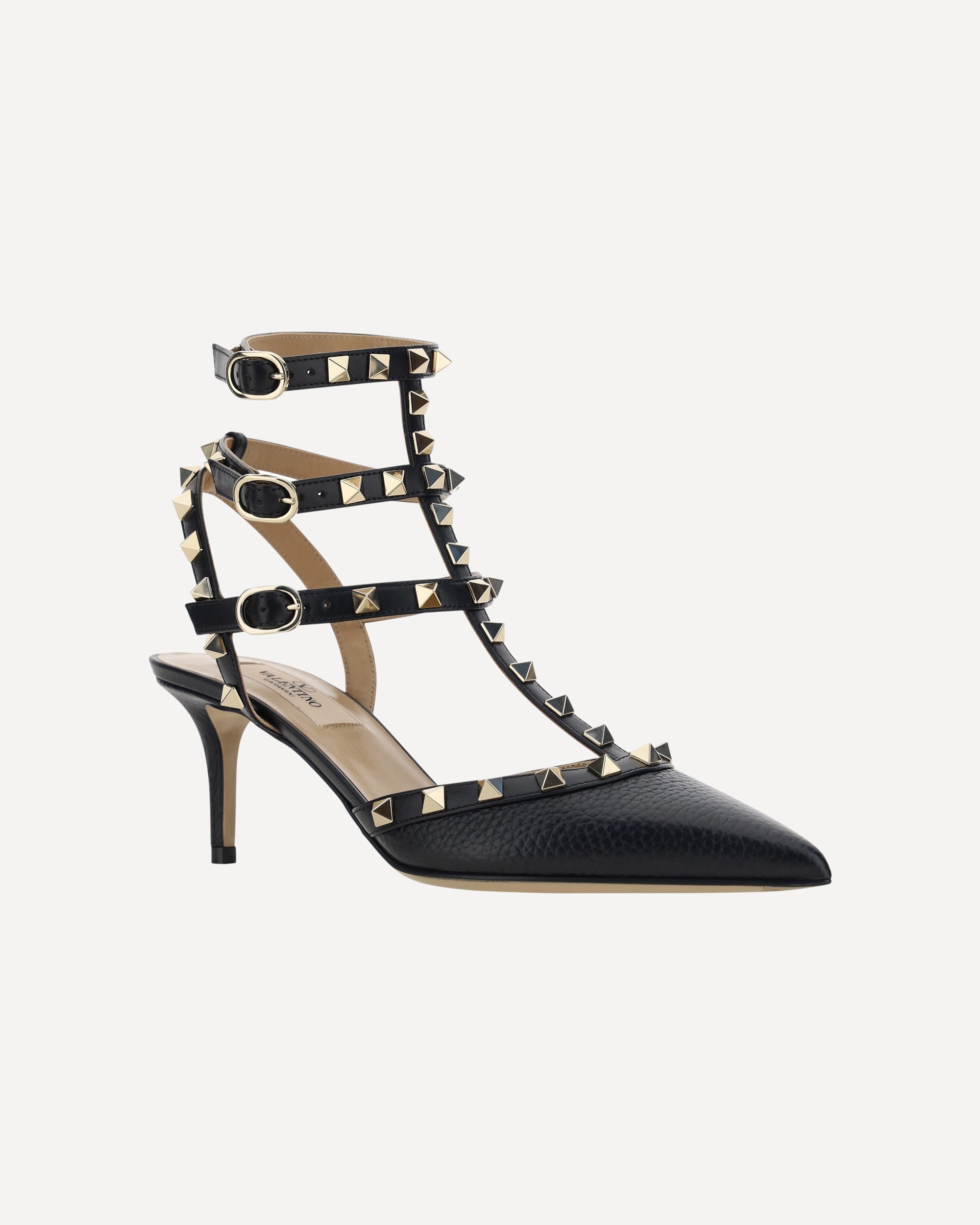 Leather Rockstud Pumps by Valentino Garavani, elongated geometric toe, adjustable ankle lap strap closure with triple side buckle fastening, leather stiletto heel, iconic all-over brand applied studs, logoed insole.