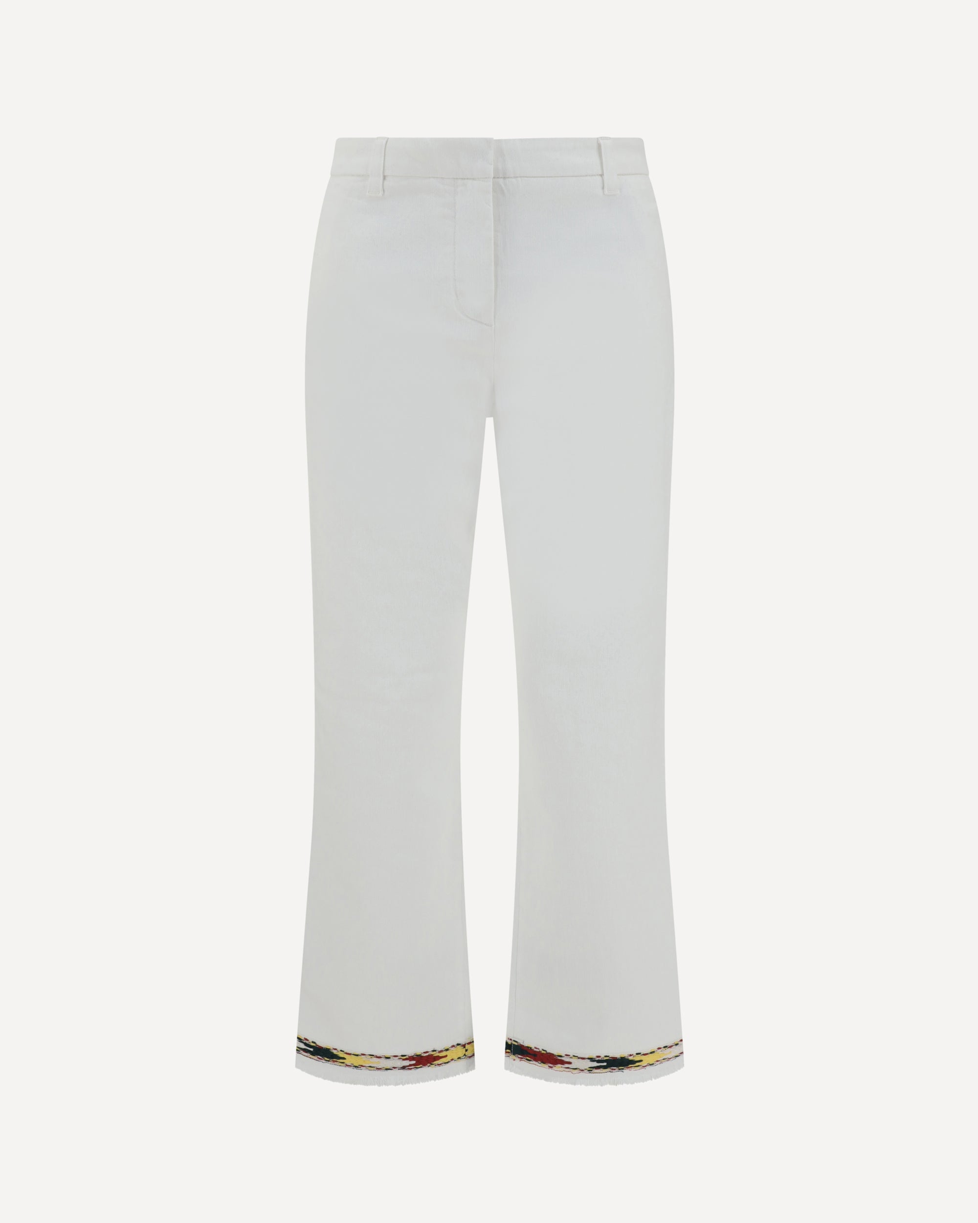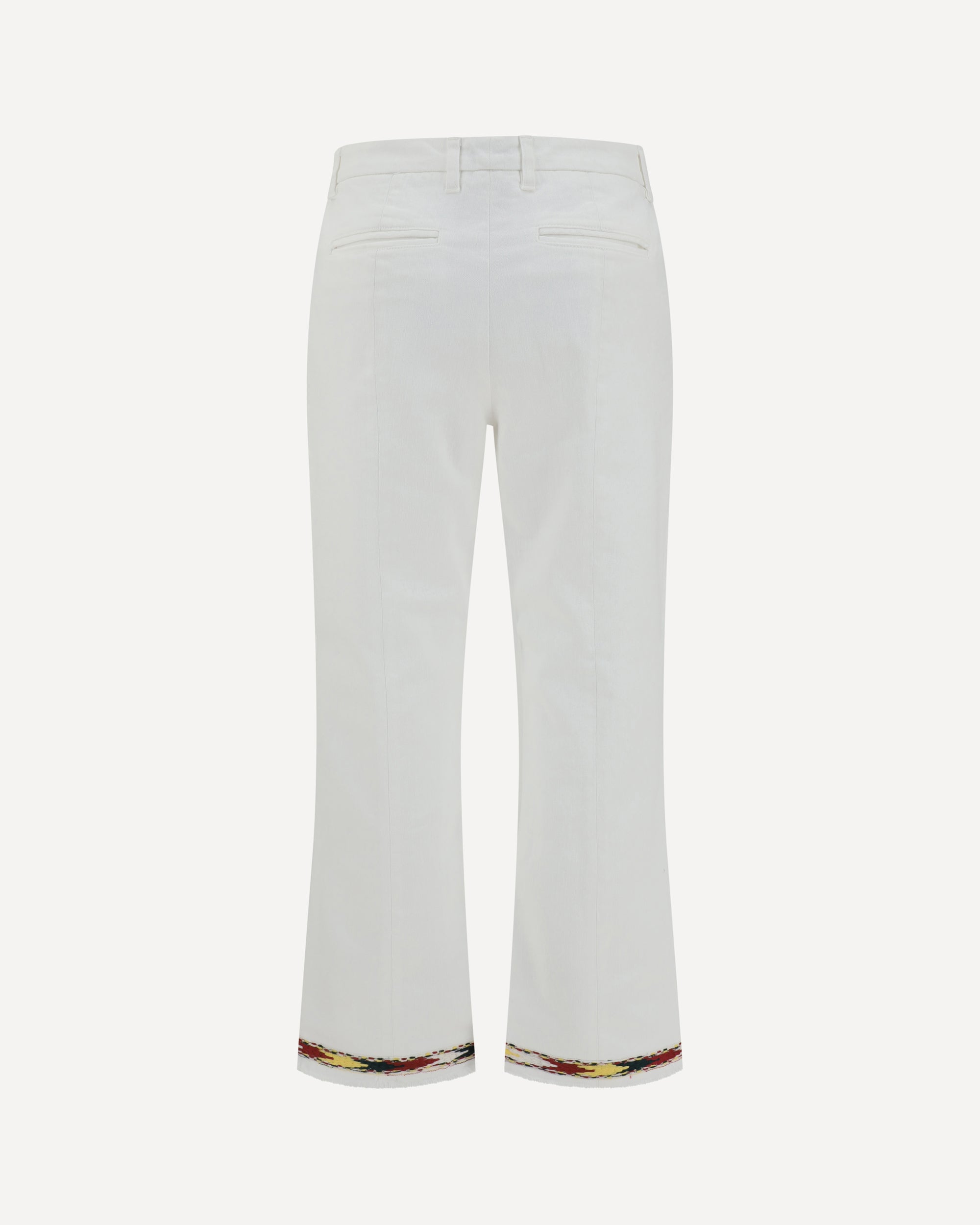 The Ross Pants by True Royal are a modern and distinctive garment, featuring a straight design that offers a comfortable, streamlined fit. The front zipper and hook-and-eye closure adds a touch of understated elegance, while belt loops at the waistband allow you to further customize the fit with a belt of your choice. Frayed and embroidered hems are a stylistic detail that gives the pants a touch of originality and character, making them perfect for a casual-chic yet sophisticated look.