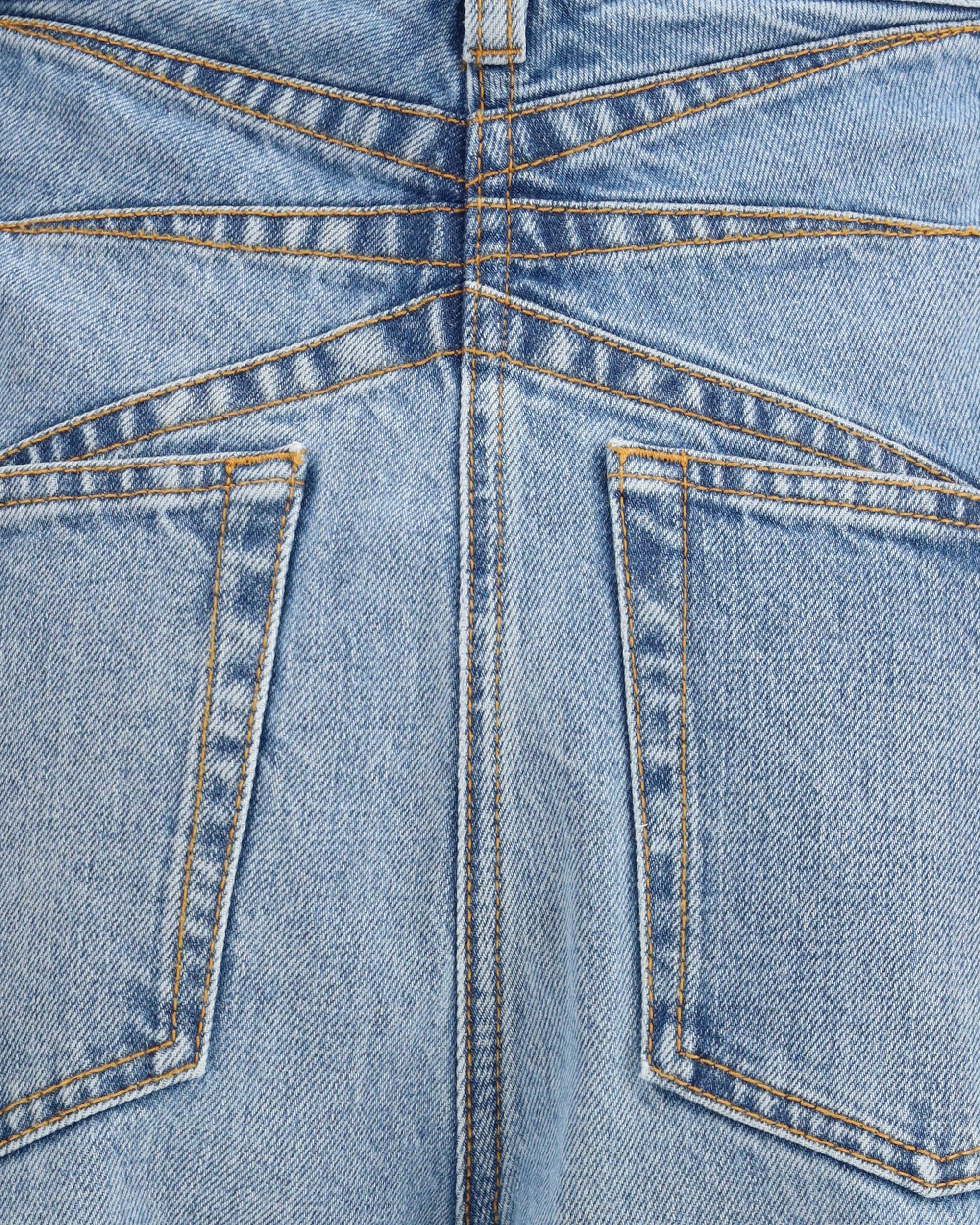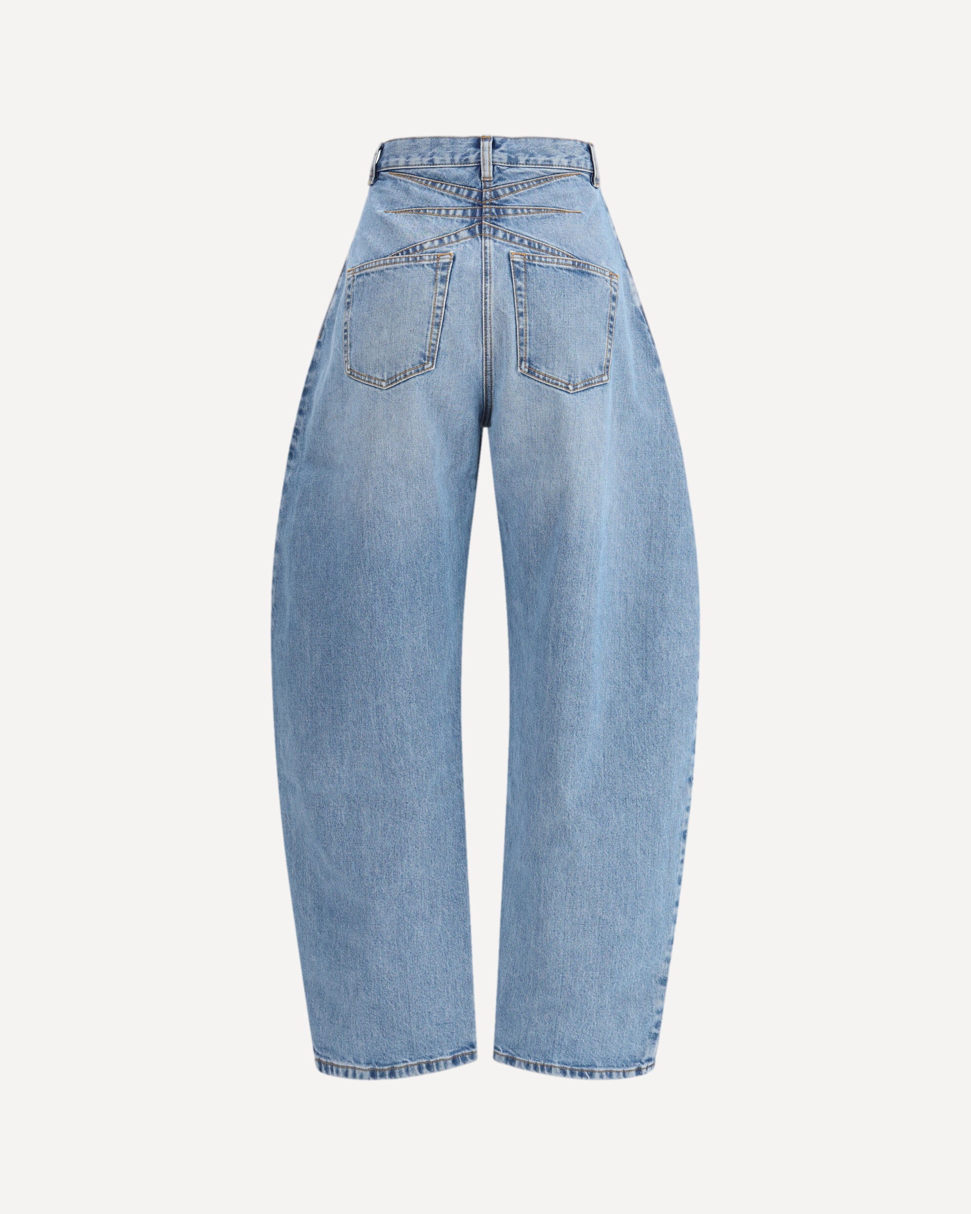 The rounded denim Trousers by Alaïa are crafted from blue délavé denim and feature the brand’s signature rounded-leg silhouette with a high-rise waist. The zip and button closure and silver-tone metal details add a refined touch, while the five-pocket construction preserves a classic feel. The three iconic Alaïa back pleats complete the design, enhancing its sculptural elegance.