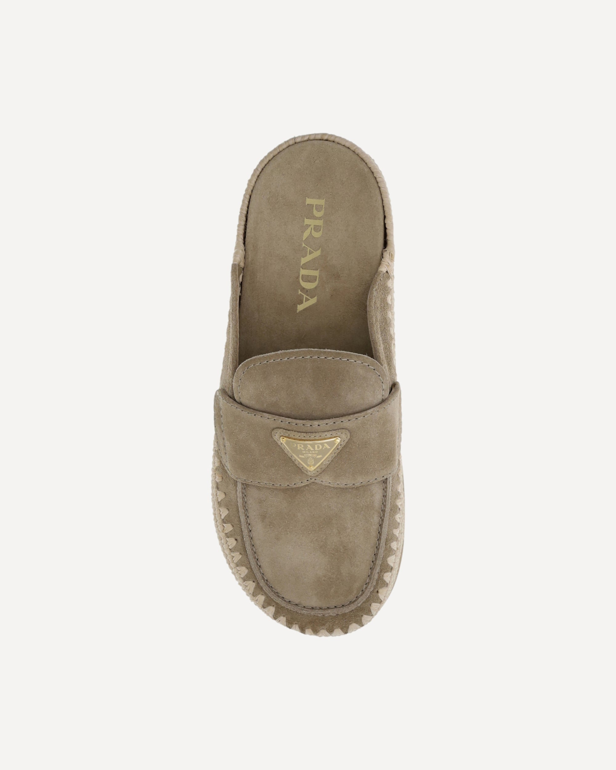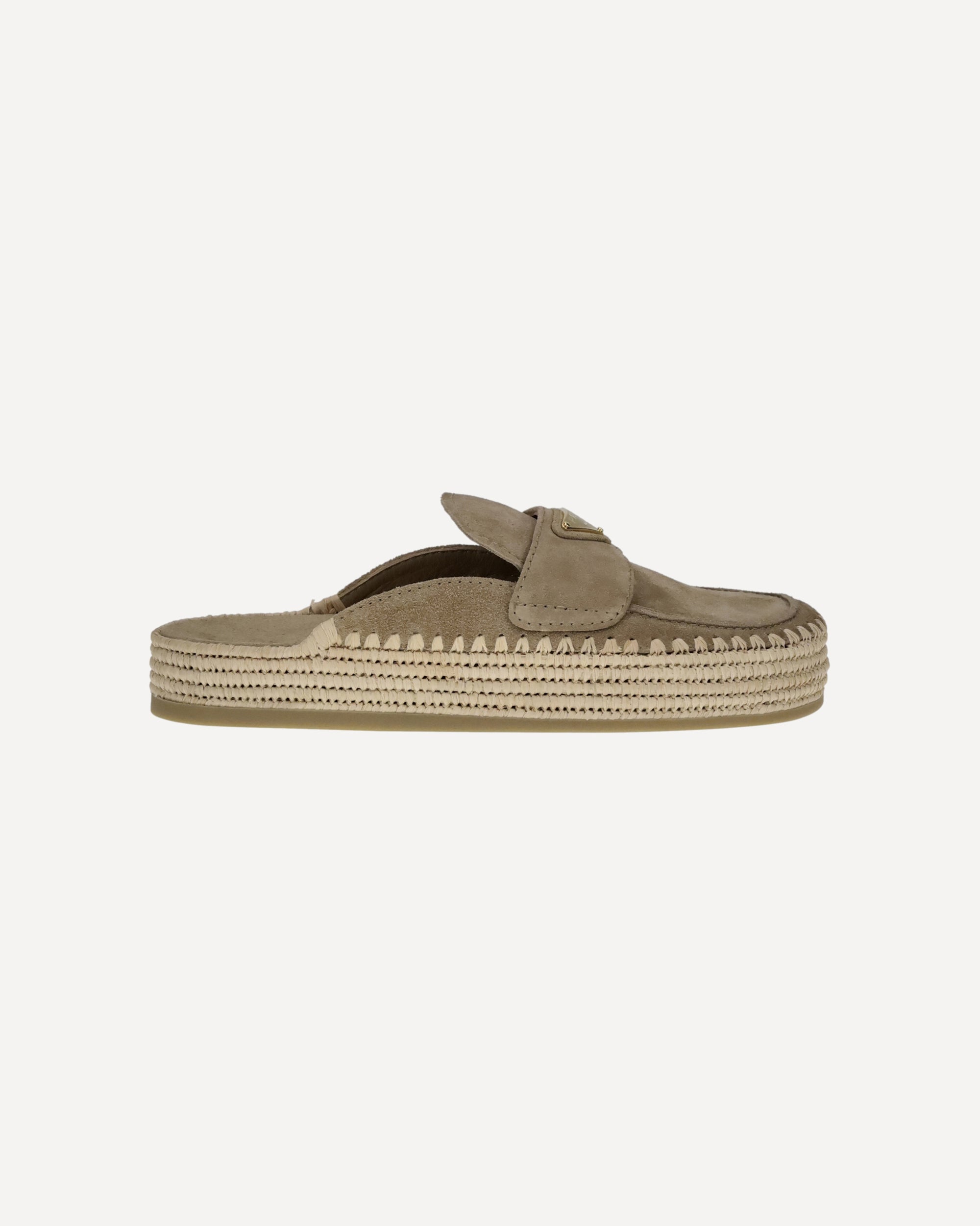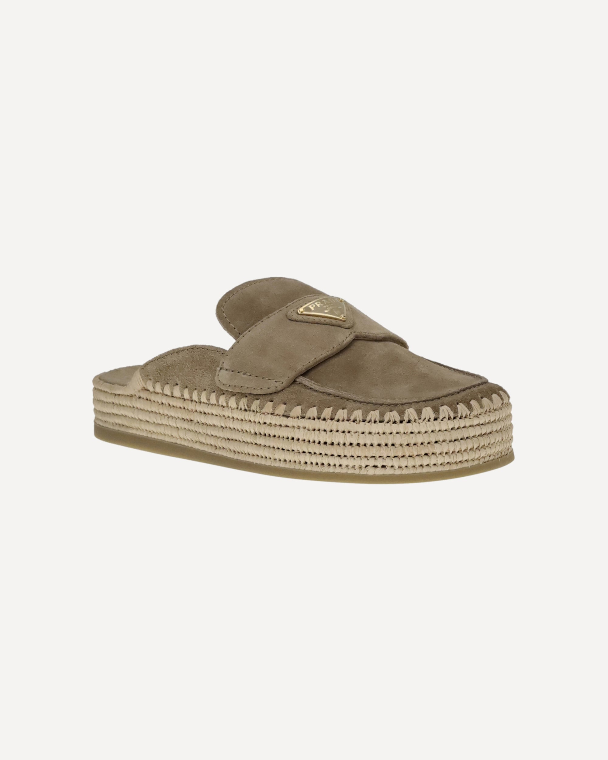 Prada's Suede Mules combine handcrafted elegance with contemporary comfort. Crafted from soft suede, they feature a refined raffia woven construction that evokes a sophisticated summer aesthetic. The enameled metal triangle logo on the front signs the design with an iconic touch. A 10-mm rubber sole and a geometrically line tread pattern complete the design, providing grip and stability.