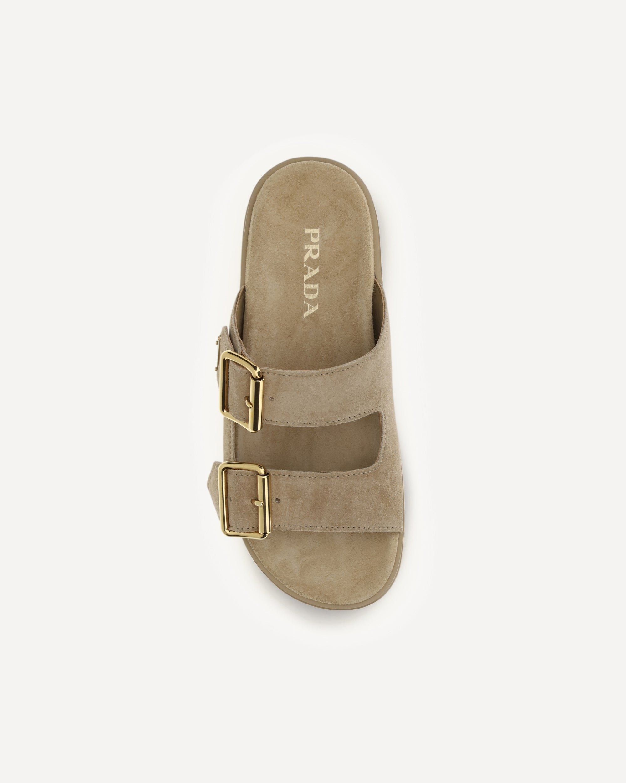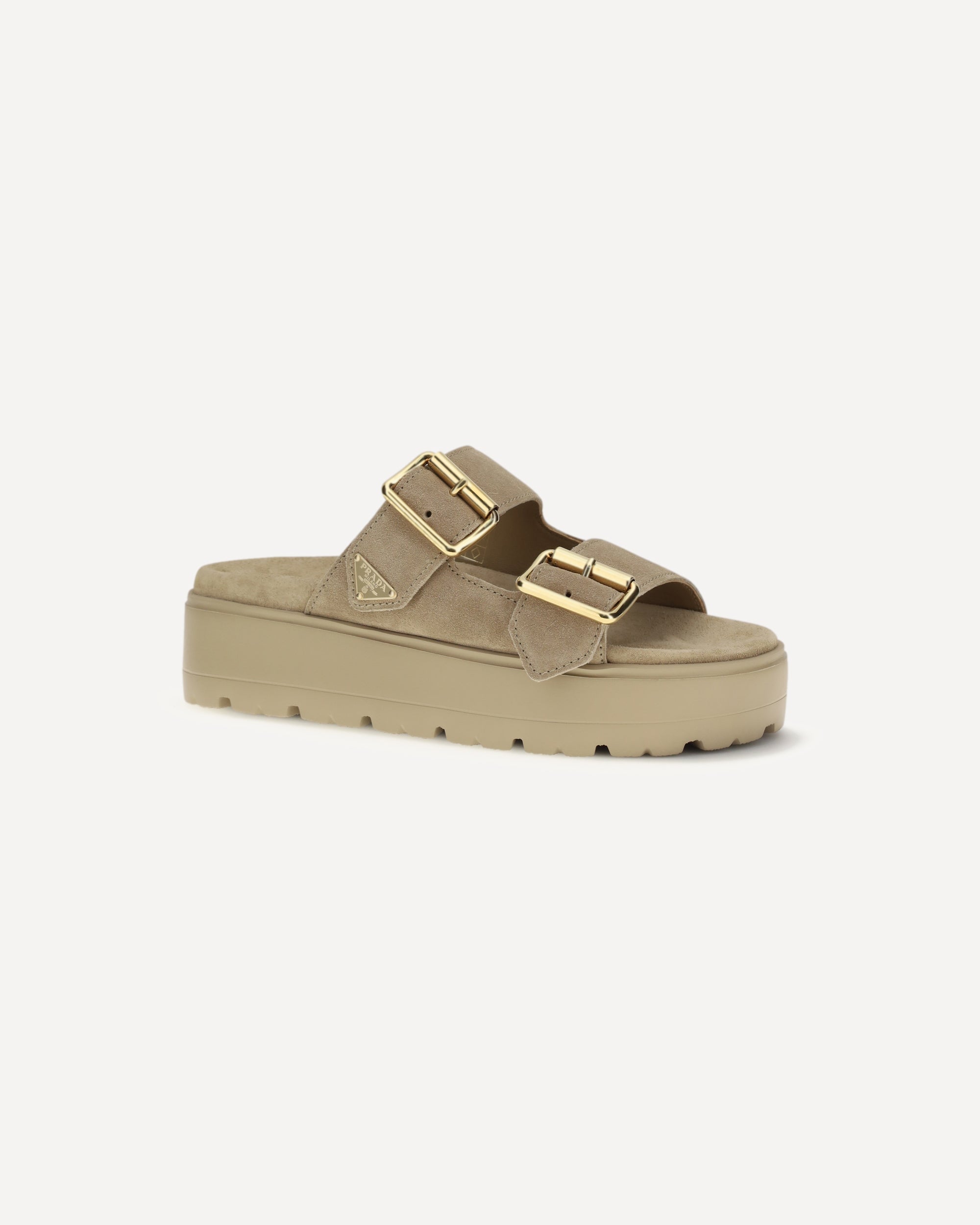 The platform Sandals by Prada are a perfect blend of modernity and boldness. Crafted from soft suede, these sandals stand out for their two buckles on the front, which add a touch of bold and practical style. The chunky platform sole gives them a gritty, contemporary look while ensuring comfort and height. Another distinctive signature is the iconic triangular plaque on one of the buckles, expressing Prada's unmistakable DNA.