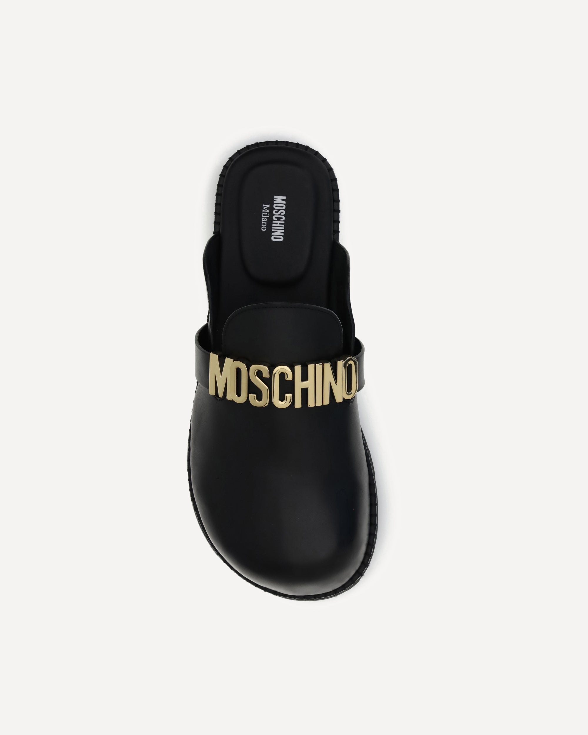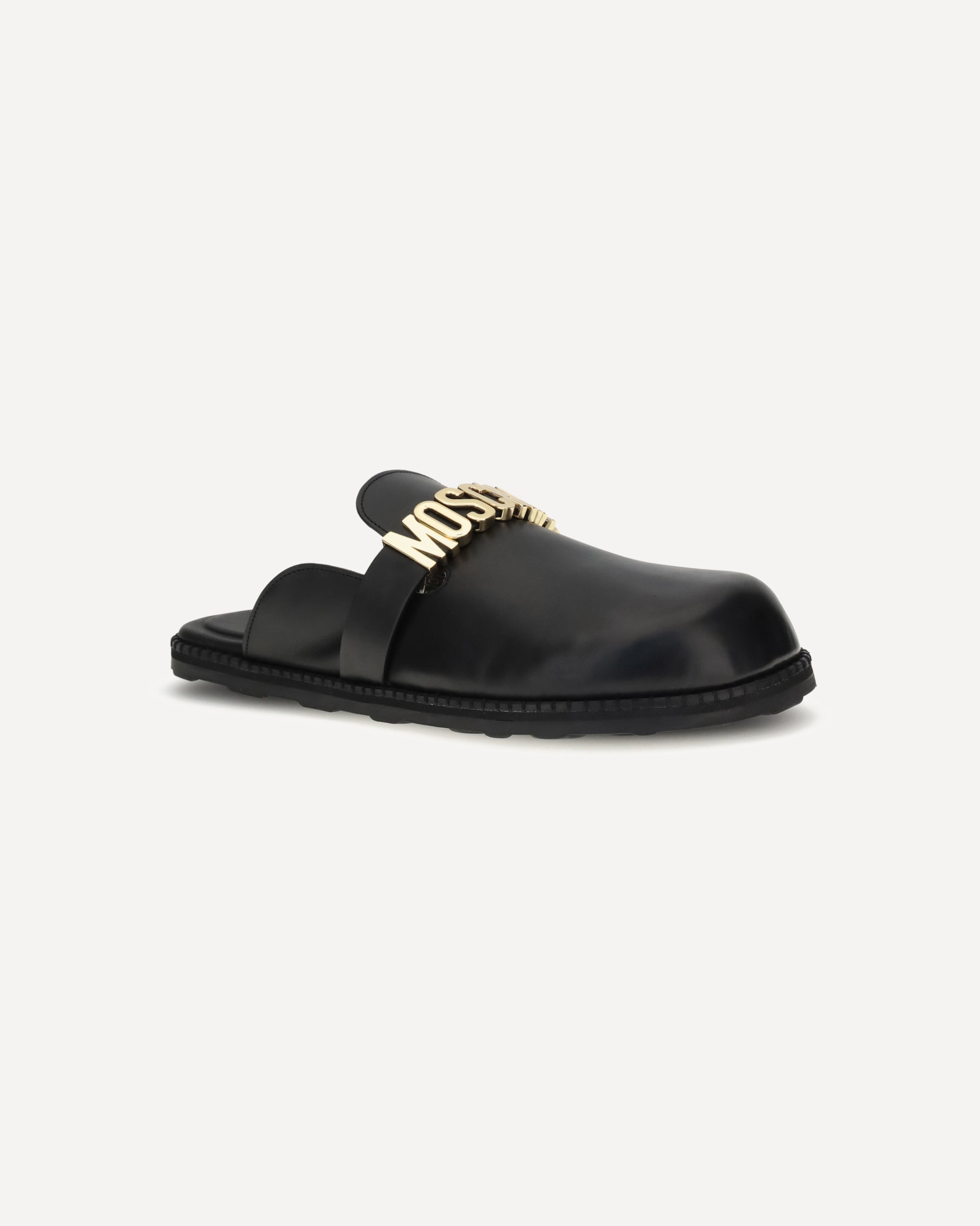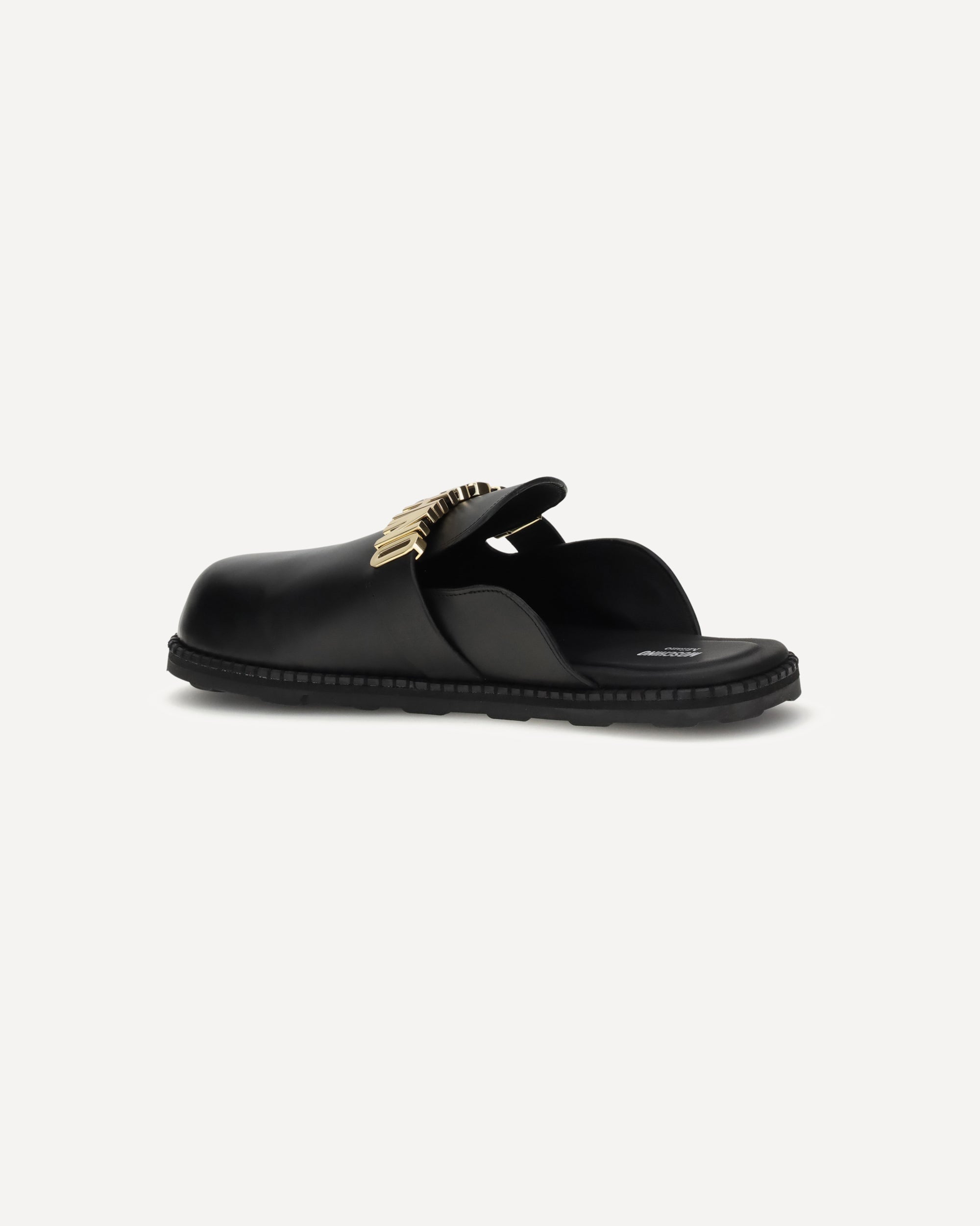 Moschino's logo Mules combine essential lines and iconic details. Featuring a rounded toe and a logo insole, they feature a golden logo plaque on the upper that gives a distinctive and glamorous touch. A versatile model, perfect to complete every look with personality.