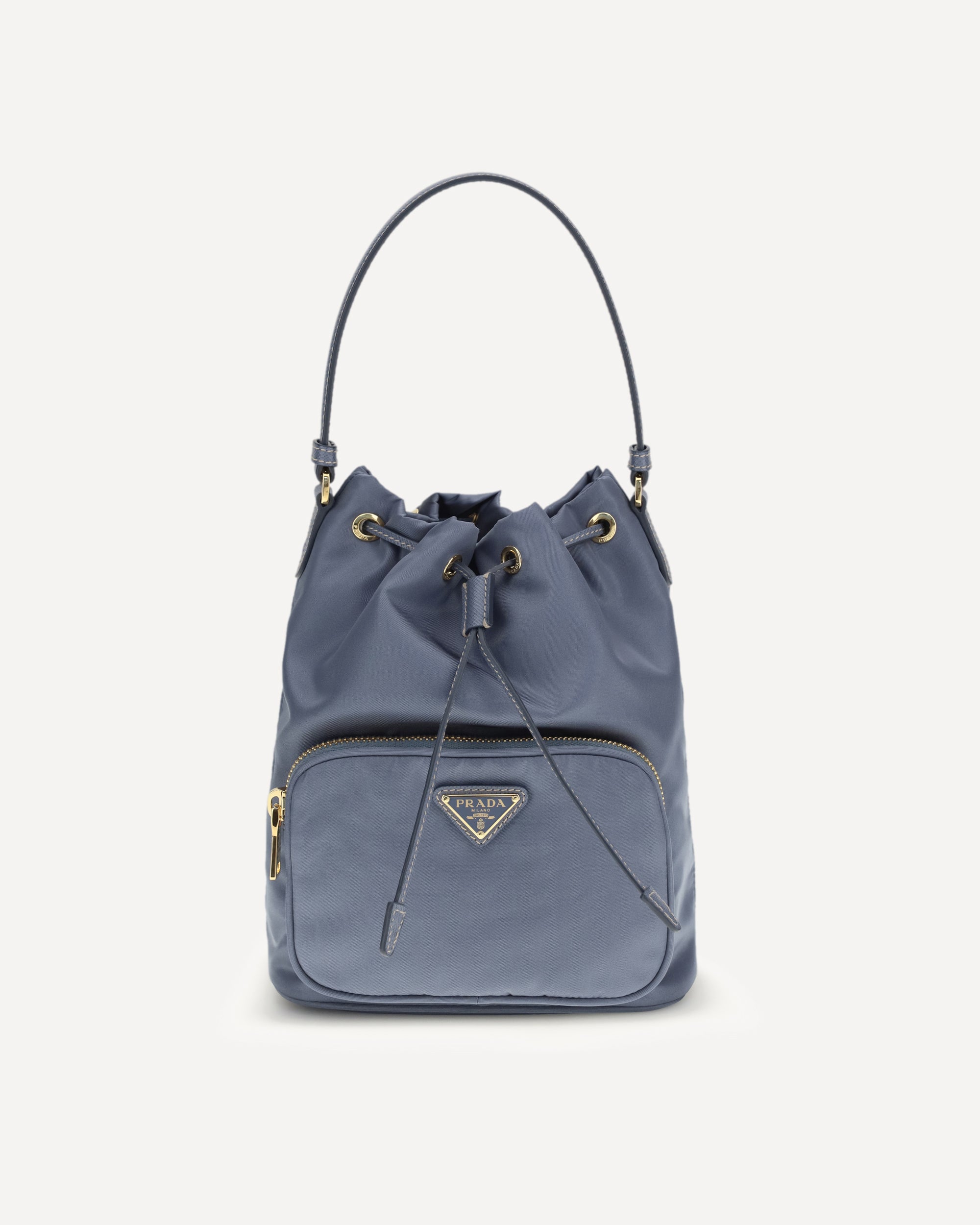 The re-nylon Bucket Bag by Prada is a perfect blend of sustainability and contemporary style. Made of the innovative regenerated Re-Nylon fabric, it expresses the brand's commitment to responsible elegance without sacrificing its distinctive aesthetic. The leather handle, along with the adjustable and removable long shoulder strap allows for different wearing modes. Equipped with a zippered pocket and metal trim, the bag is embellished with the Prada logo on enameled metal triangle, applied on the front pocket as an iconic signature. The drawstring closure completes the functional and refined design, making it an ideal accessory for those seeking a balanced mix of practicality, elegance and innovation.