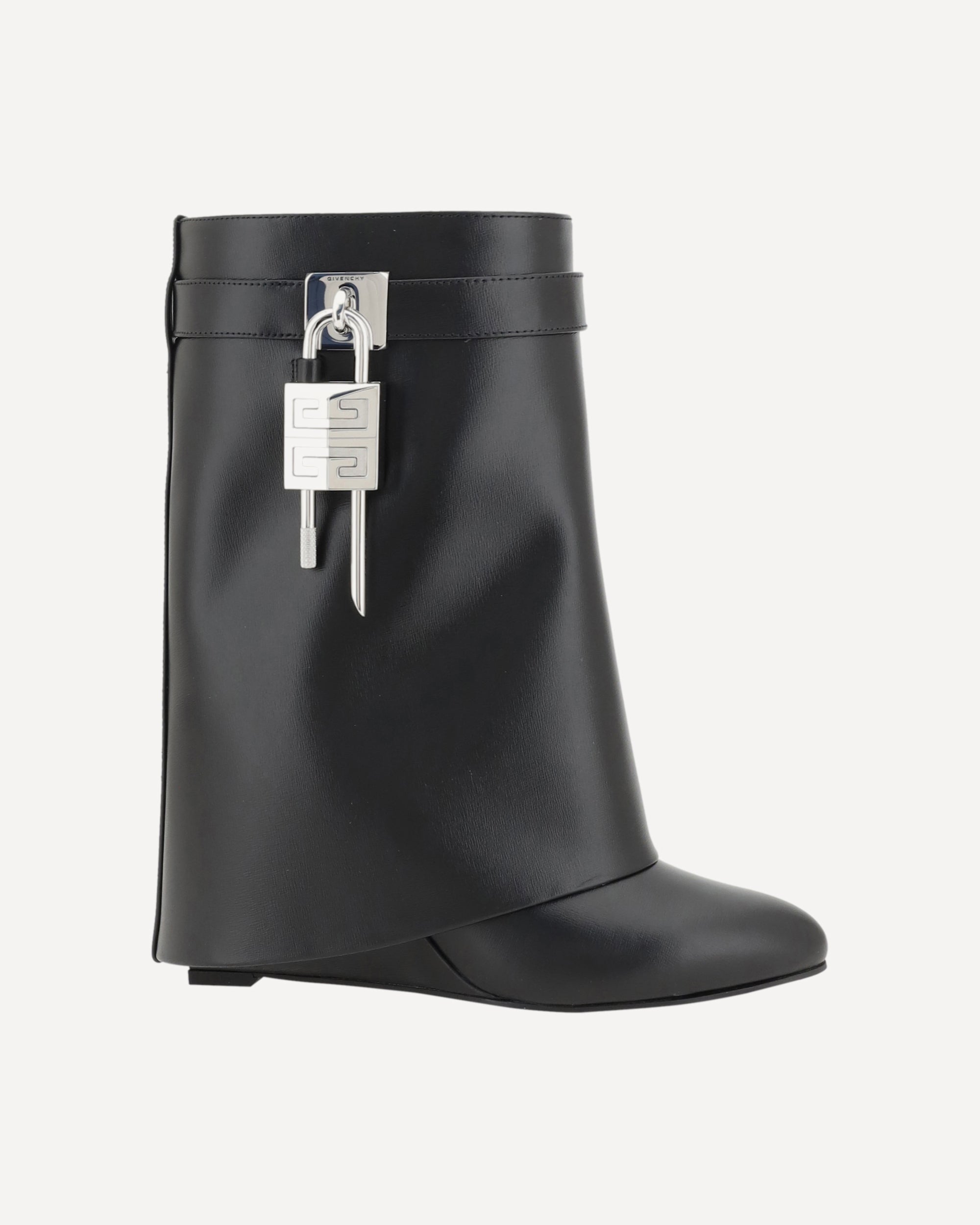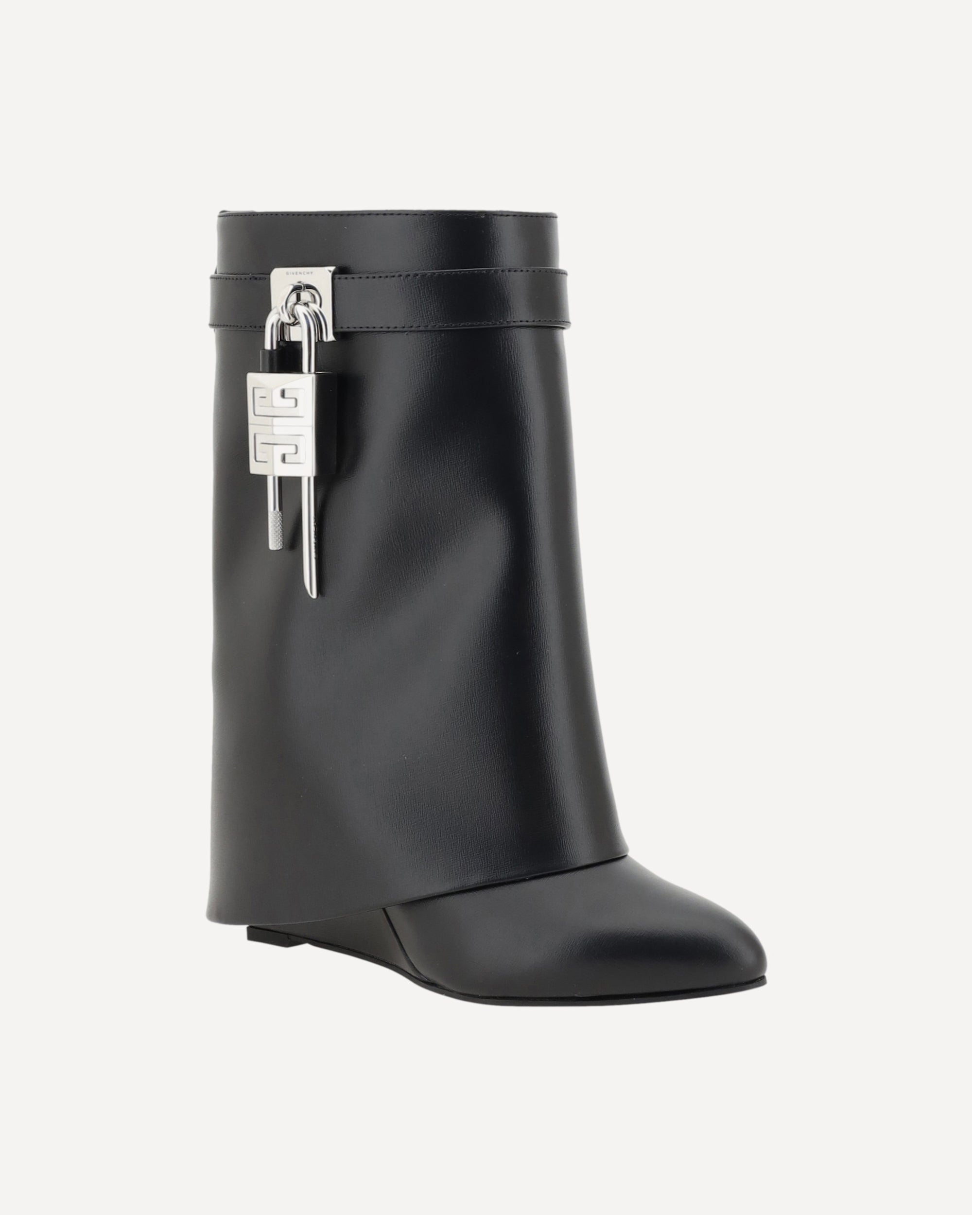 Givenchy's Shark Lock leather Ankle Boots stand out for their bold and sophisticated design. Featuring an almond toe and a distinctive trouser-style shaft, they combine structured elegance with a contemporary spirit. The padlock detail on the side panel adds an iconic and distinctive touch, while the wedge heel ensures momentum and stability.