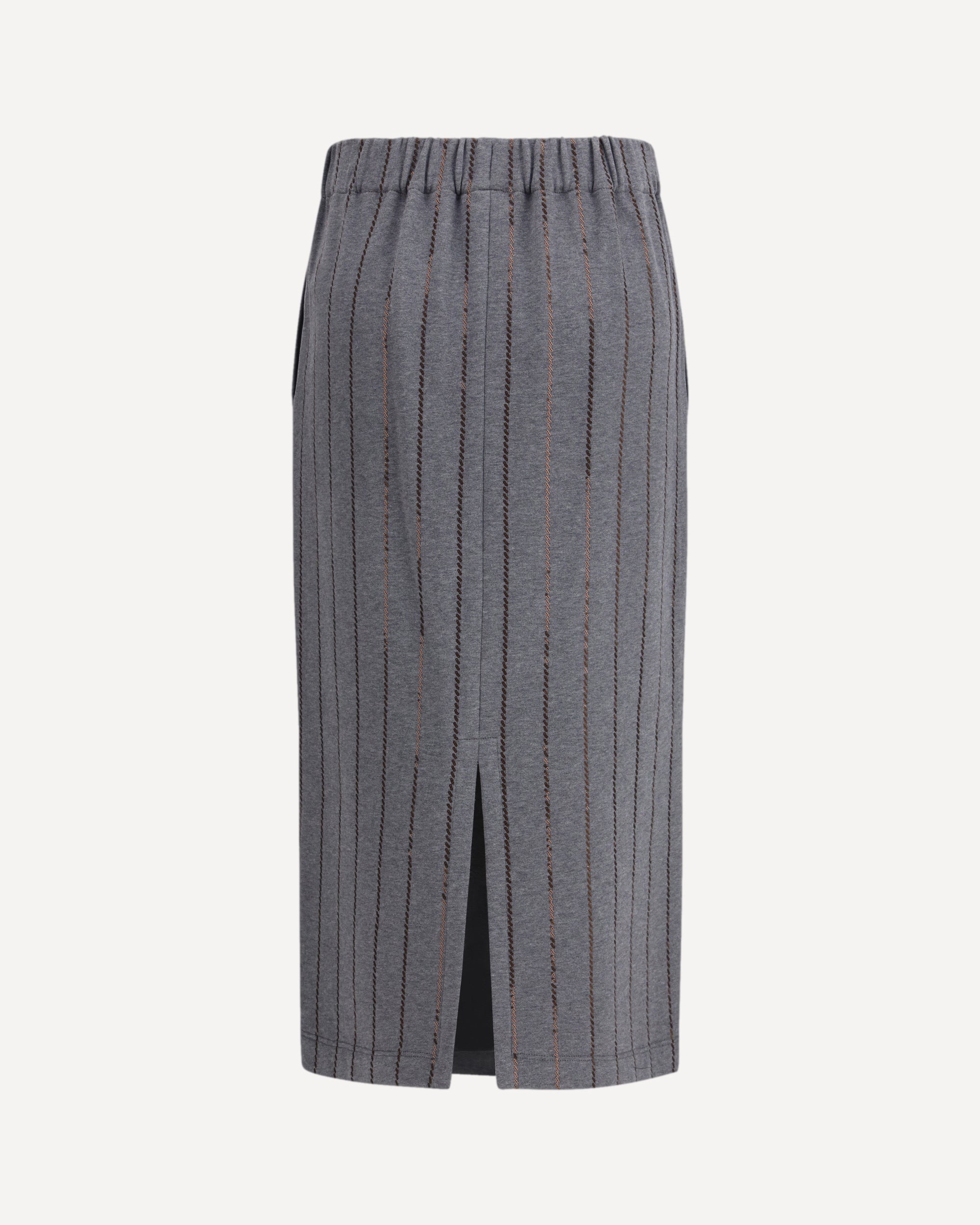 The Embellished Midi Pencil Skirt by Brunello Cucinelli features a fitted silhouette designed to follow the body with refined structure. The elasticated waistband offers comfort and a secure fit, while the rear slit ensures ease of movement without compromising the skirt’s clean line. The surface is enriched with signature embellishments applied with precise craftsmanship, adding subtle brightness and a polished finish. A versatile, understated piece that brings a touch of artisanal elegance to modern dressing.