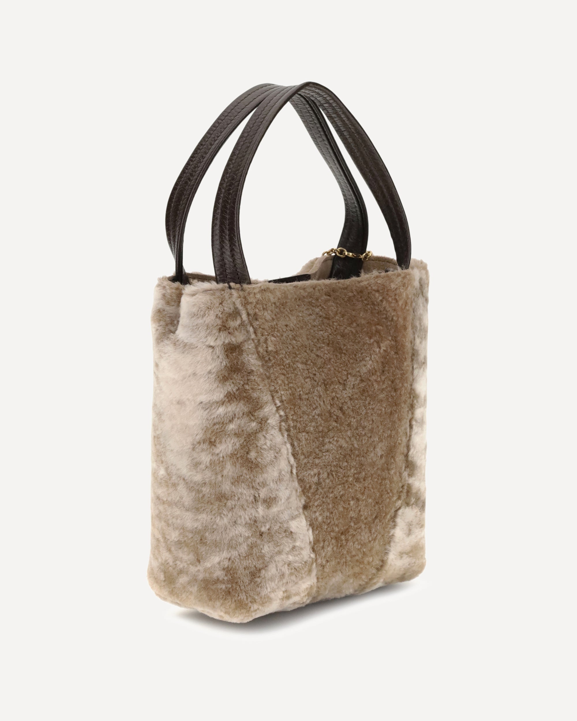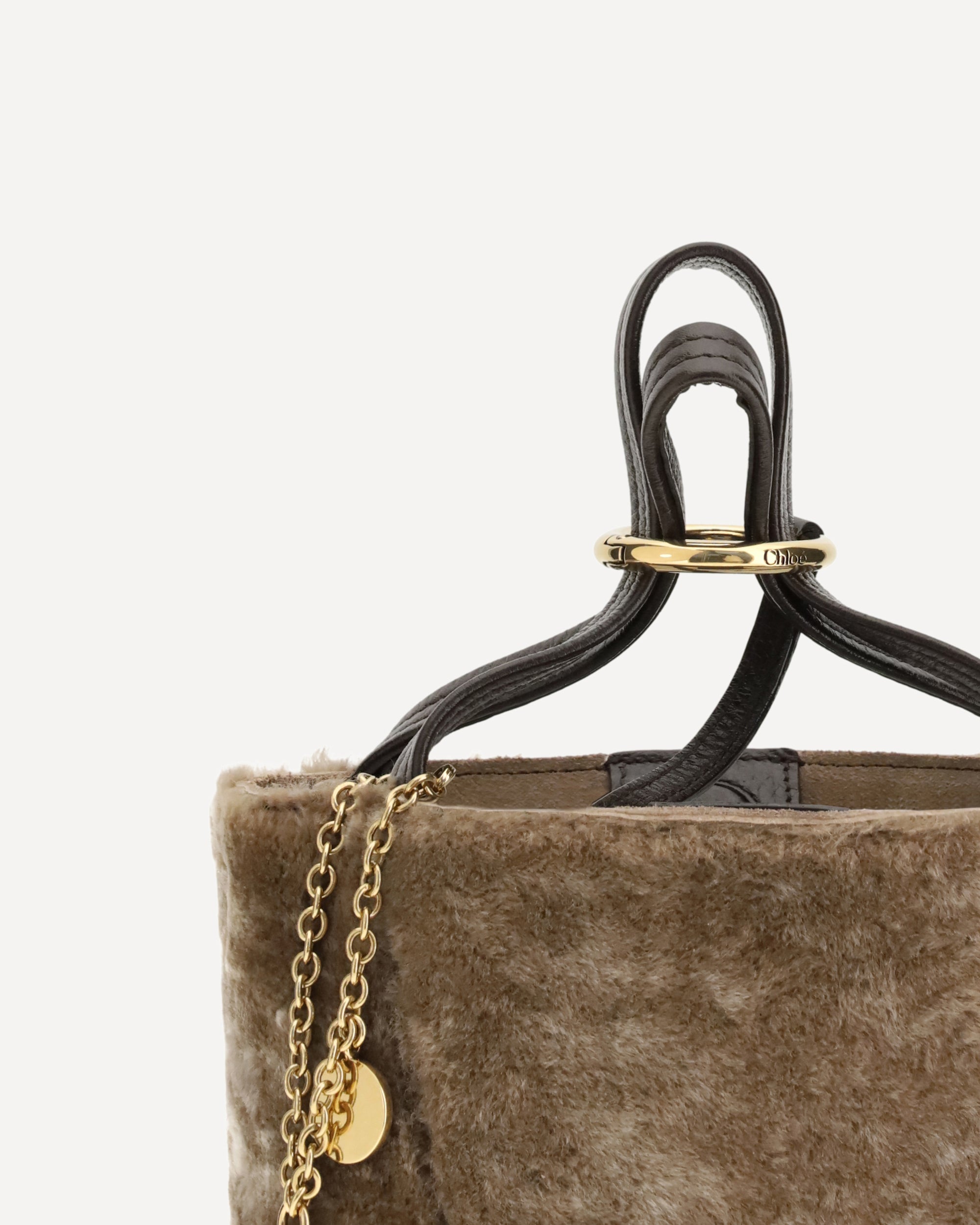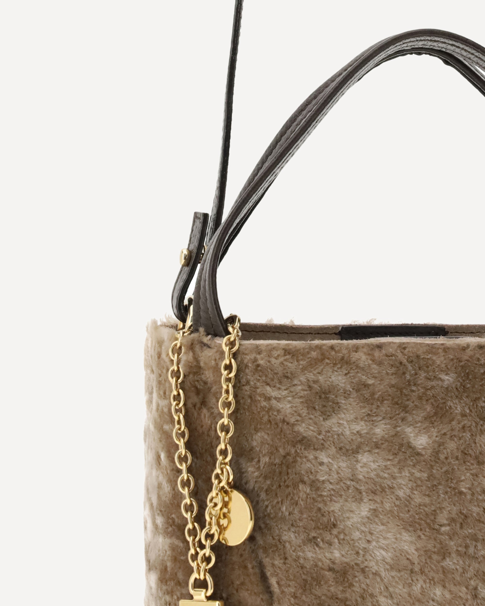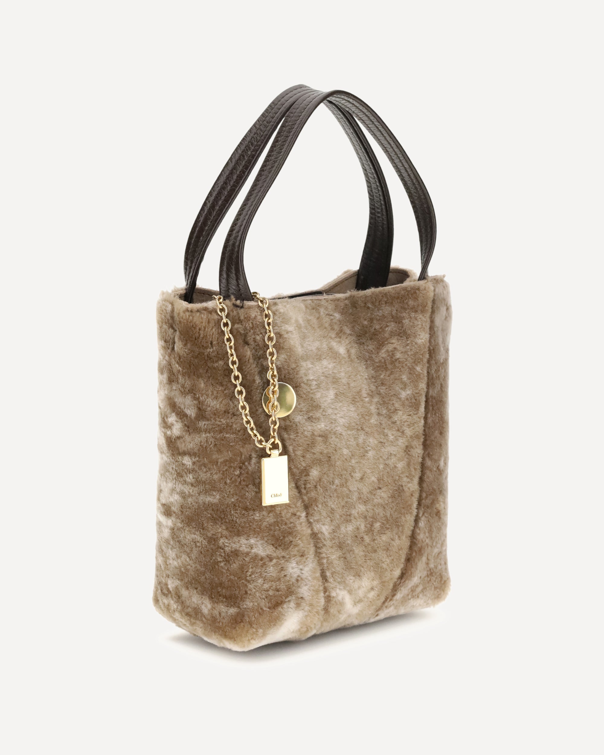 Spin small Tote Bag by Chloè in soft shearling is distinguished by a compact, minimalist silhouette defined by clean graphic lines. The discreet elegance of the design is enhanced by a dangling chain with the iconic Chloé medals and Horse emblem, distinctive symbols of the Maison. Equipped with double handles and a removable shoulder strap, it can be worn on the shoulder, over the shoulder, in the hand or on the wrist, thanks to the versatility of the ring-integrated handle. A sophisticated and original accessory, perfect for any time of day.