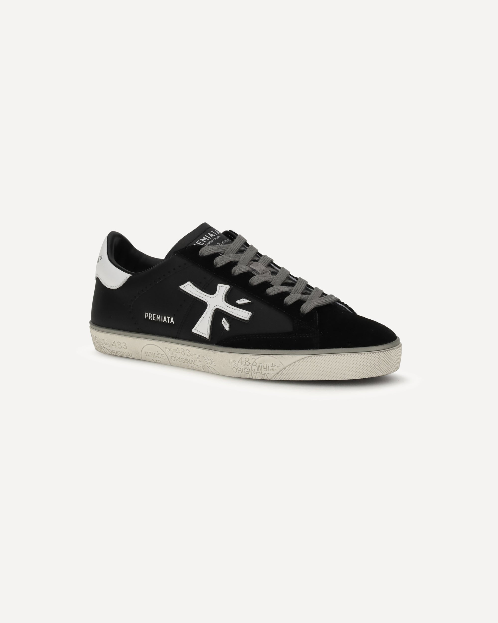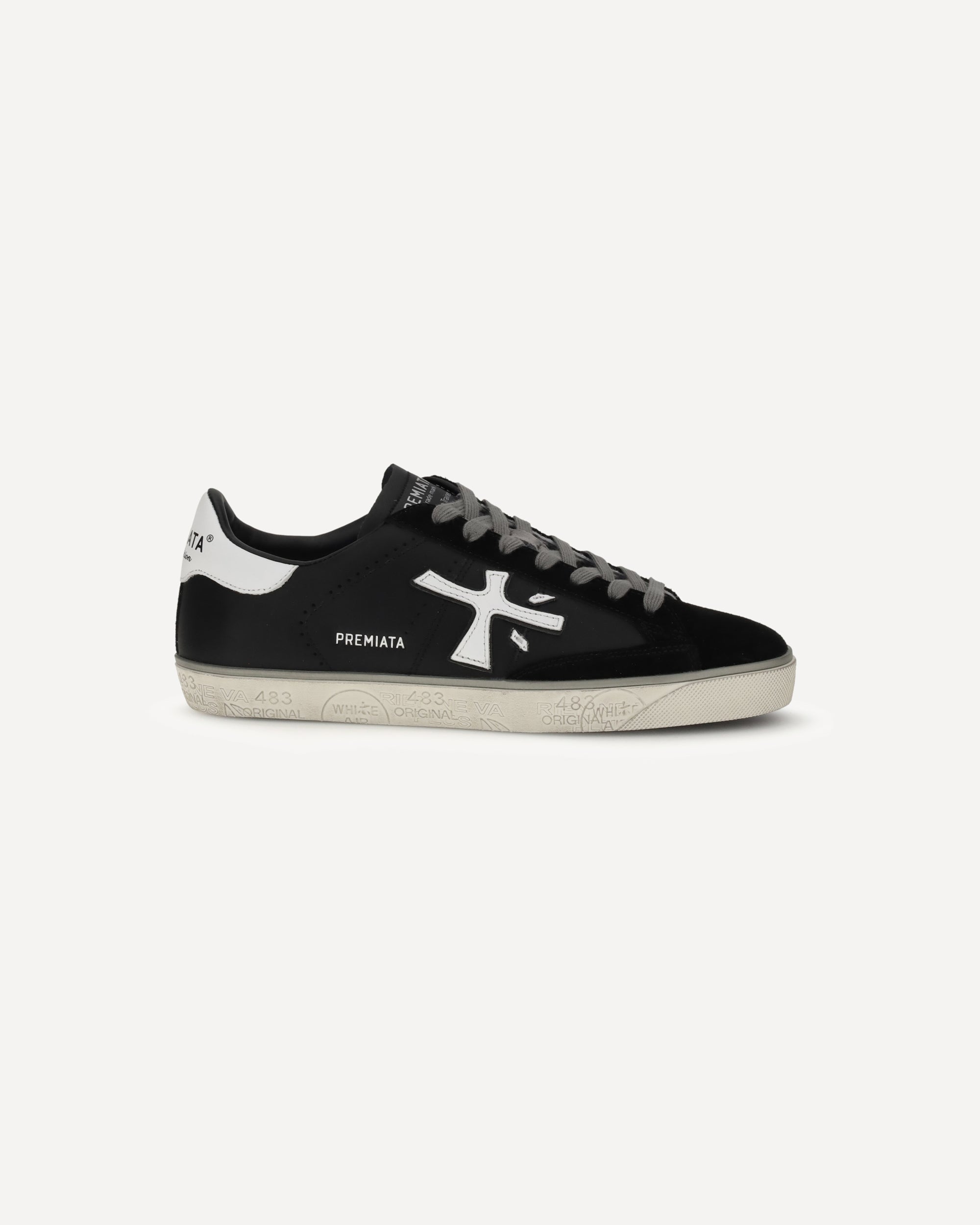 Steven Sneakers by Premiata are distinguished by a sleek, contemporary design designed to combine style and functionality. The round toe ensures a comfortable fit, while the lace-up closure allows for a customized fit. The iconic logo and monogram on the side panels lend a distinctive touch, emphasizing the brand's identity. Completing the model is a contrasting logoed flat sole, offering comfort and durability, and an insole that is also logoed, confirming Premiata's signature attention to detail.