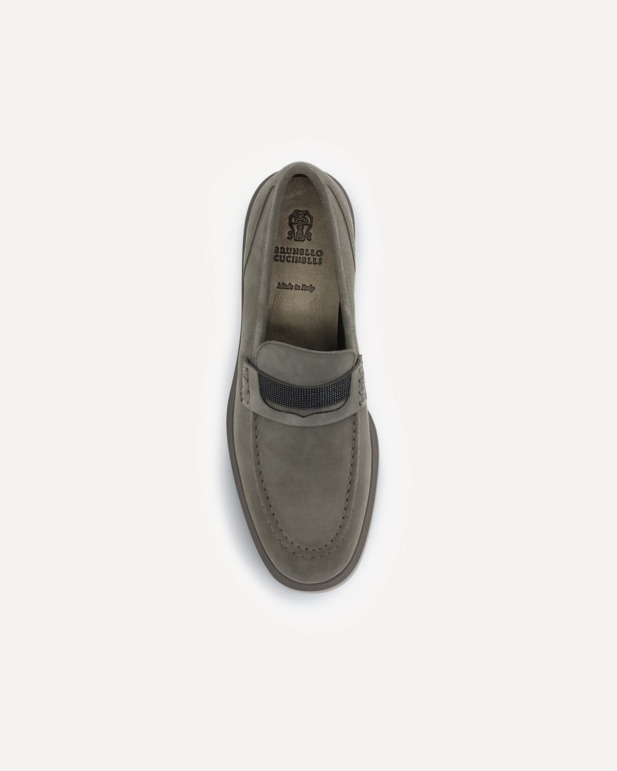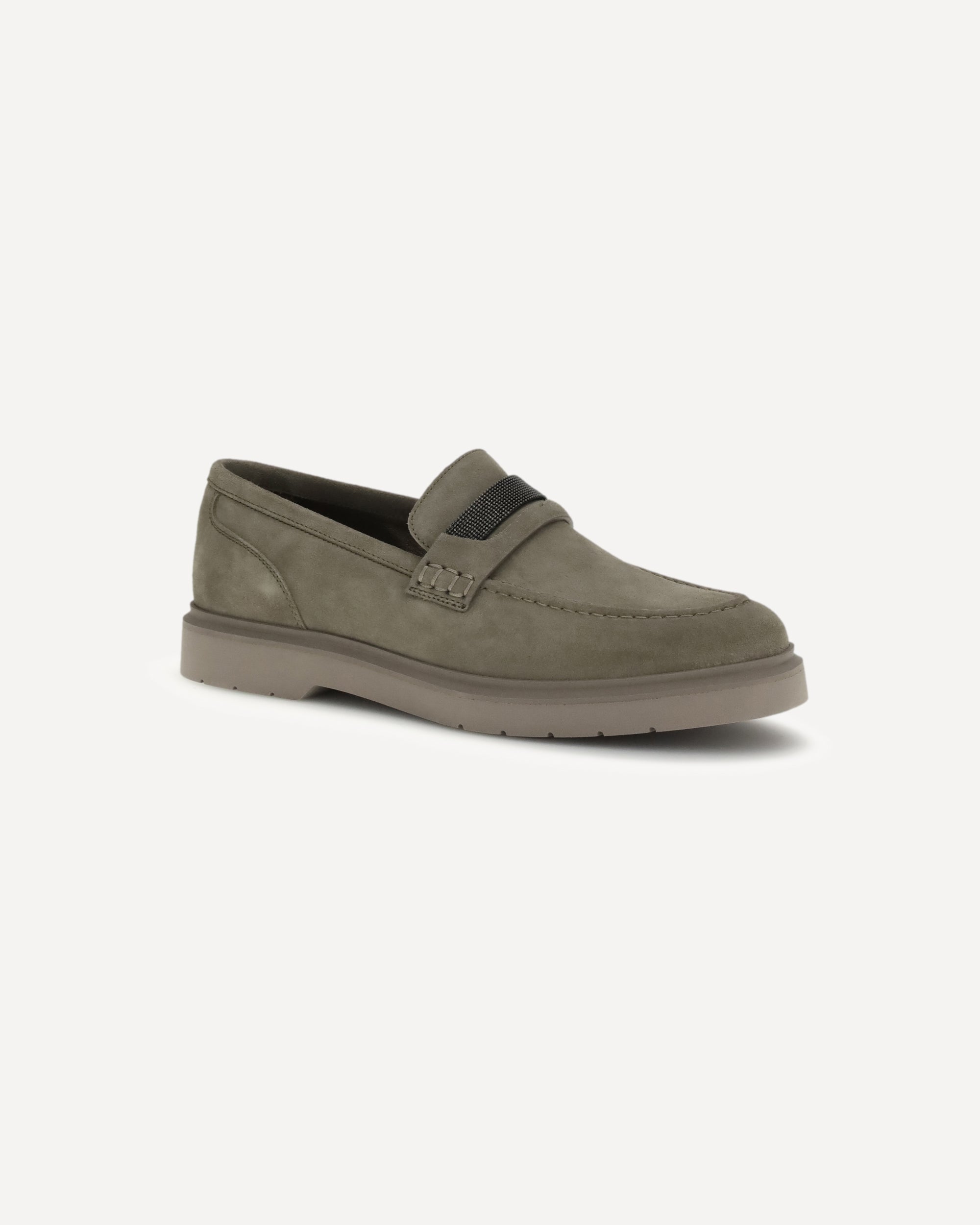 The leather Loafers by Brunello Cucinelli feature an almond toe on the front, giving them an elegant and refined touch. The suede design lends a soft, sophisticated look, while the front tray is decorated with the brand's iconic jewels, a distinctive luxury detail. Matching all-over stitching adds an element of precision craftsmanship, while the press-stamped logo insole completes the look with a sign of authenticity. A pair of loafers that combines comfort, style and high quality.