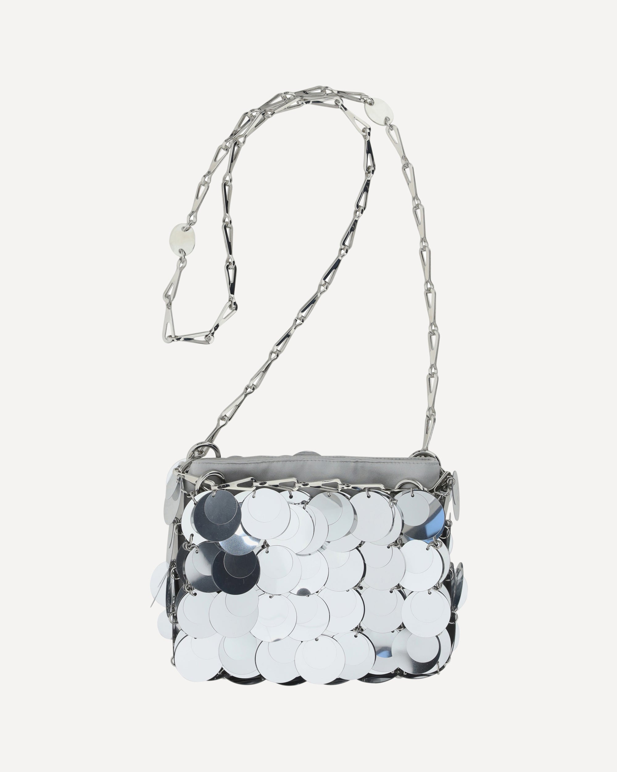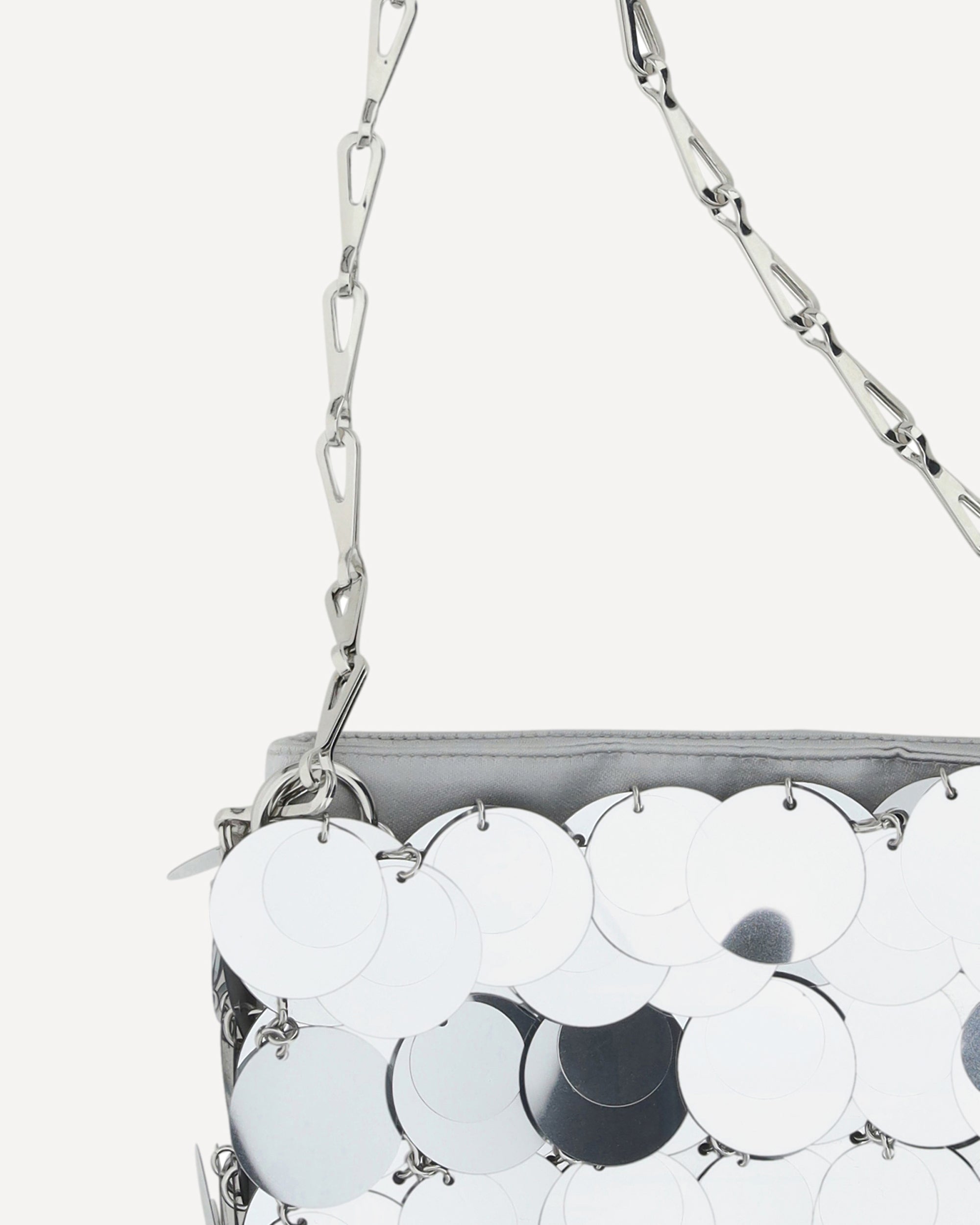 Rabanne's Sparkle Nano Shoulder Bag is a bright and sophisticated accessory featuring a design covered in bright sequins. It features a single interior compartment and an adjustable and removable metal chain shoulder strap, ensuring versatility and style for any occasion.
