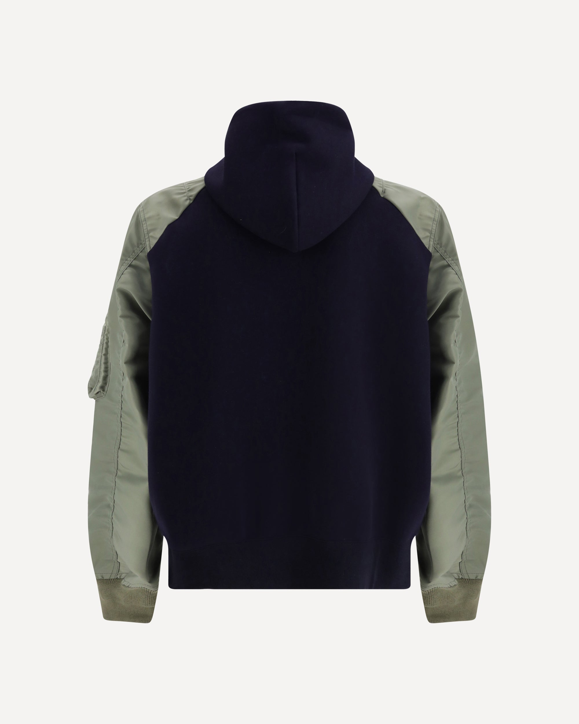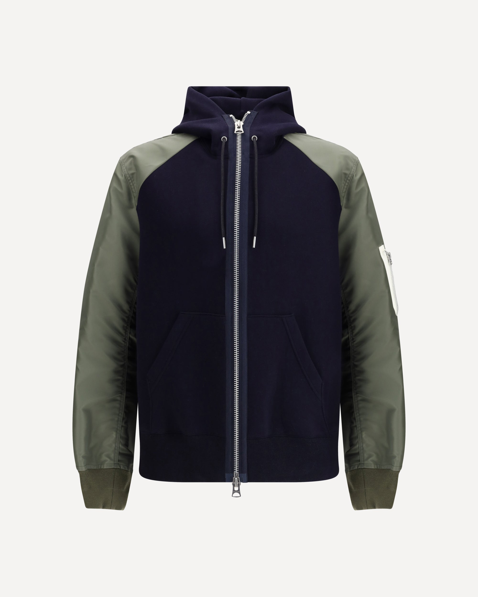Sacai's Sponge Sweat Hoodie in cotton is a modern and functional garment perfect for a casual and sophisticated look. The adjustable hood with drawstring offers a customizable fit, while the double-slider front zipper closure ensures practicality. The paneled design gives a dynamic, contemporary look, with two patch welt pockets on the front for added functionality. Raglan shoulders add a sporty touch, while a zippered welt pocket on the left sleeve offers a practical and stylish detail. Ribbed cuffs and hem complete the design, offering comfort and a perfect fit. A sweatshirt that combines comfort, style and Sacai's unmistakable originality.