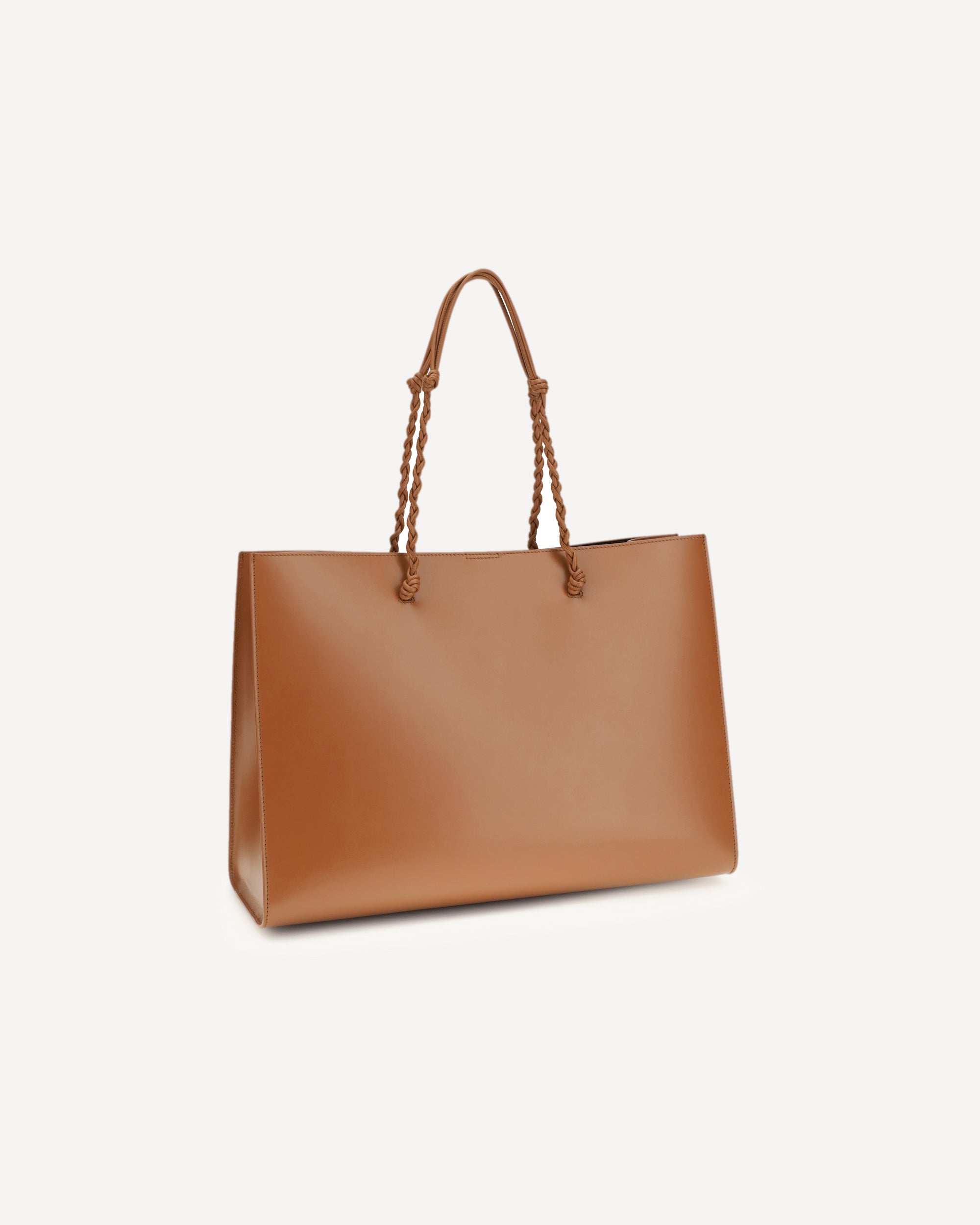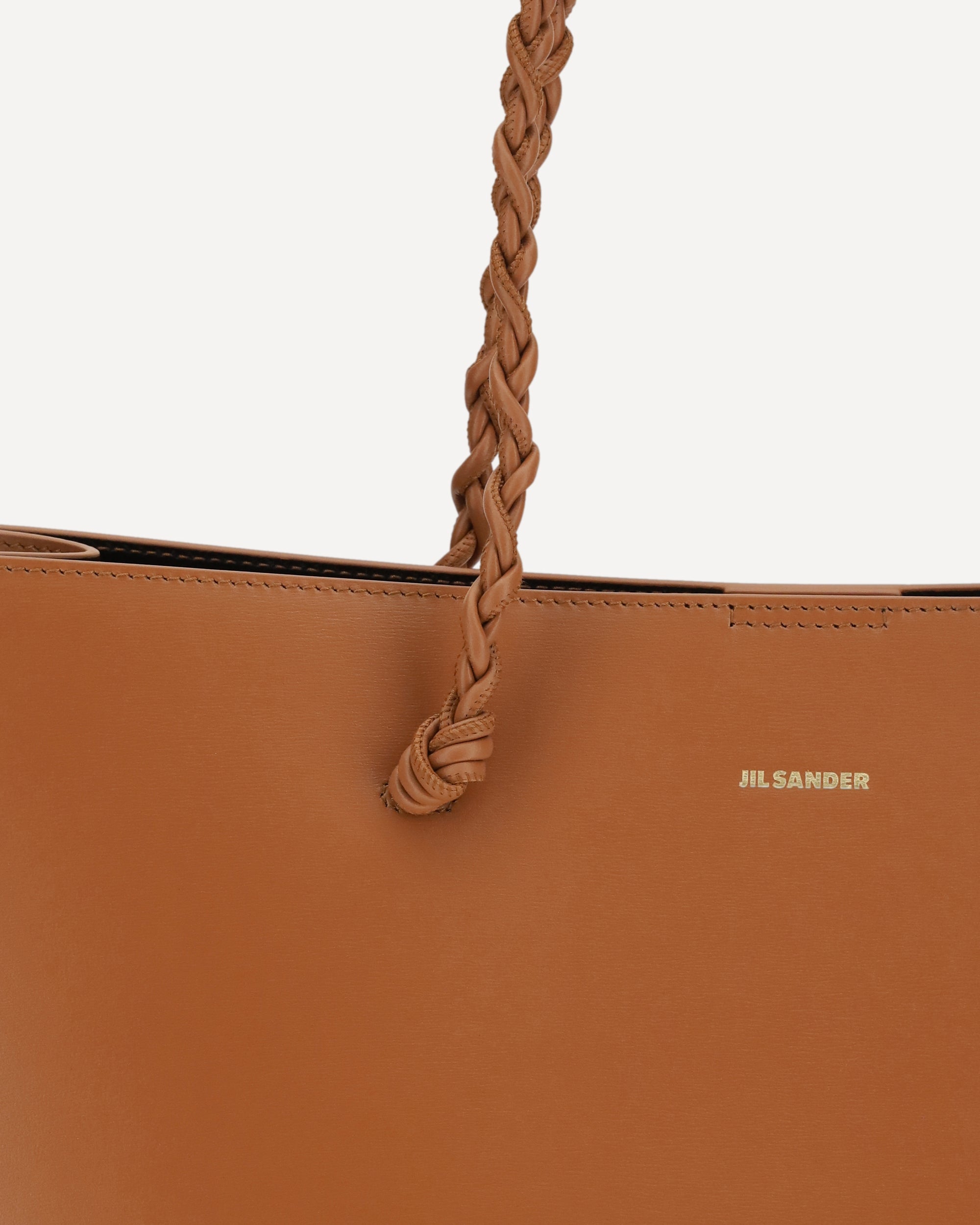 The Tangle Tote Bag by Jil Sander, crafted from leather, combines elegance and minimalism in a refined design. The handles are hand-knotted, while the magnetic button closure ensures practicality. The interior features a flat leather pocket with an embossed Jil Sander logo, which also echoes the exterior logo, completing the look with understated and sophisticated style.