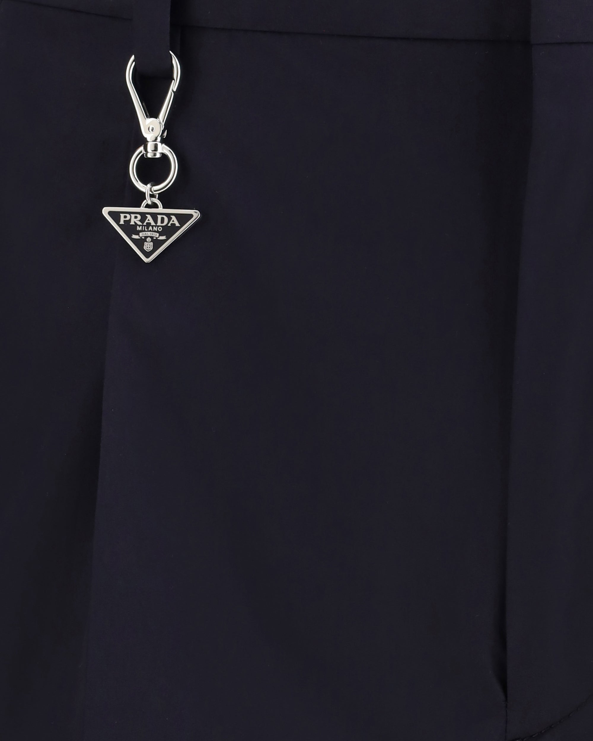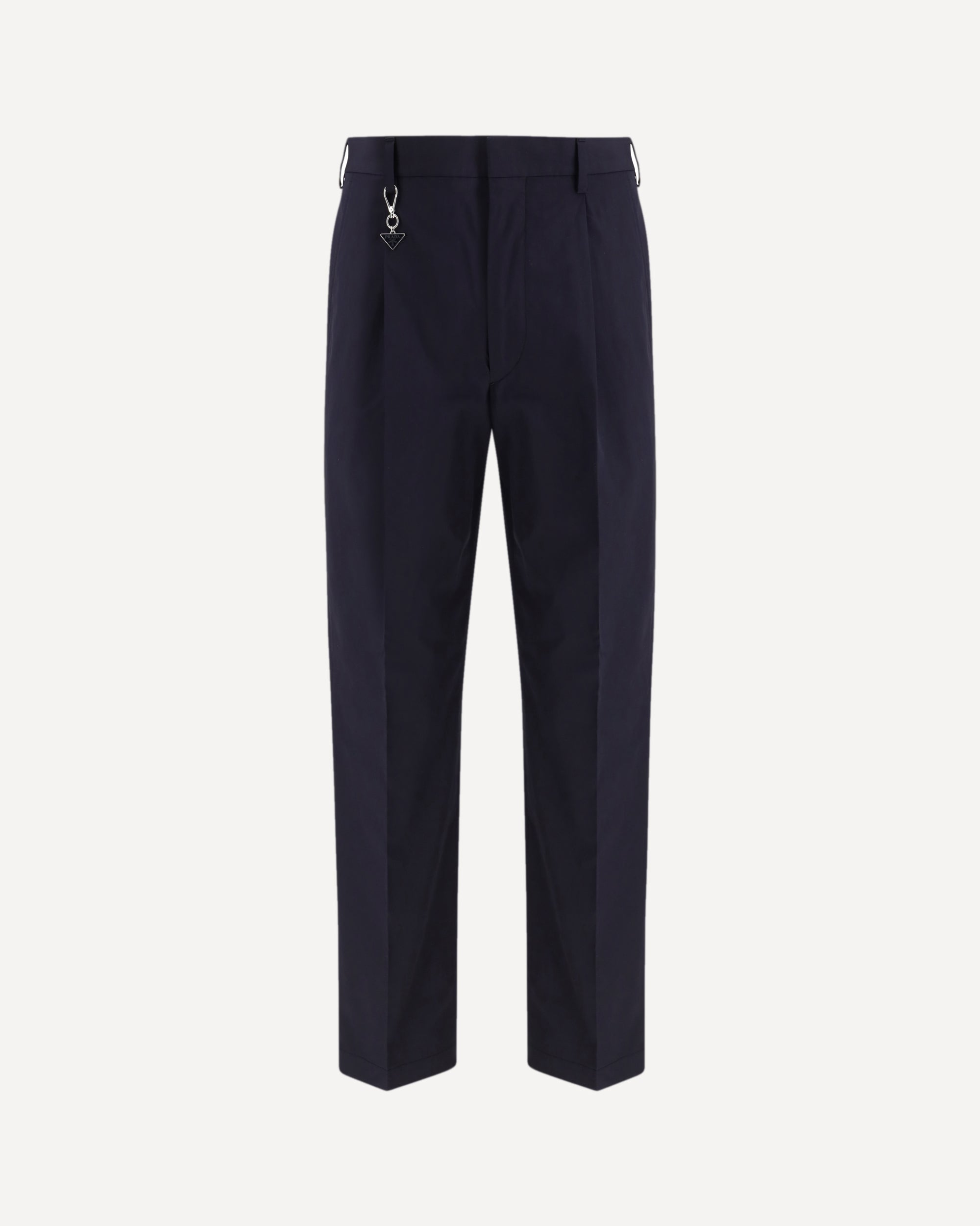 The Tailored cotton poplin Trousers by Prada, crafted with clean lines and a precise, structured silhouette. The concealed zip and hook closure preserves a minimal aesthetic, while belt loops provide added practicality. Double front pleats offer subtle volume, complemented by side pockets and buttoned welt pockets at the back. The removable metal pendant with the enameled triangle logo adds an iconic, refined accent.