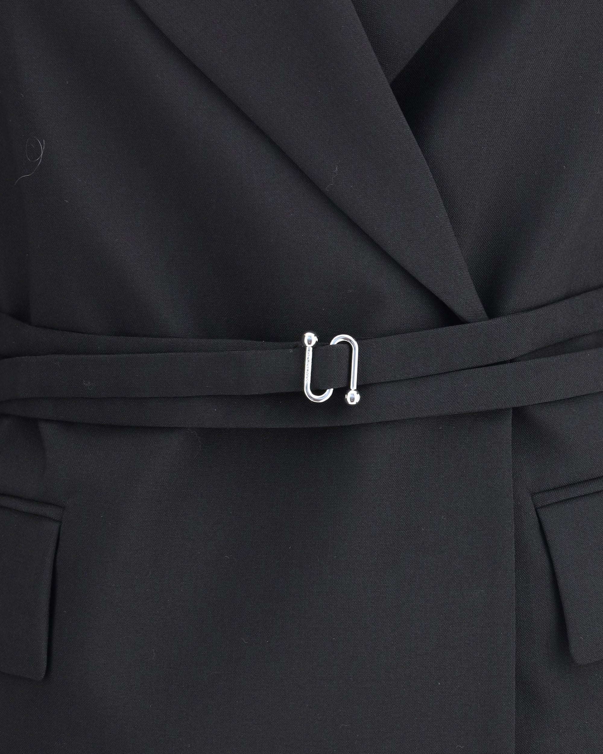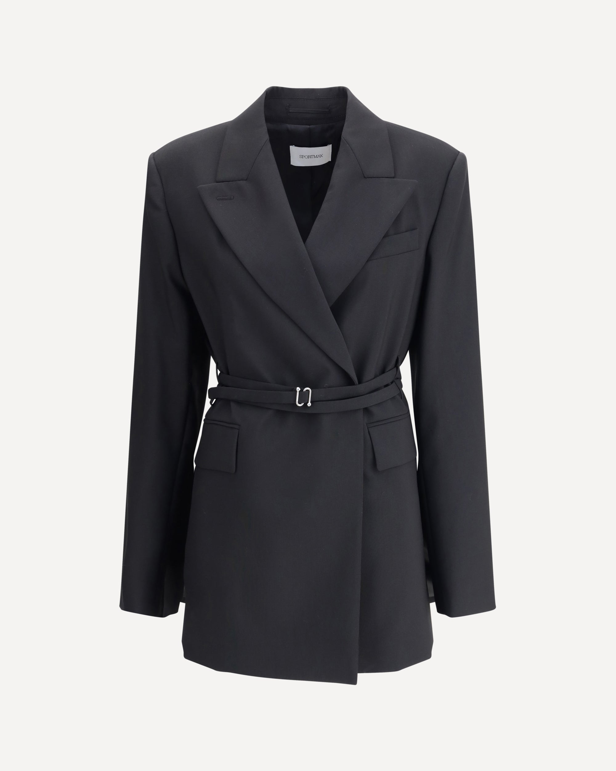 Max Mara Sportmax's Tubinga long Blazer is a tailored piece in yarn-dyed pure wool canvas that is elegant and structured. Featuring an arrow lapel neckline, it has a double-breasted closure with concealed snaps that enhances its clean lines. A double-turn belt with an S-buckle buckle defines the silhouette with a distinctive modern touch.