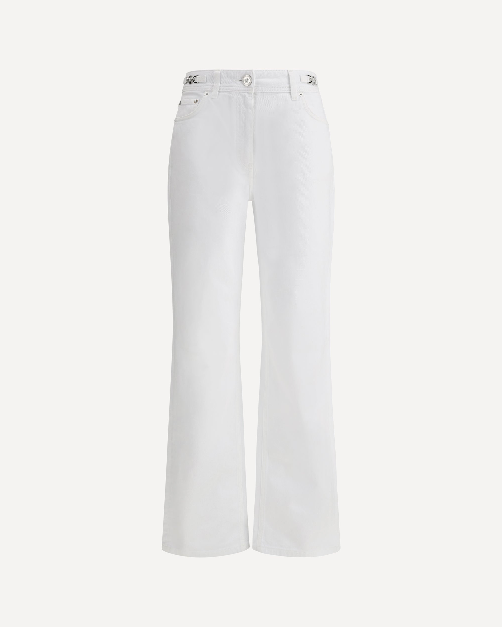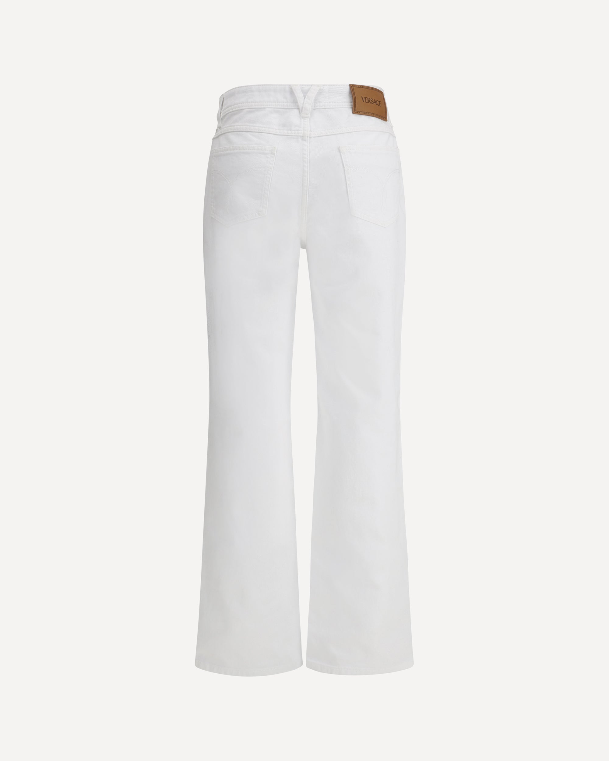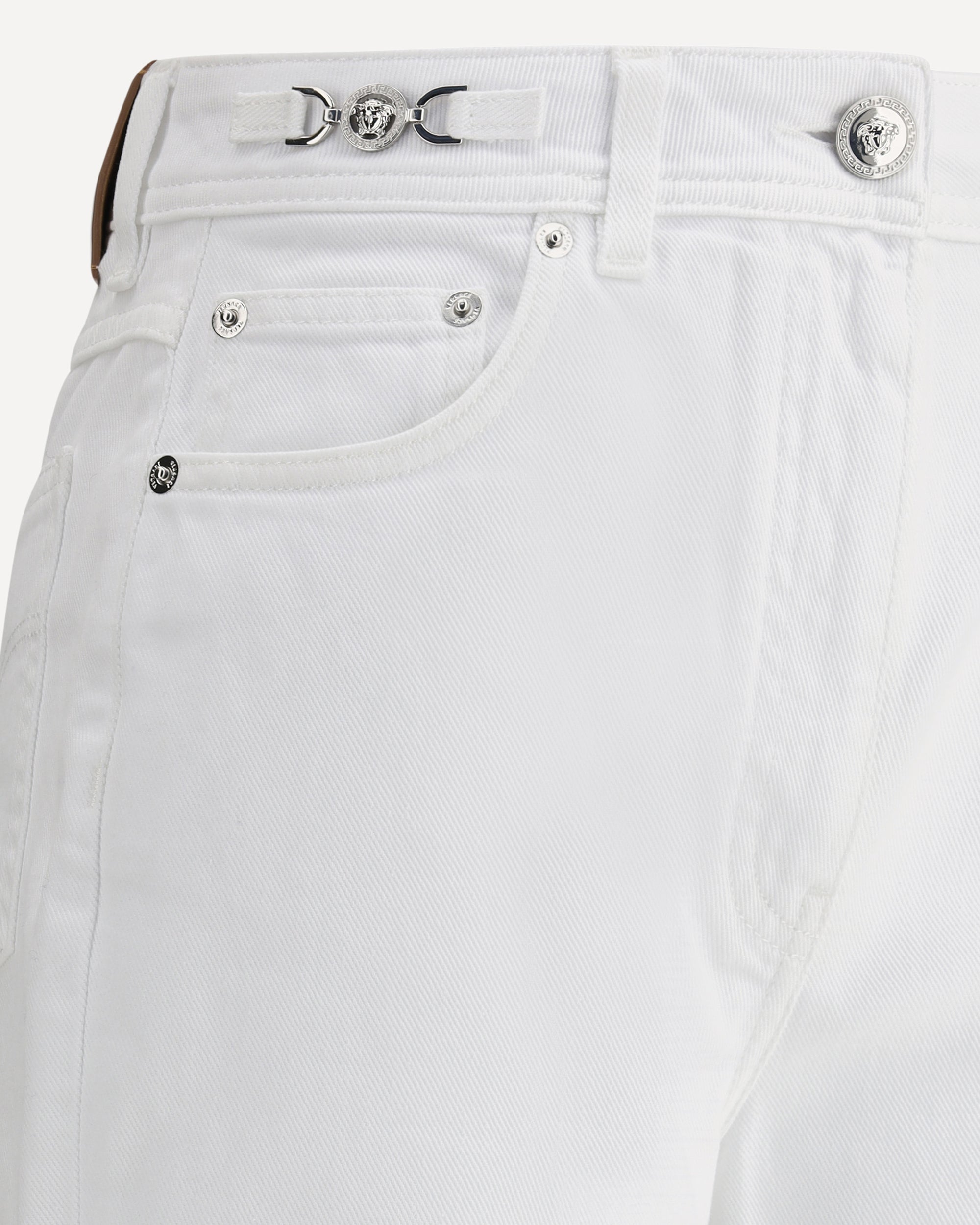 Versace's white cotton jeans offer a modern, sophisticated look with their straight five-pocket design. The button-and-zip front closure, along with belt loops, ensures a comfortable and practical fit. The high waist slims the silhouette, while the waistband details, embellished with the iconic Medusa logo, add a touch of luxury and distinction. A perfect garment for those seeking contemporary style with a high-fashion accent.