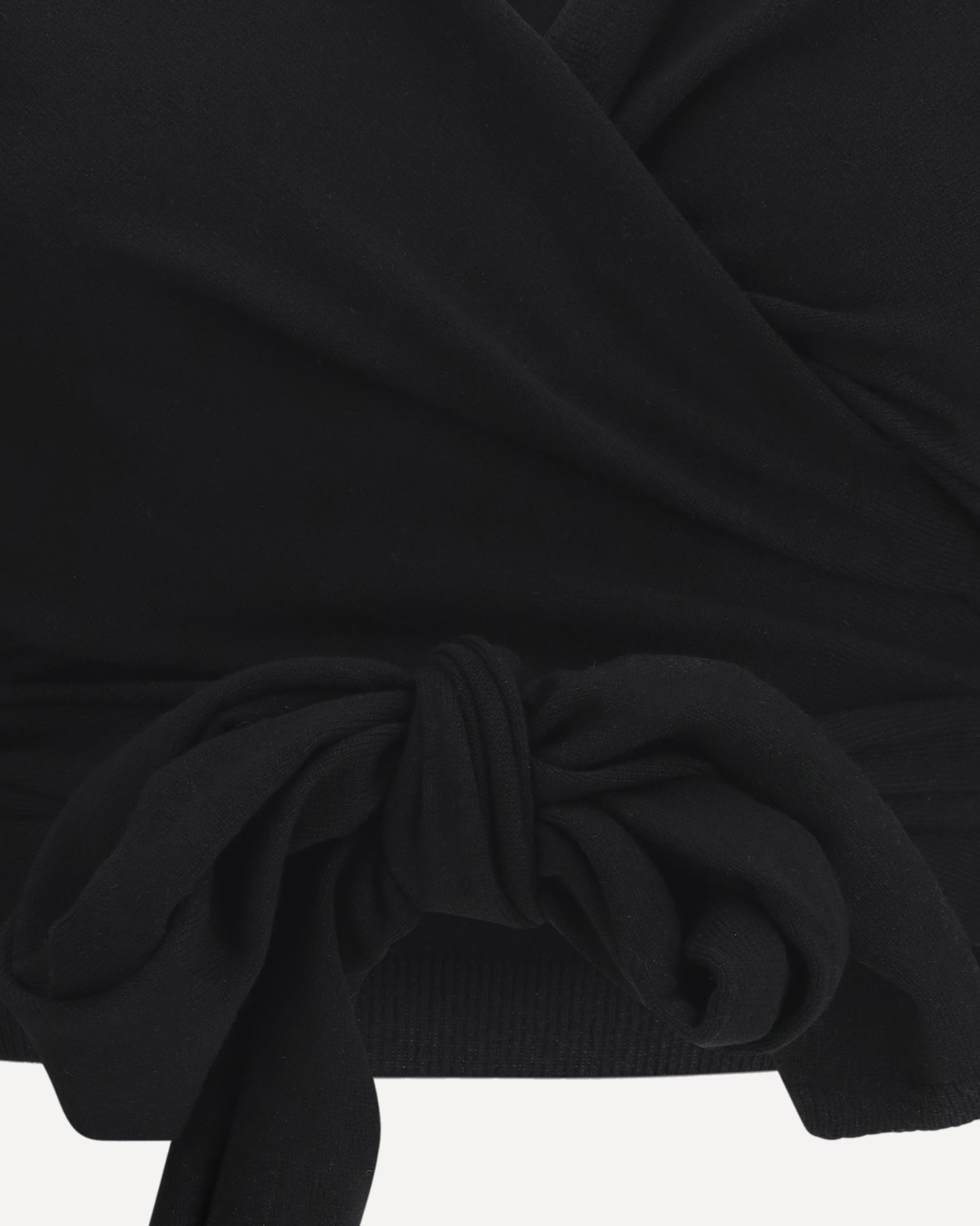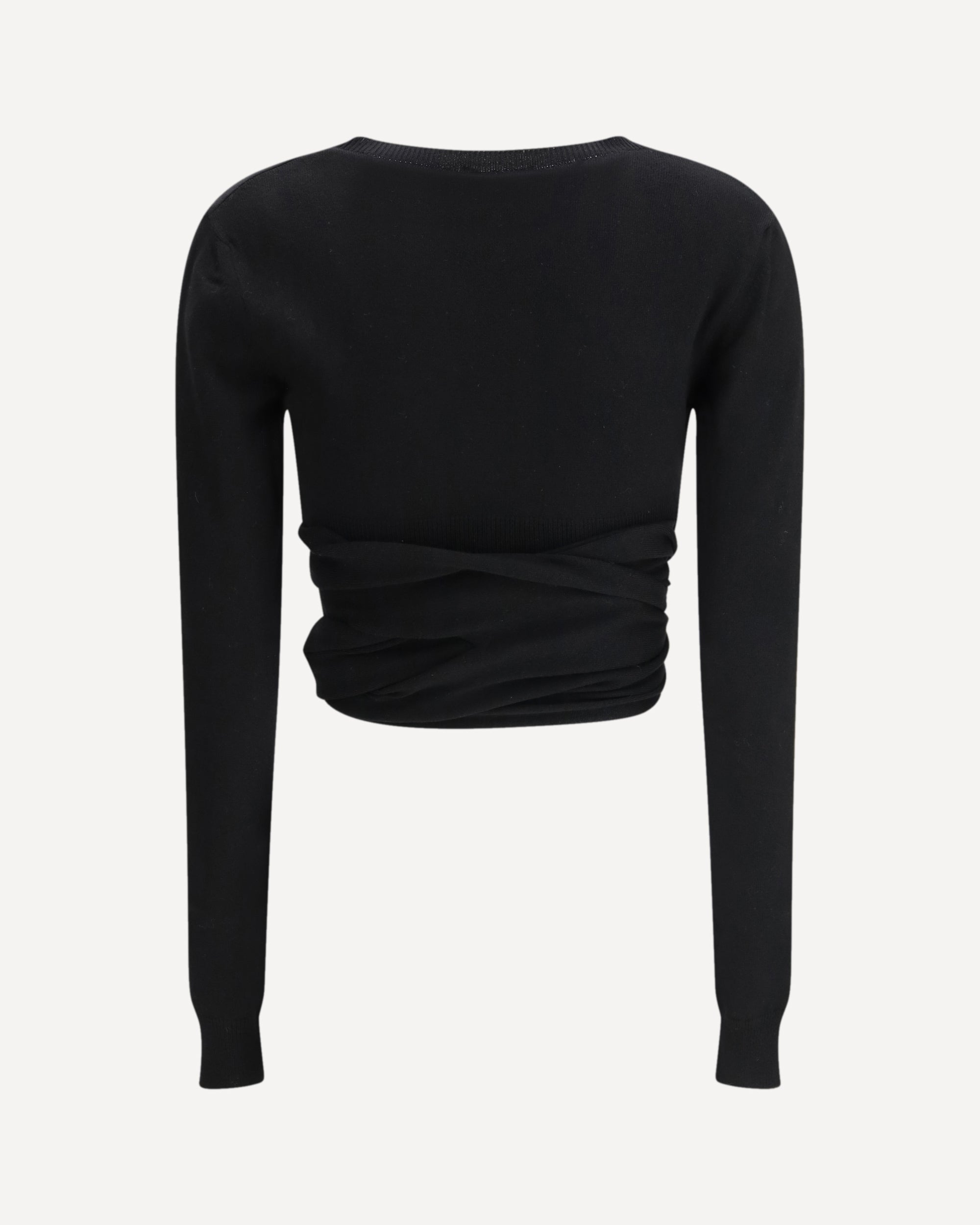 The wrap Top by Alaïa is crafted from a refined blend of wool and cashmere, designed without closures and featuring an elegant wrap-style construction that naturally enhances the silhouette. The long sleeves are detailed with ribbed finishes, adding texture and definition to the design while maintaining a perfect balance of softness, minimalism, and sophistication.