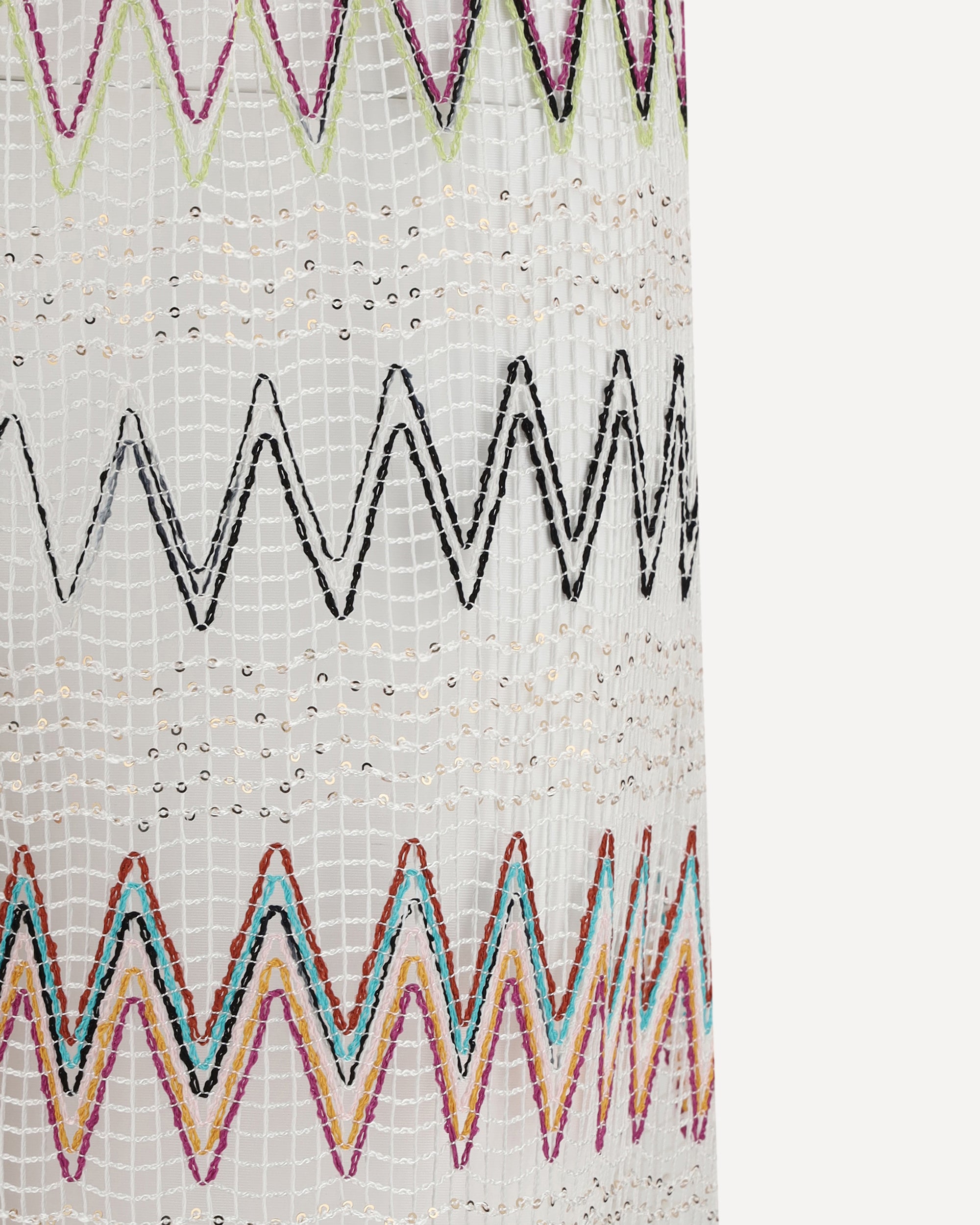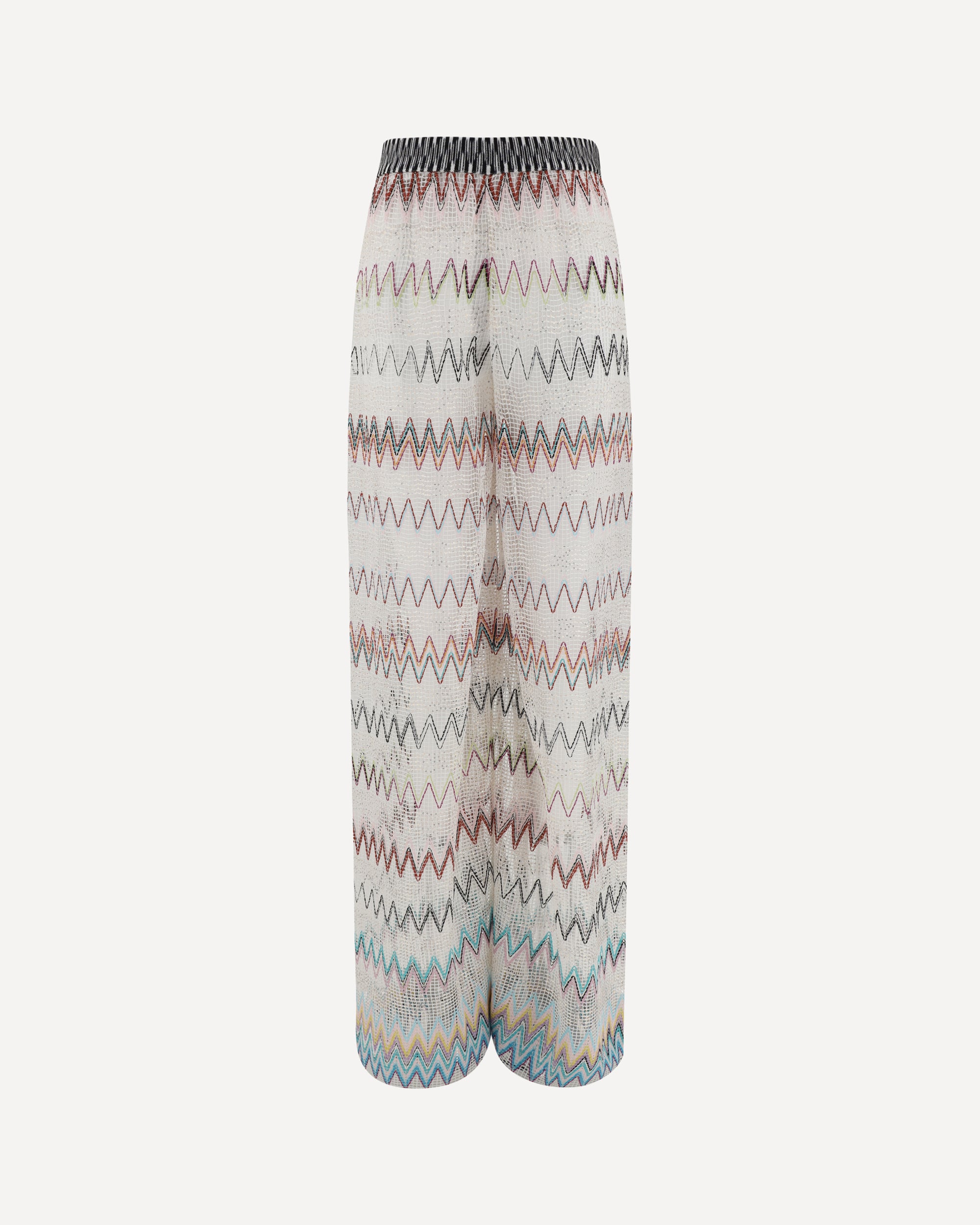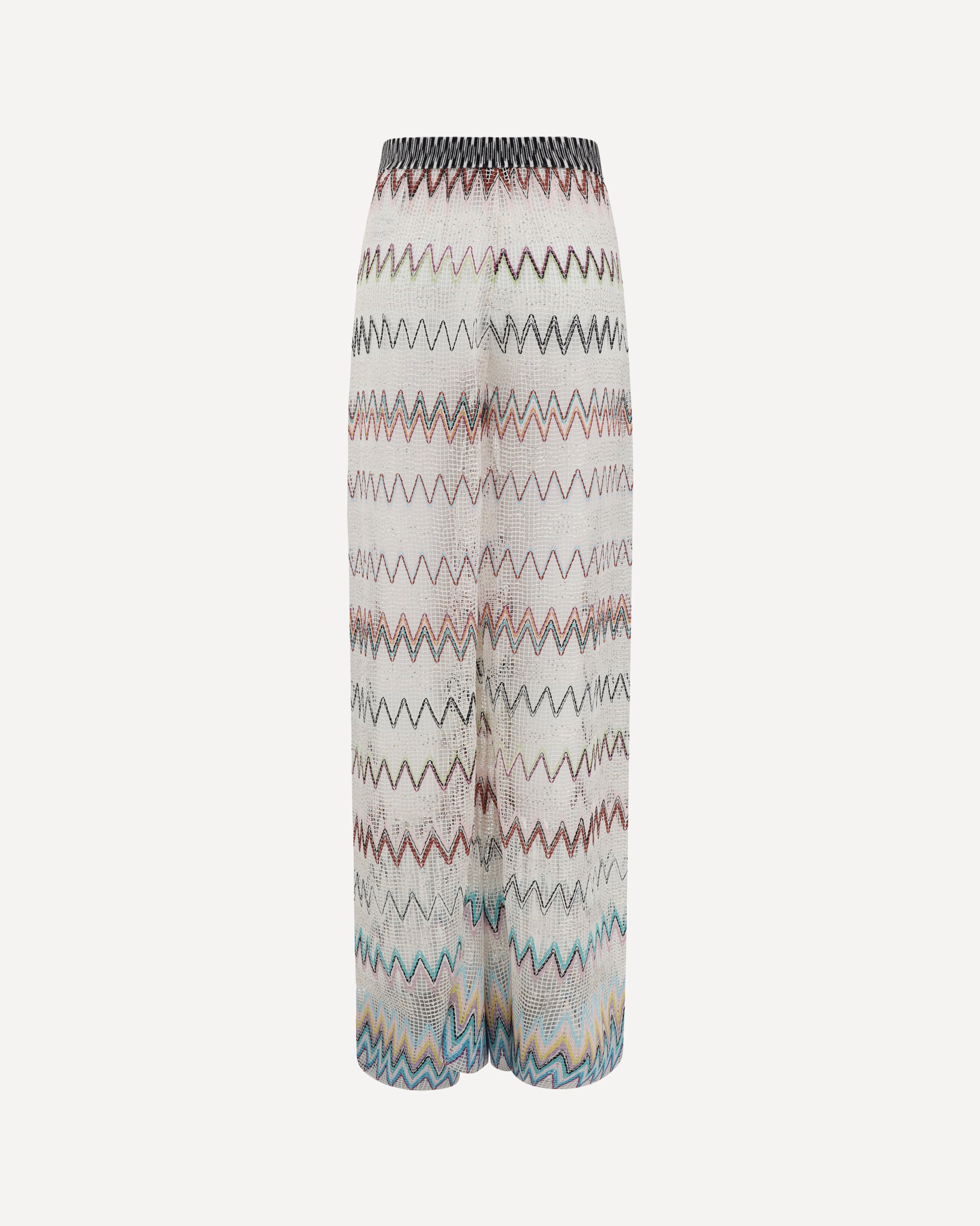 Missoni's zig zag patterned mesh Pants are a striking piece that combines elegance and originality. The elasticized waistband offers a comfortable and secure fit, while the flared cut gives a long, flowing silhouette. The semi-sheer mesh design lends a bold and modern touch, with a lightness that plays on transparencies. The zig zag pattern, Missoni's iconic symbol, is enriched with small sequin details that give a bright and sparkling effect, perfect for special occasions or elegant evenings.