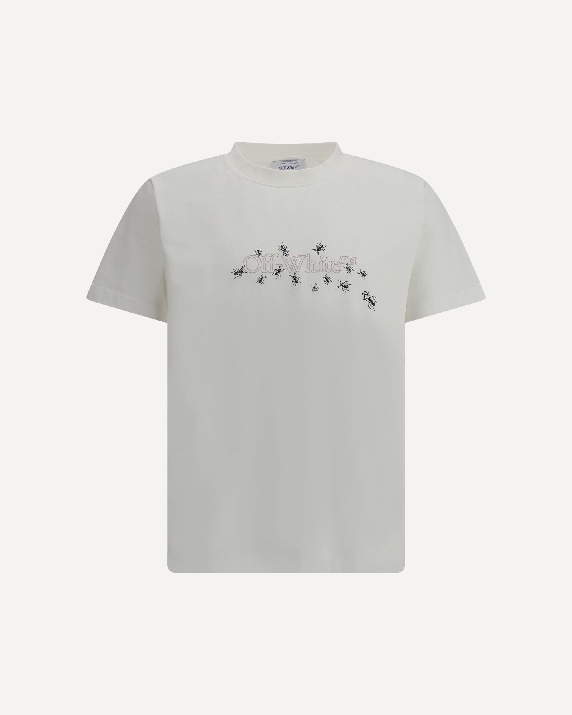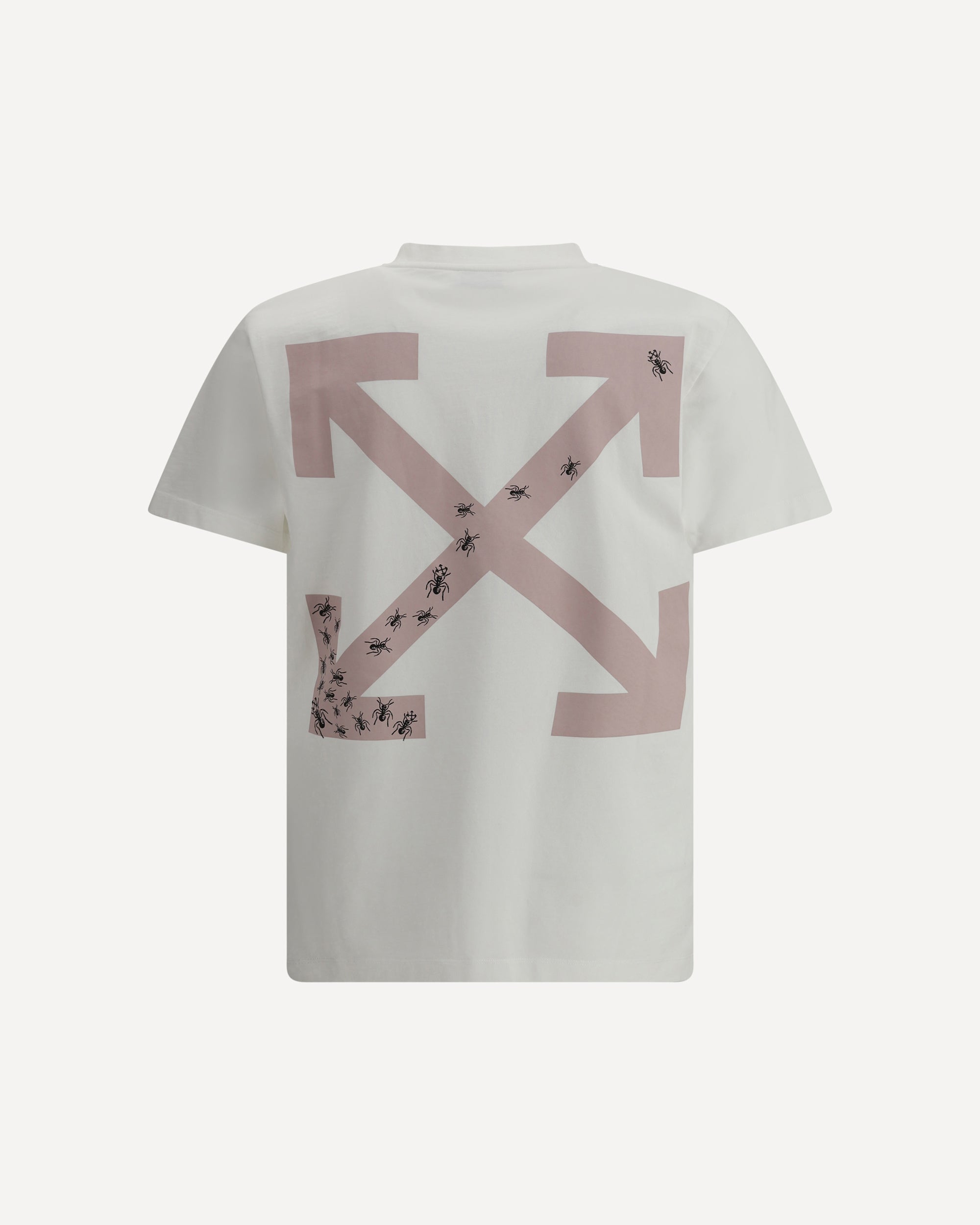 The Ants Arrow cotton T-Shirt by Off-White is a piece with a distinctive and modern style. It features a classic collar, which makes it versatile and suitable for various looks. The iconic monogram on the front adds a touch of brand recognition, while the maxi logo on the back panel featuring an ant print creates a bold and original visual effect.