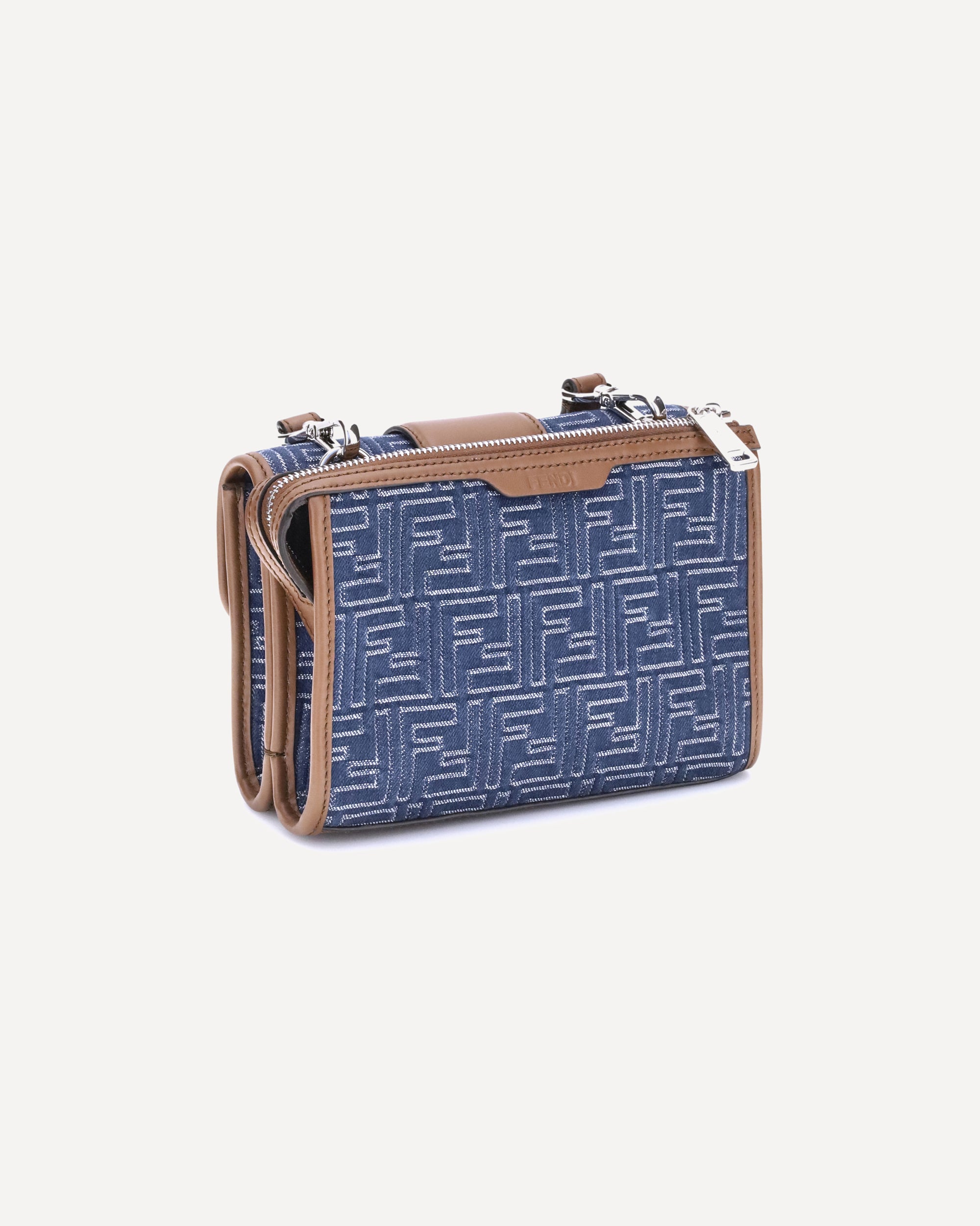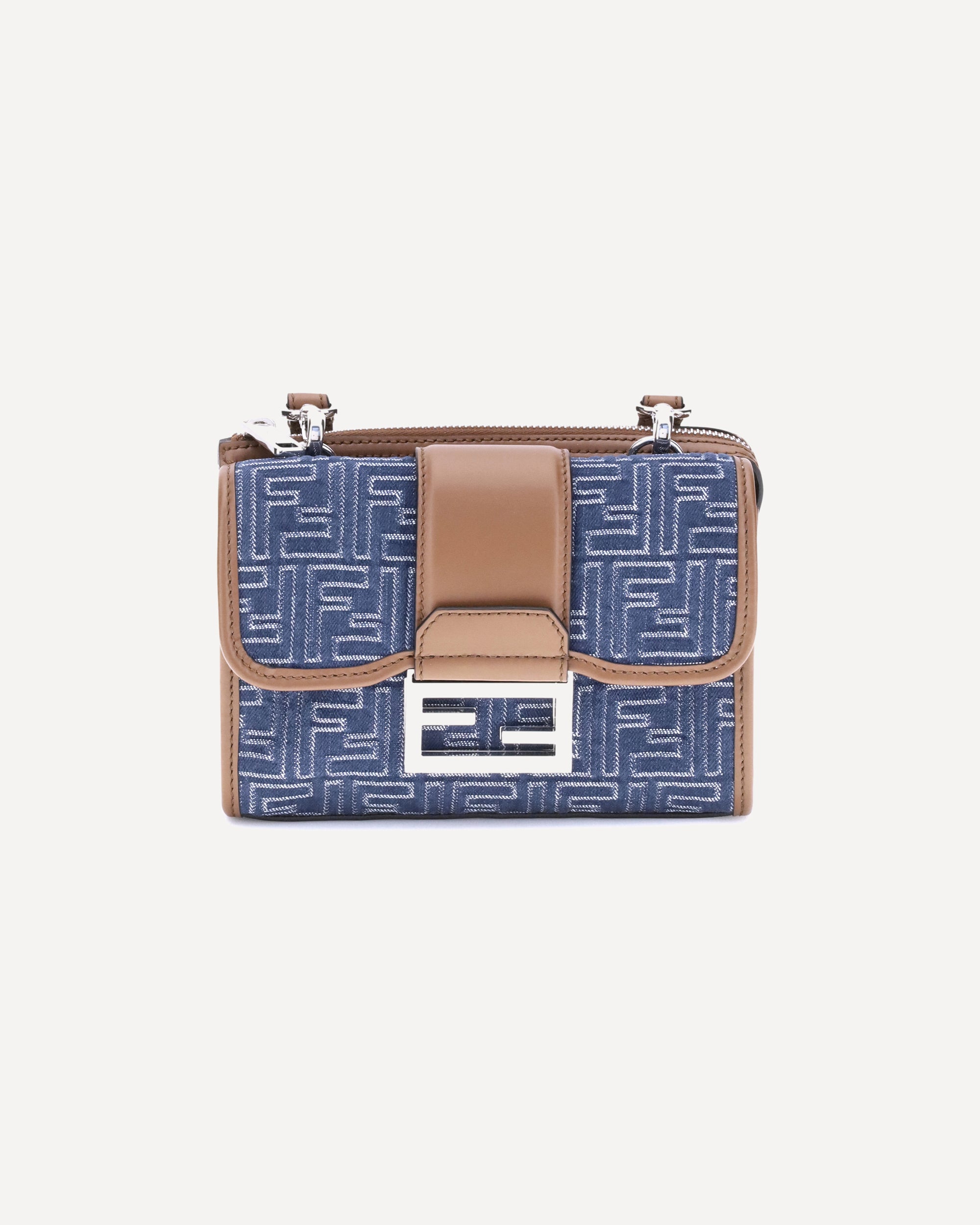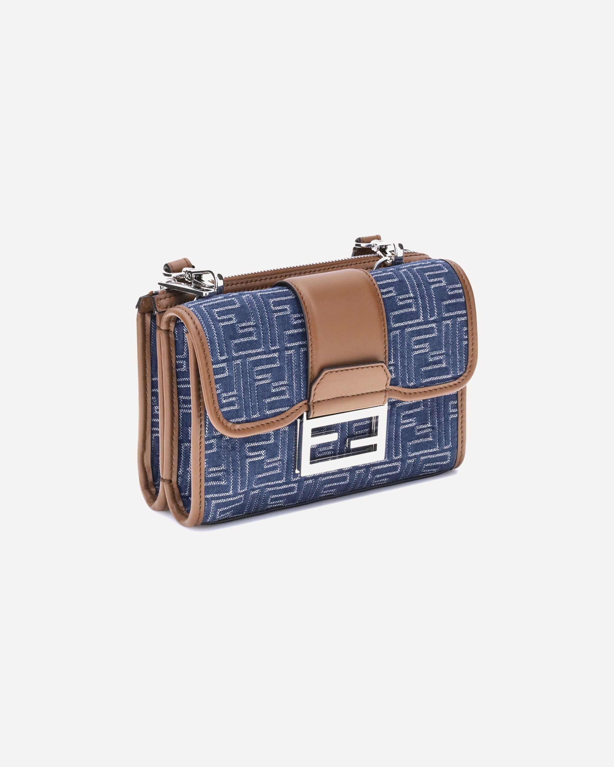Fendi's Baguette Double Shoulder Bag made of denim-effect FF Jacquard is a practical and fashionable accessory, organized in two compartments, one with a square flap and FF magnetic closure, the other closed with a zipper. It features a flat pocket and two hooks so you can add an adjustable shoulder strap. Perfect for combining functionality and style.