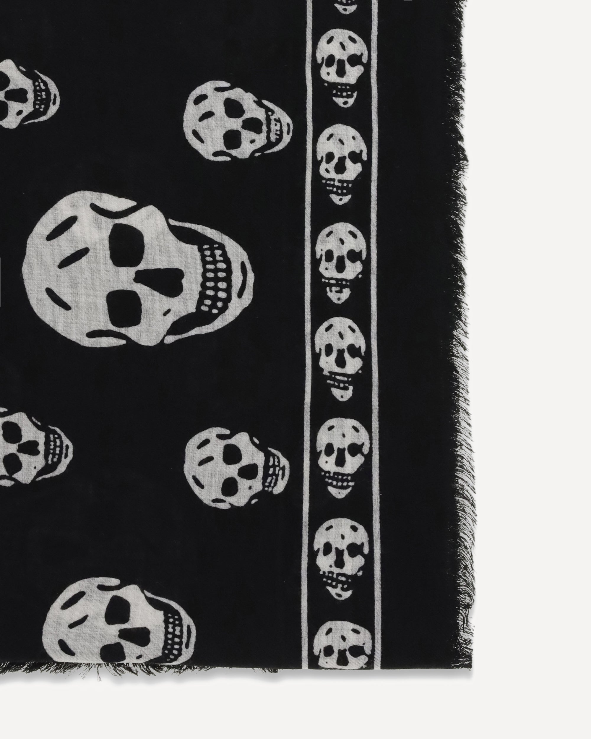 The Skull Foulard by McQueen is crafted from a silk and modal blend in black and dark grey, featuring an all-over Skull motif. The fringed edges are accented with Skull details and the McQueen logo, creating a distinctive, contemporary accessory.