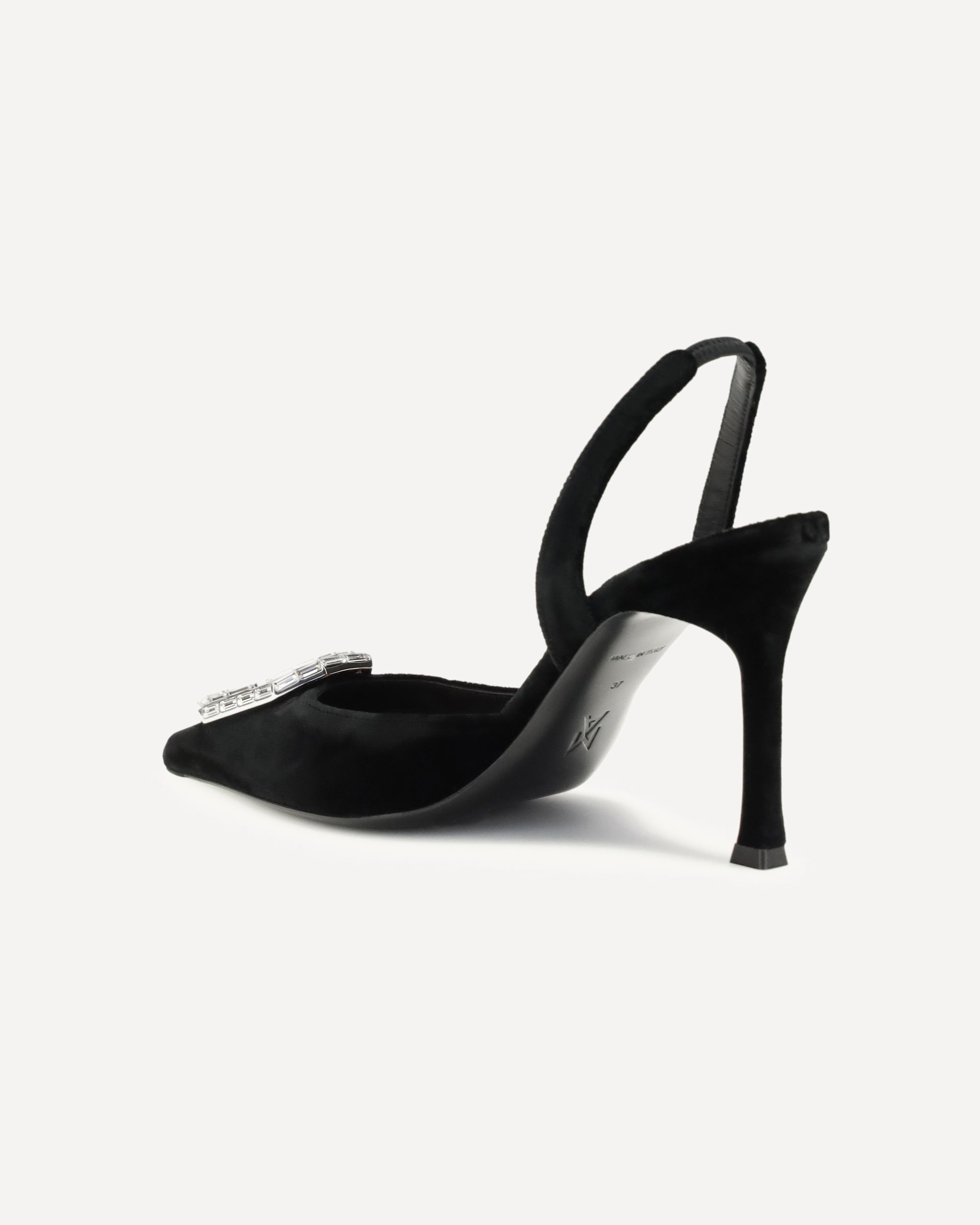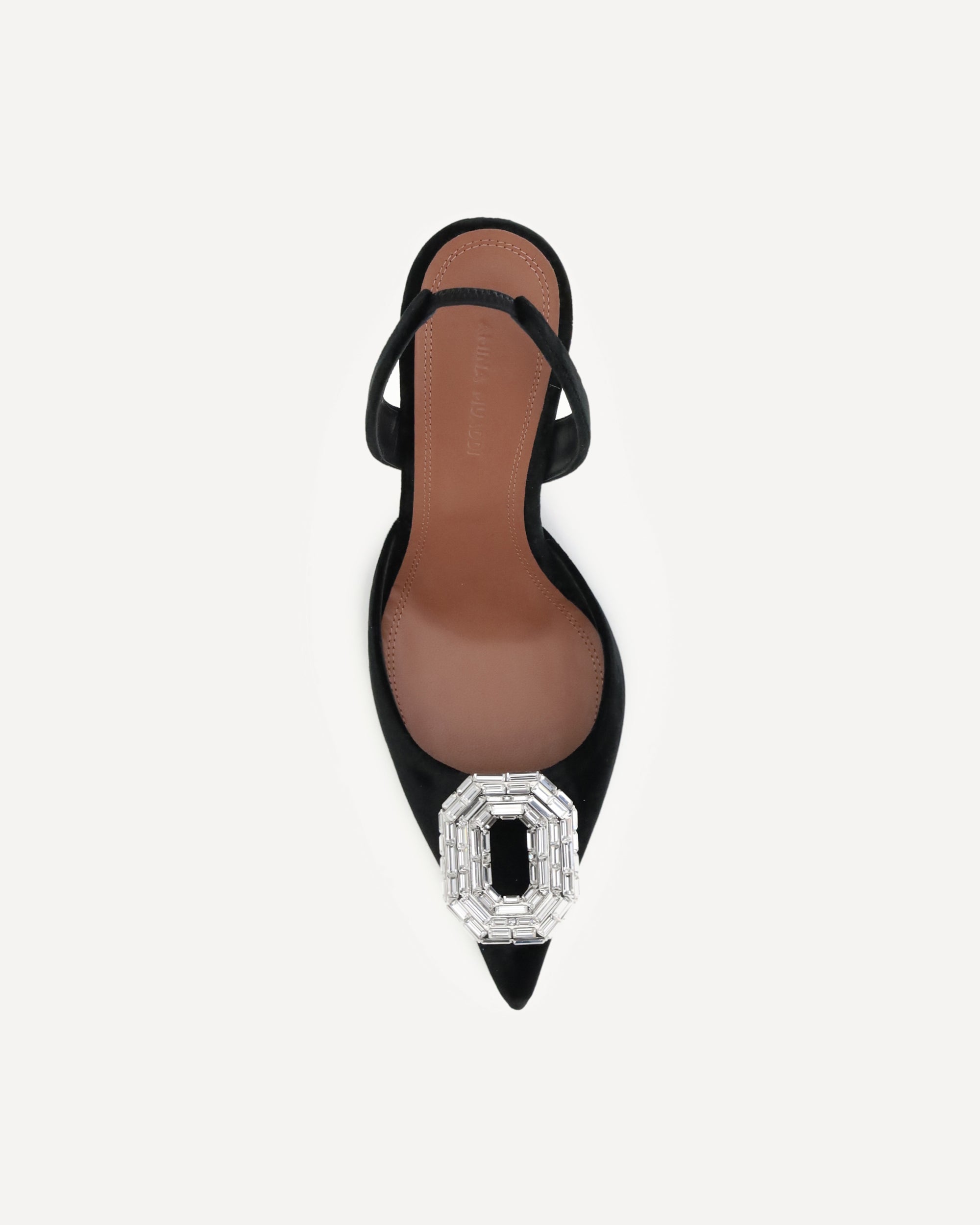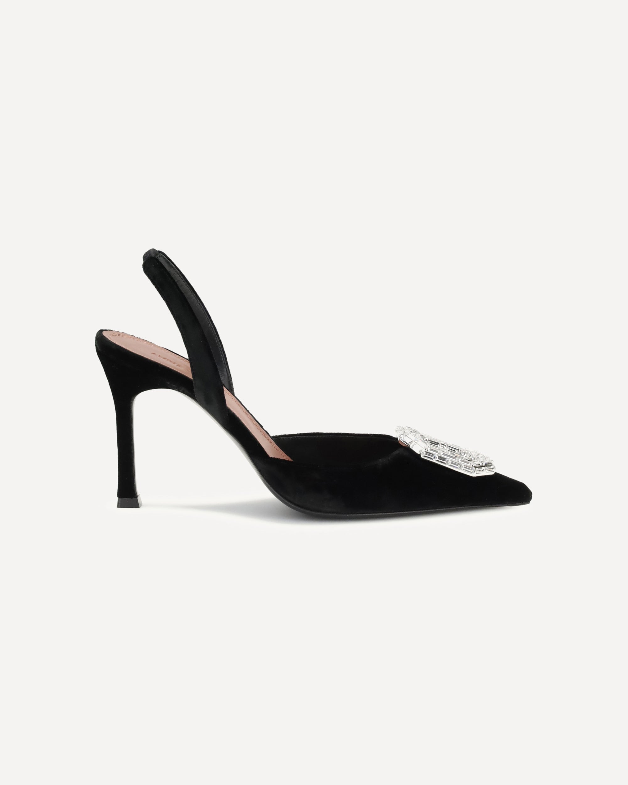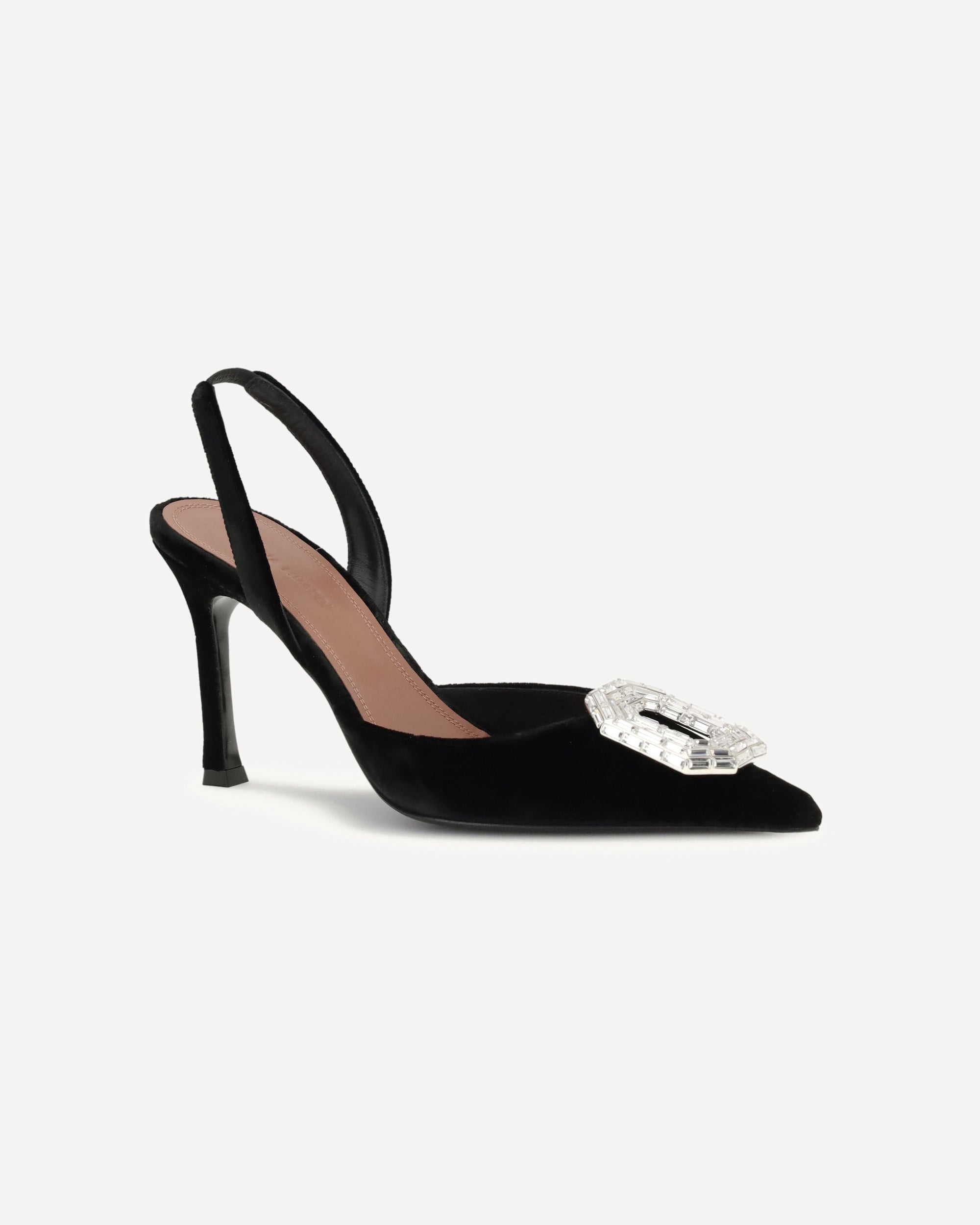 The Camelia suede Pumps by Amina Muaddi are a masterpiece of elegance and style. Featuring an elasticized slingback detail at the heel, they offer a comfortable and secure fit. The elongated toe and leather stiletto heel add a touch of sophistication, while the applied jewel on the front catches the eye with its luxurious appeal. The logo-embossed insole completes the design, making these pumps a classy and sophisticated accessory.