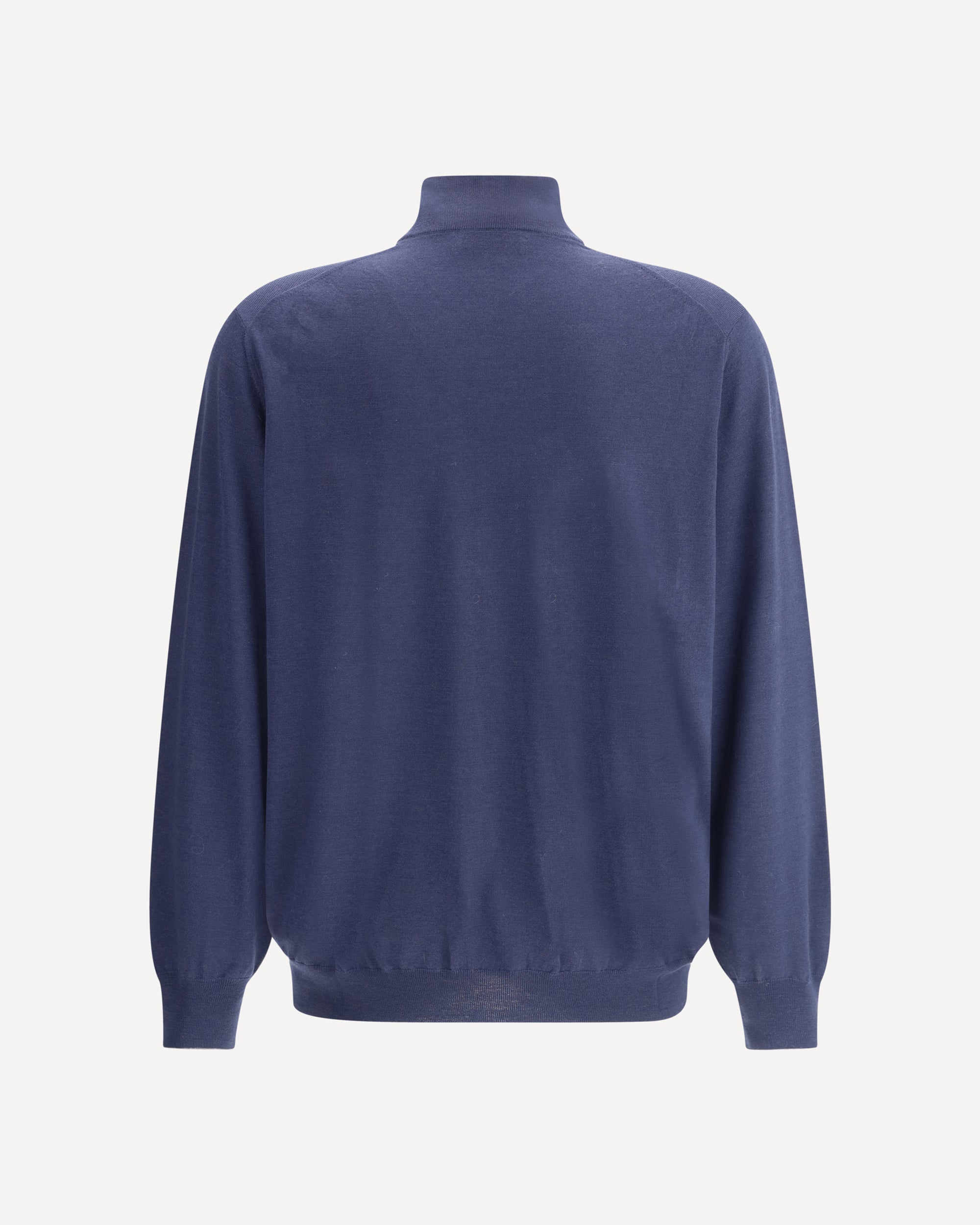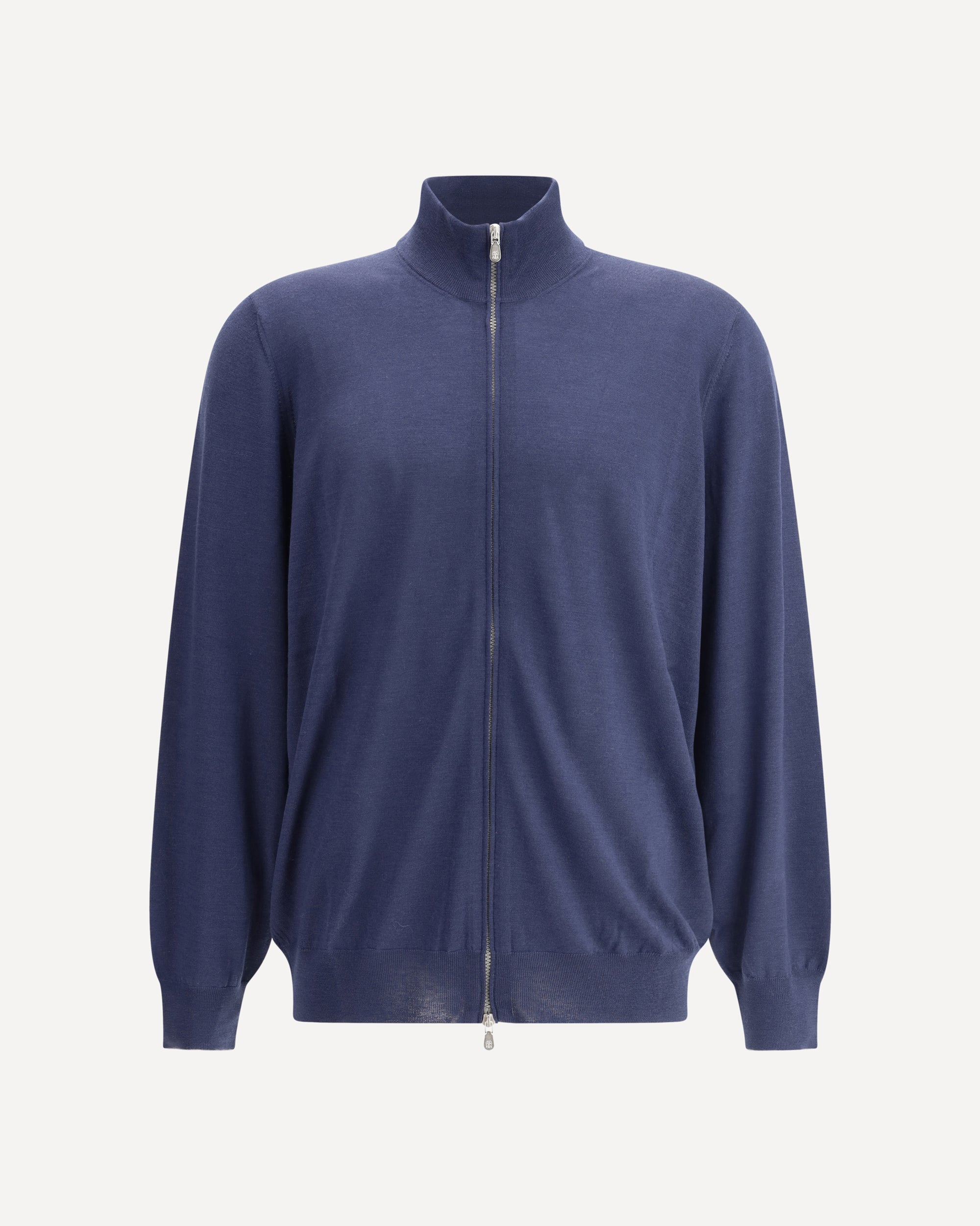 Wool Cardigan by Brunello Cucinelli, featuring a front zipper closure, a ribbed high neck, a ribbed hem, ribbed cuffs, a monochrome design, and a regular fit.