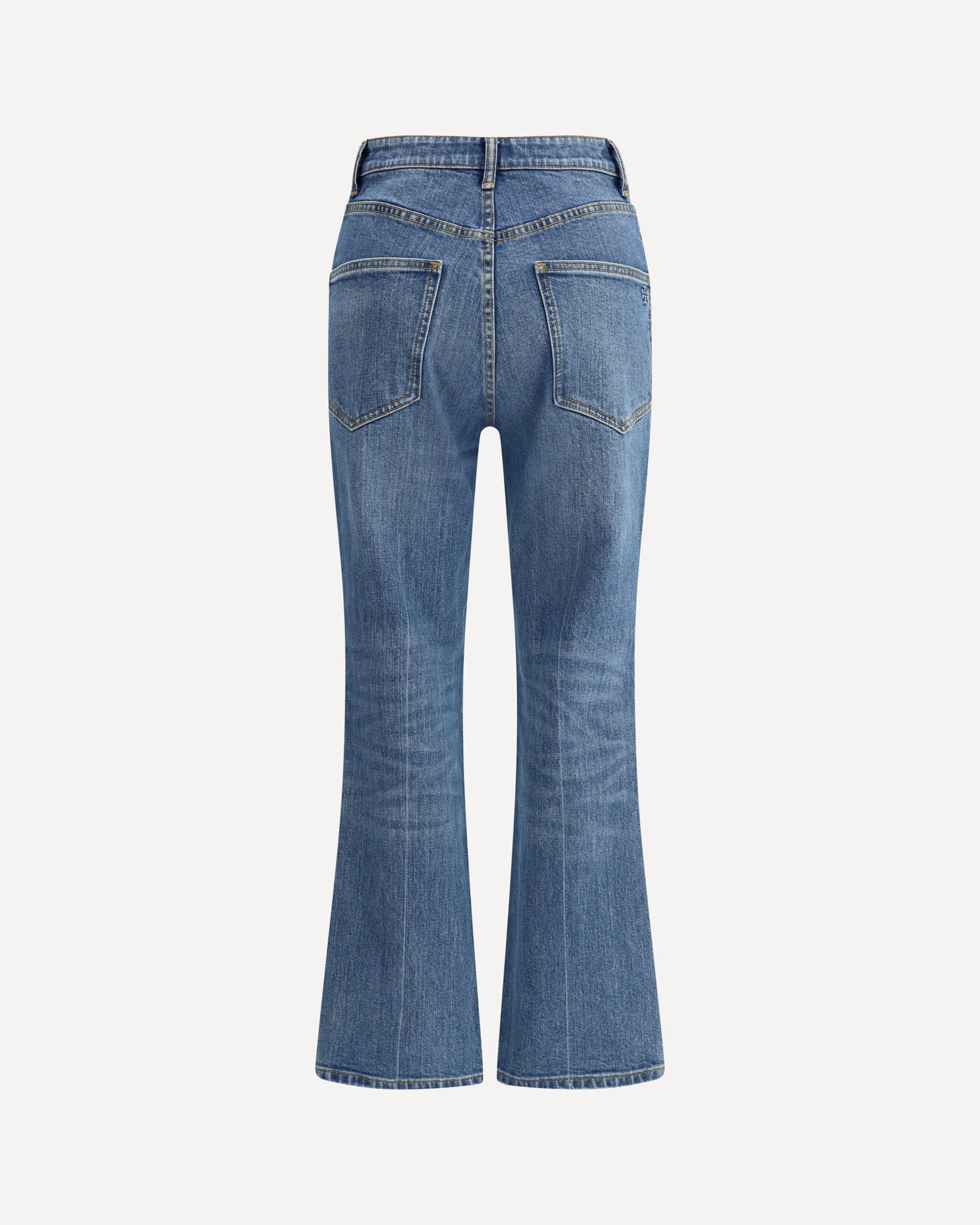 Tory Burch's cropped flare Jeans are an item that blends elegance and comfort with a modern, stylish cut. The five-pocket style is a timeless classic, perfect for any casual occasion, while the front zipper-and-button closure adds practicality and a touch of sophistication. Waistband loops offer the option to further customize the fit with a belt, adding a stylish detail. The flare cut, which gently flares from the thigh to the bottom, and cropped length make these jeans especially versatile, perfect for enhancing a pair of dress shoes or sneakers.