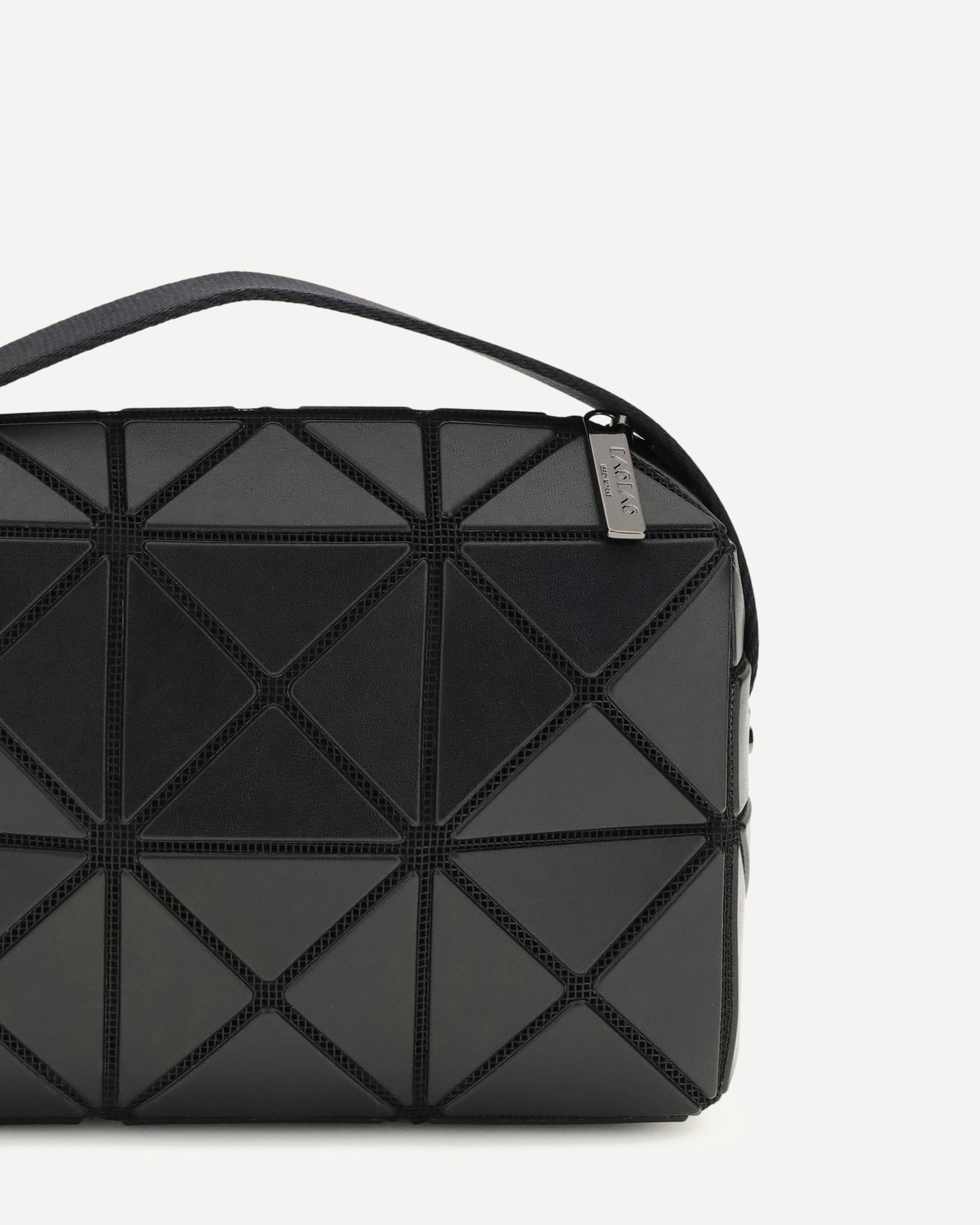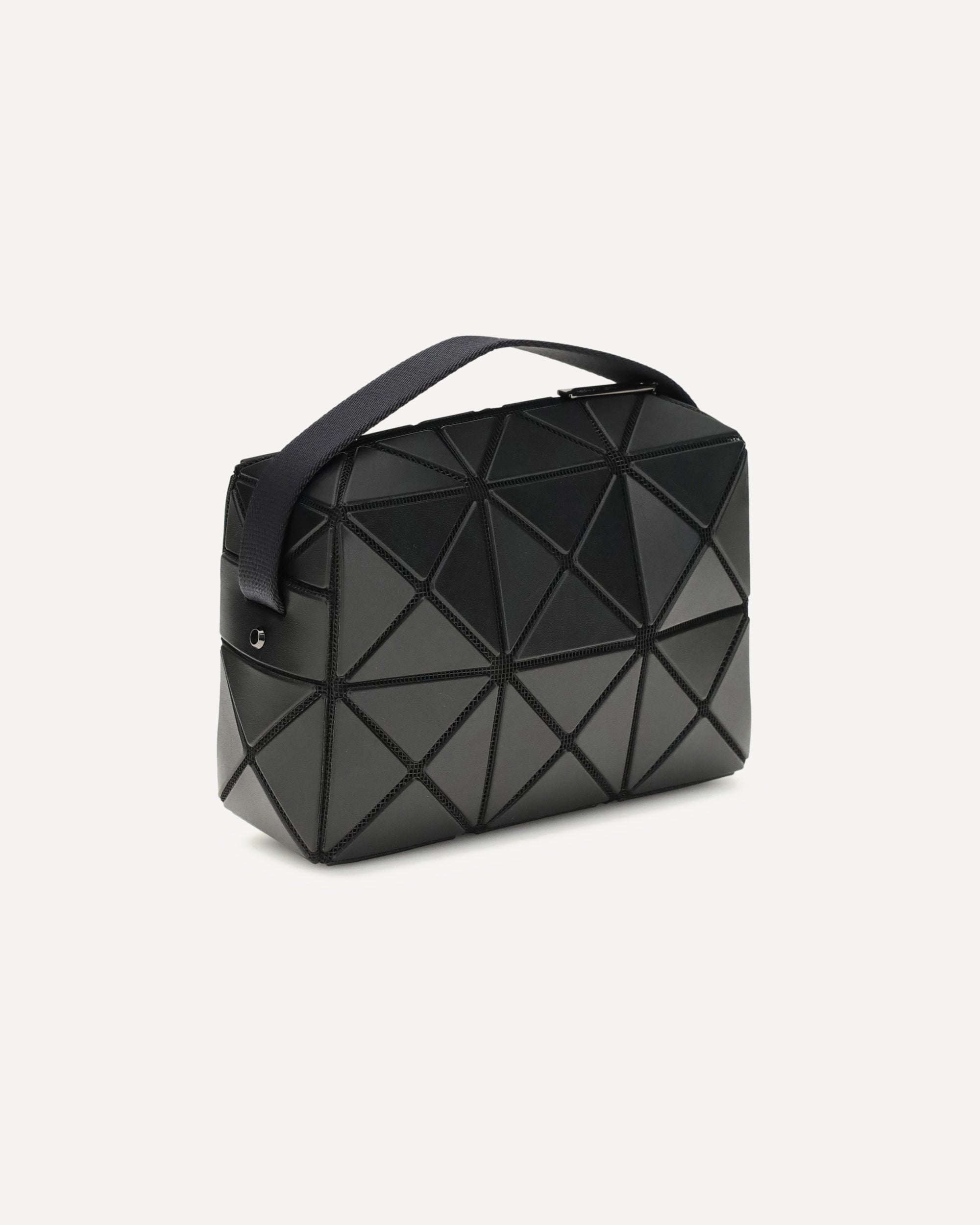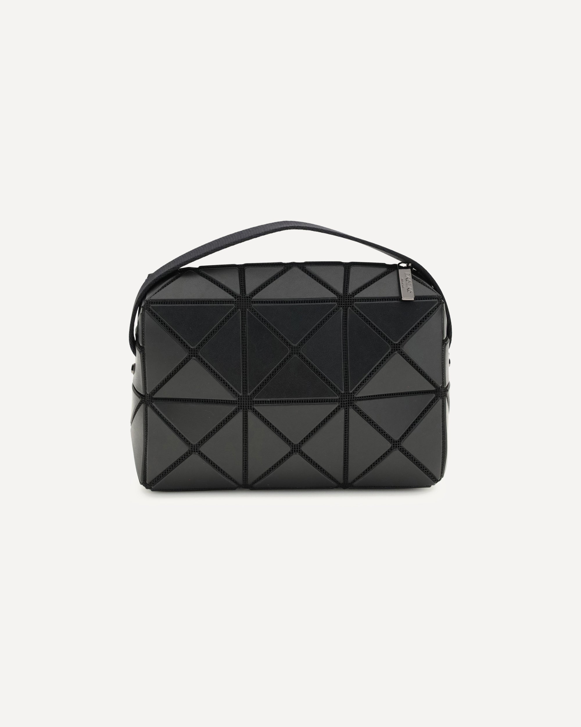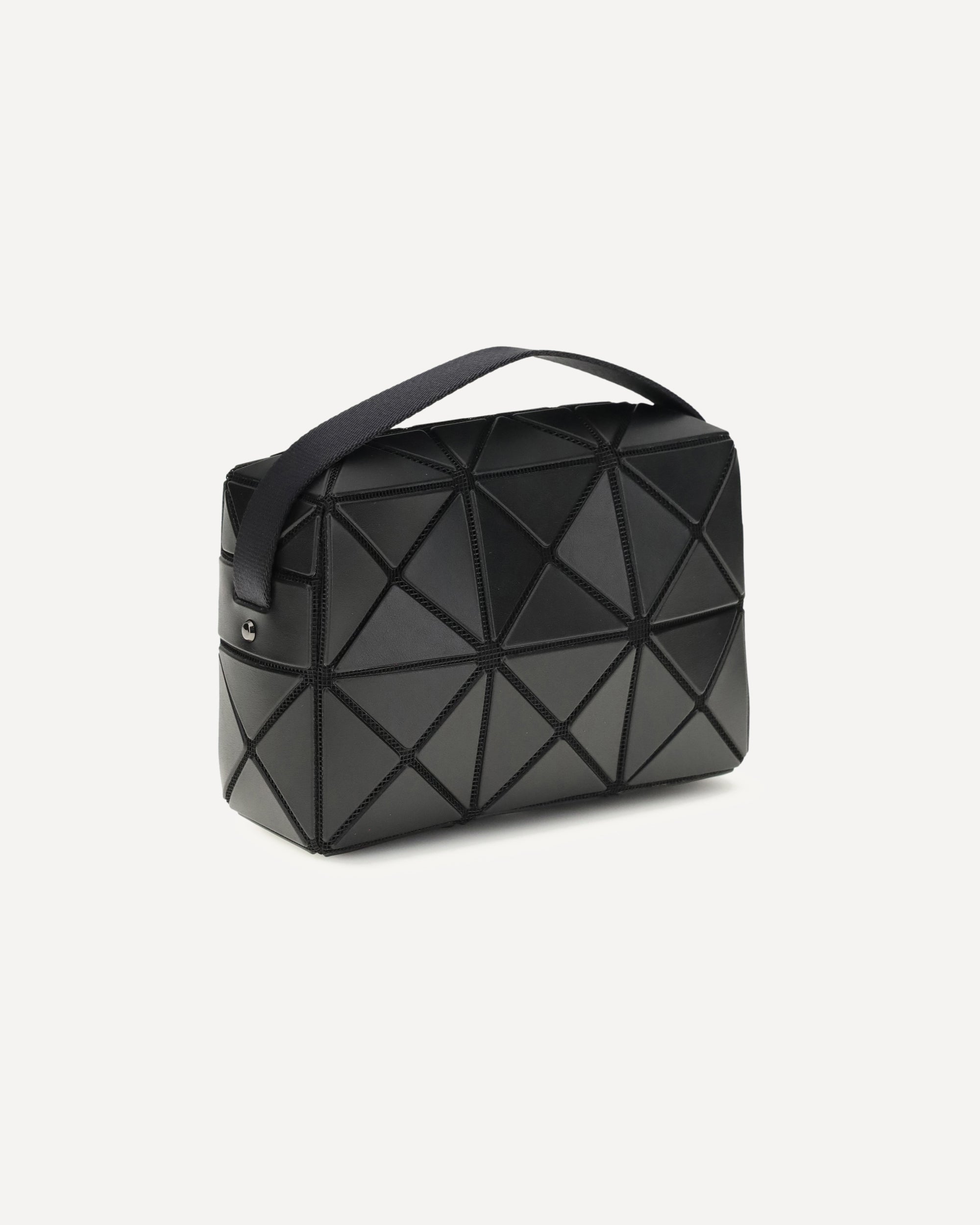 The Cuboid Handbag by Bao Bao is a contemporary design icon, featuring a matte black 3D triangle texture that gives the bag a futuristic, sculptural look. The top handle offers comfortable carry, while the zippered closure provides security and convenience. The interior, lined in jacquard fabric, adds a touch of understated elegance. A sophisticated and original accessory, perfect for those seeking a unique and innovative style.