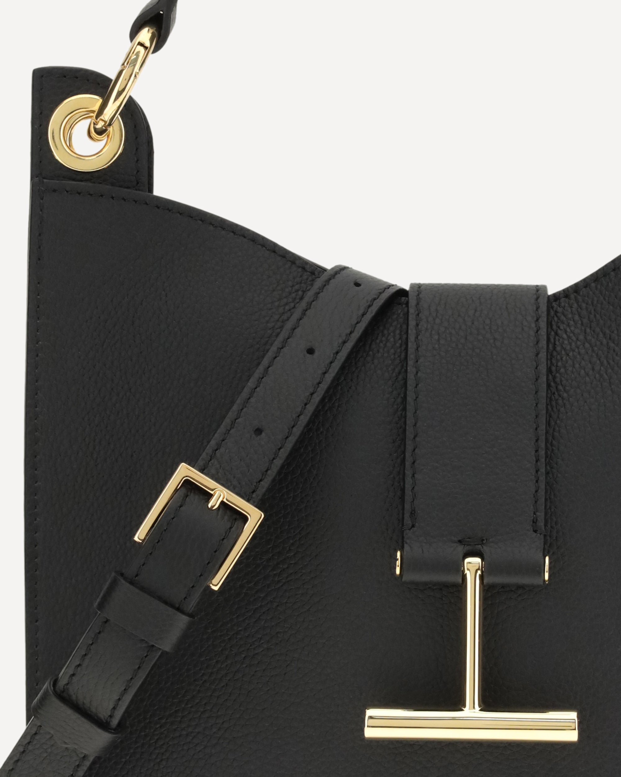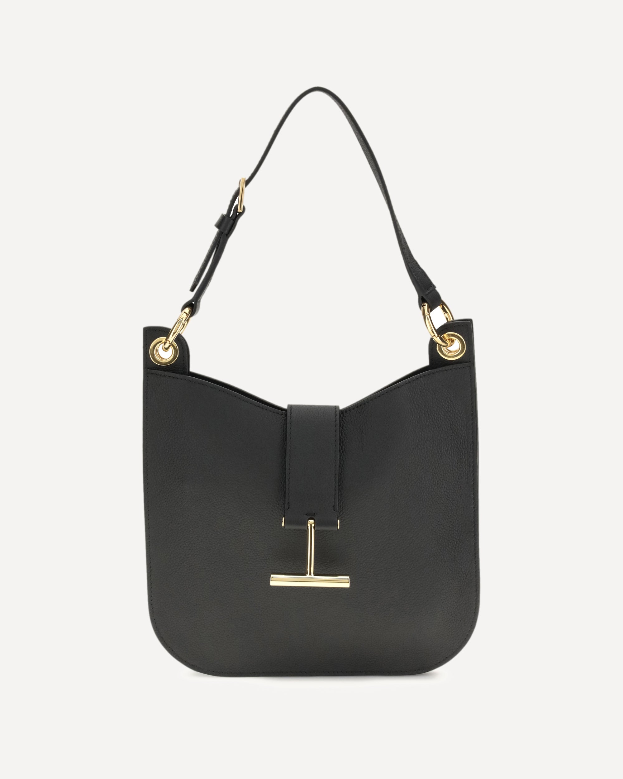 Calfskin Tara Shoulder Bag by Tom Ford, removable top strap adjustable by metal buckle, grained leather design, logo detail on top closure system, magnetic button closure, lined interior, gold-plated metal hardware.