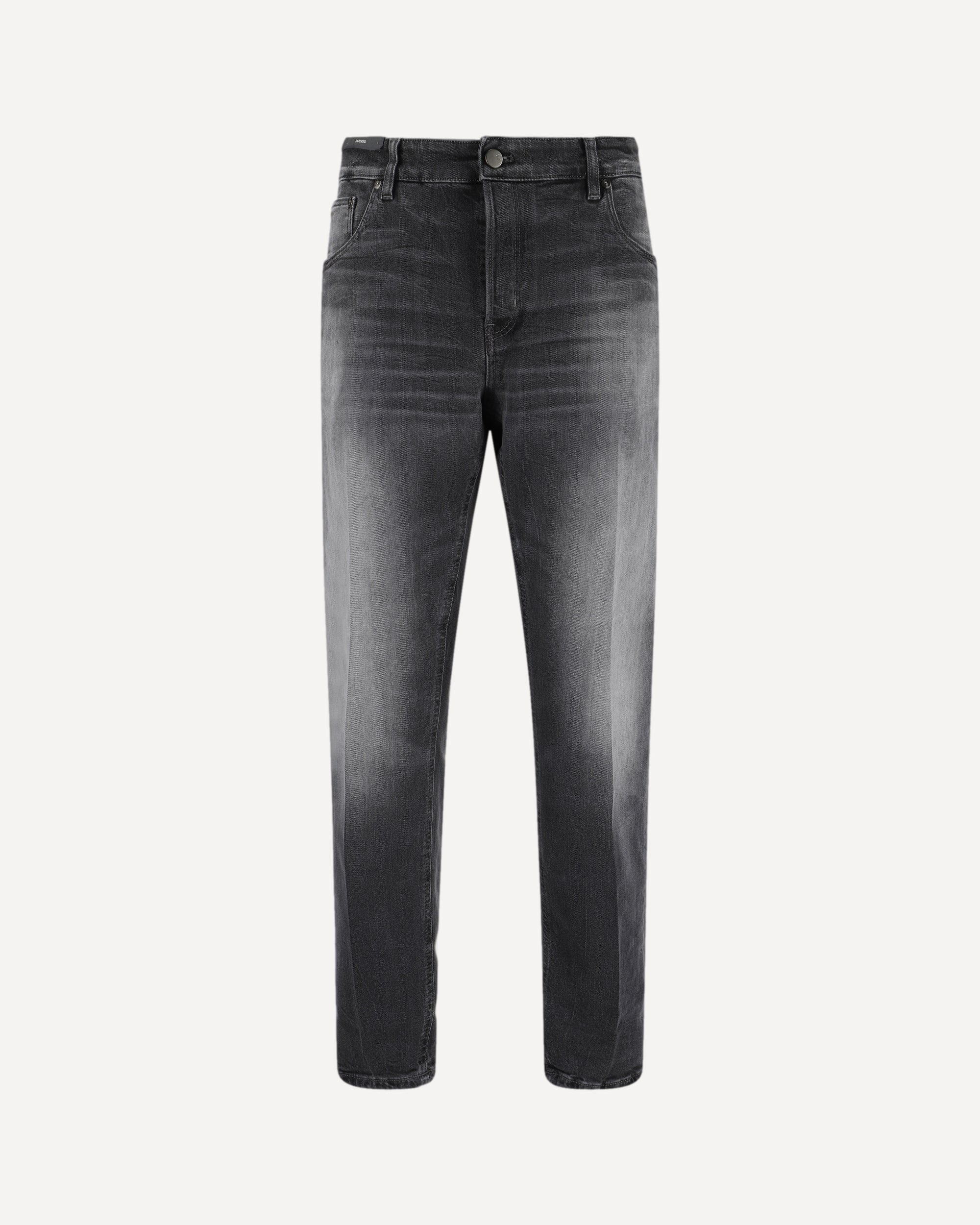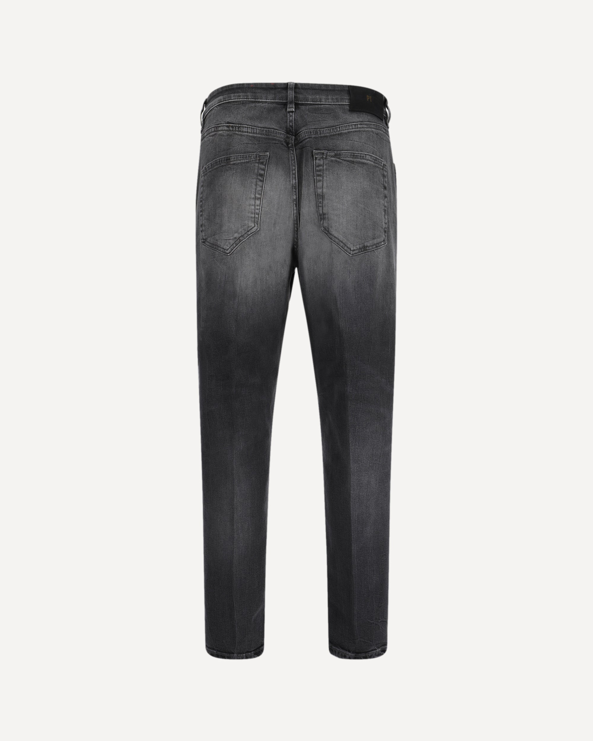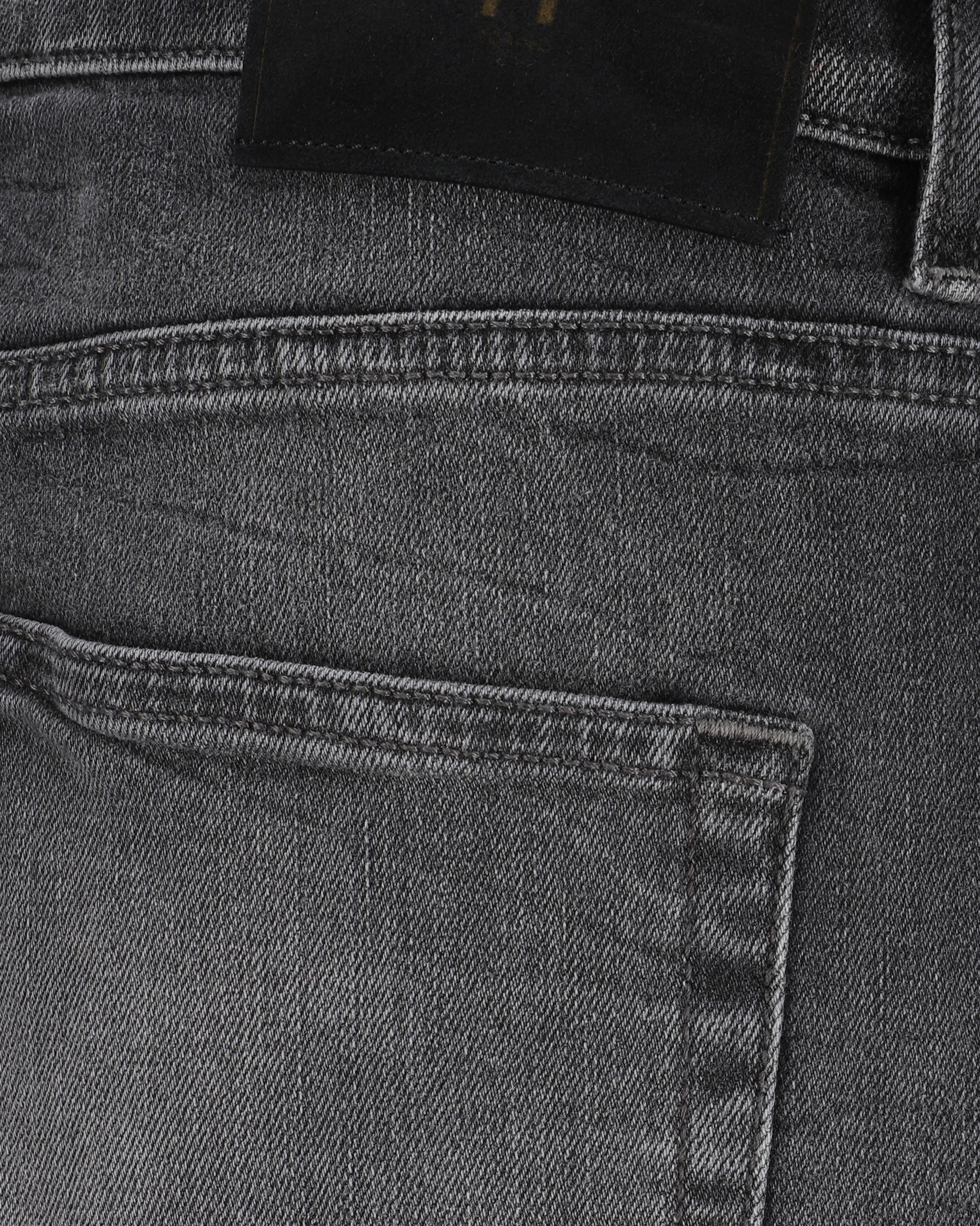 Cotton Denim Pants by Pt Torino, five-pocket design, front button closure, belt loops waistband, iconic leather patch with brand signature pressure-printed applique on back.